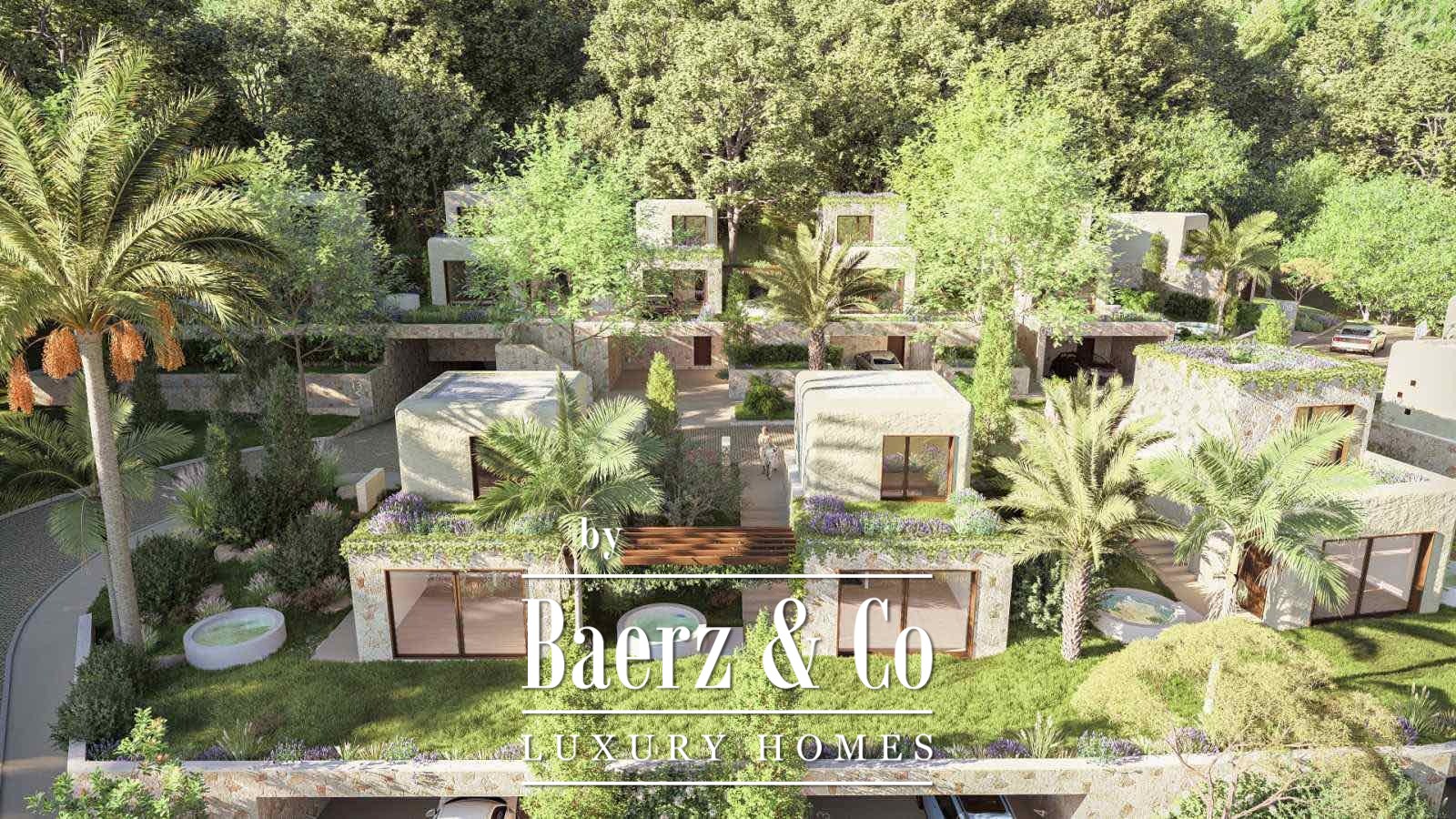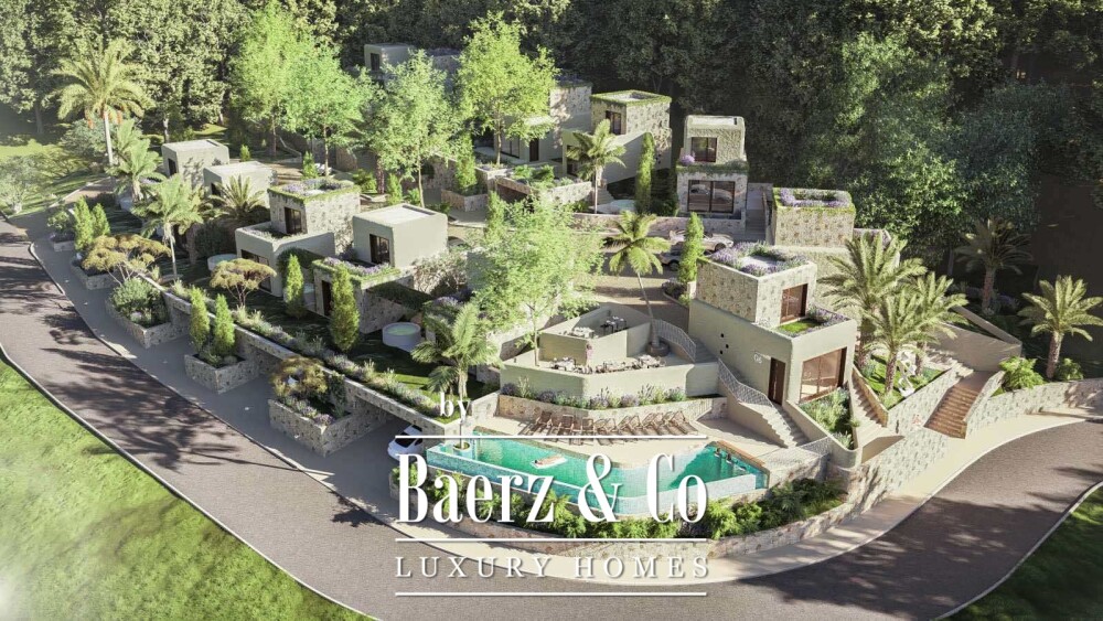 The house’s materials speak to both tradition and modernity, with raised floors and supporting walls crafted in local stone, their round-edged forms lending softness and distinction. Throughout the grounds, olive trees and Mediterranean plants foster a calm, natural environment; green landscaped areas blend seamlessly with paved paths and the communal pool zone, while traditional stone retaining walls define the landscape.