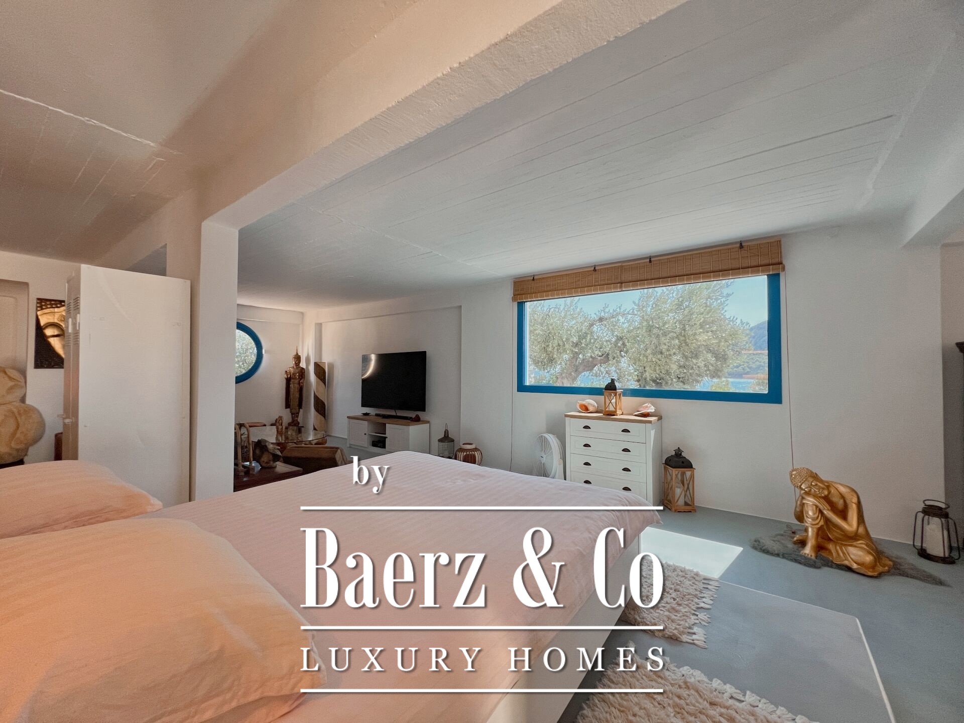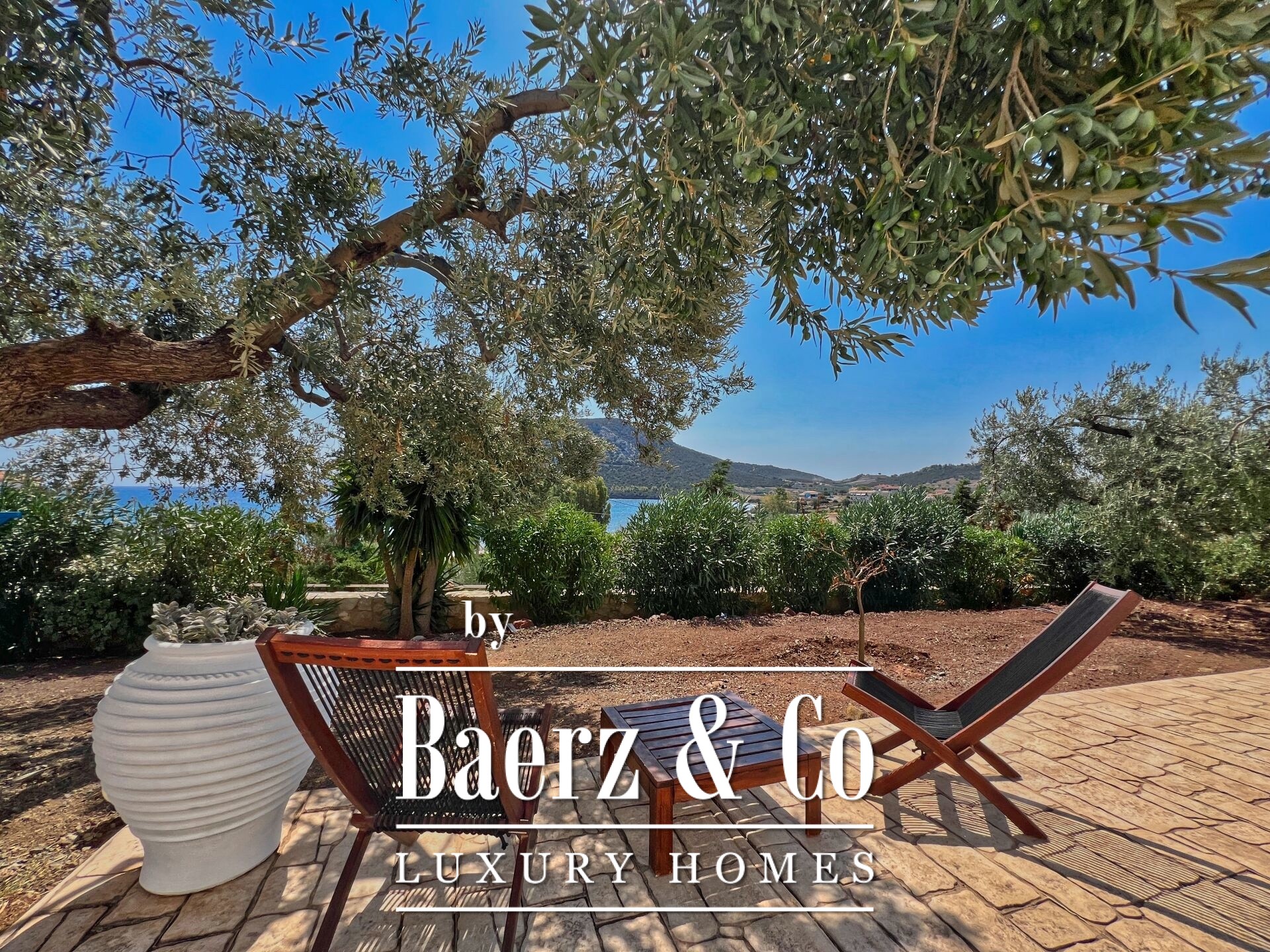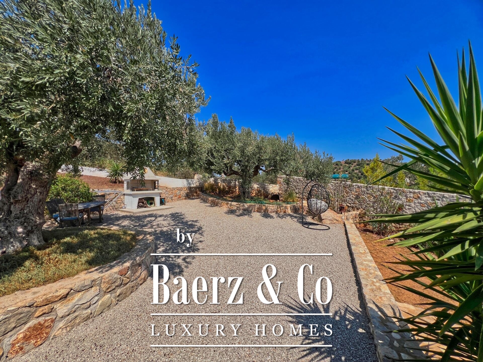 Outdoors, mature olive trees settle the house in its landscape. The expansive garden, designed with automatic irrigation, sits beside a sheltered garage, ample storage, a dedicated barbecue, and space for a future pool. Security features such as security door, CCTV, and alarm complement the villa’s sense of discretion. This property is a rare offering for those seeking a villa Kouverta experience defined by privacy, luxury, and the elemental presence of Aegean light.