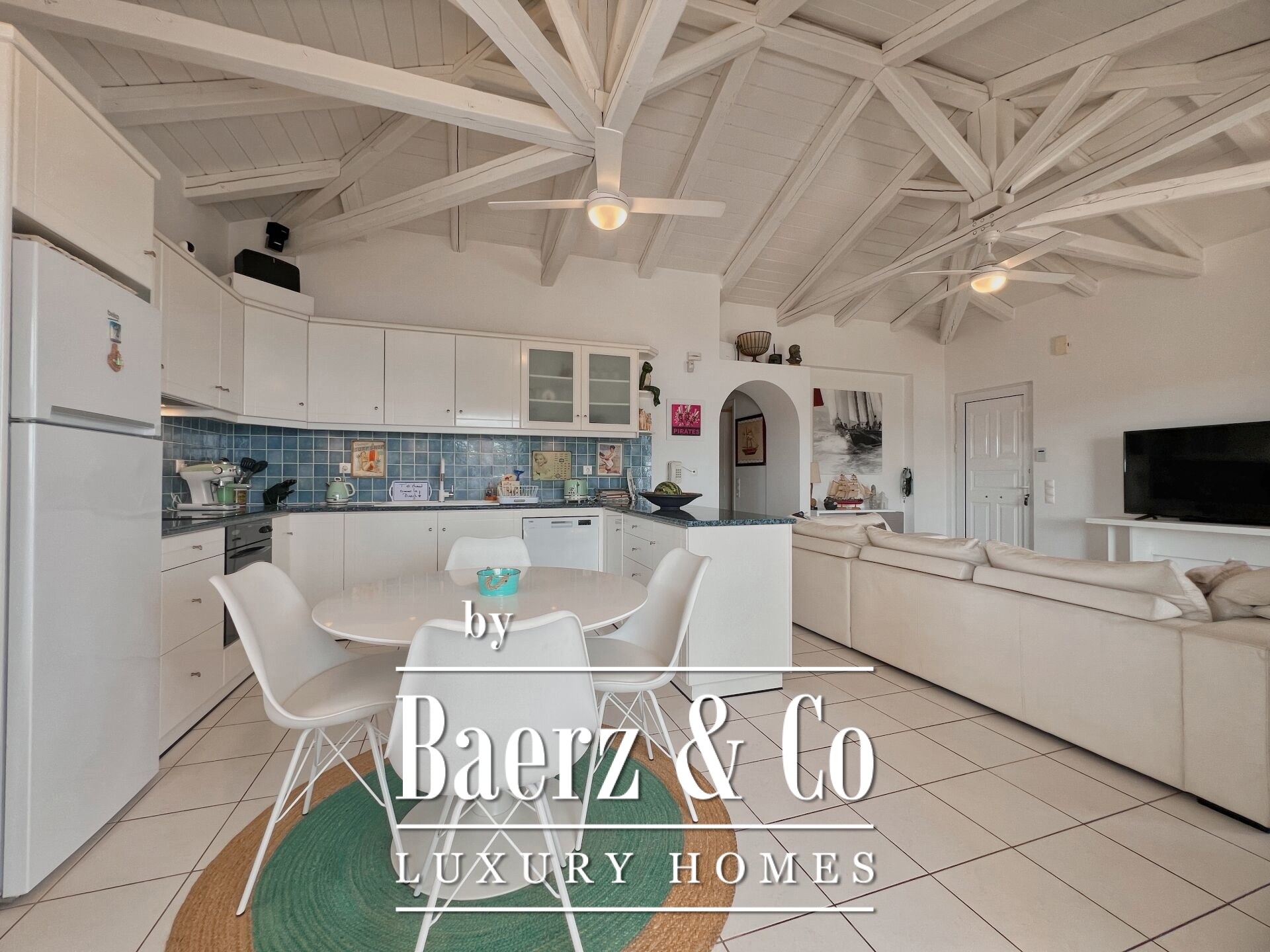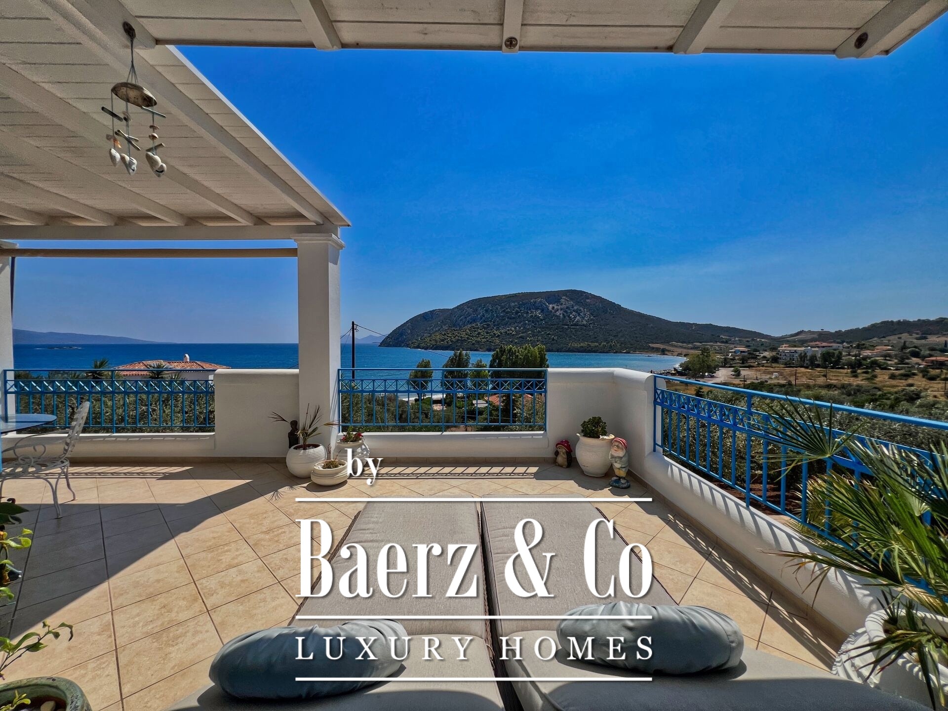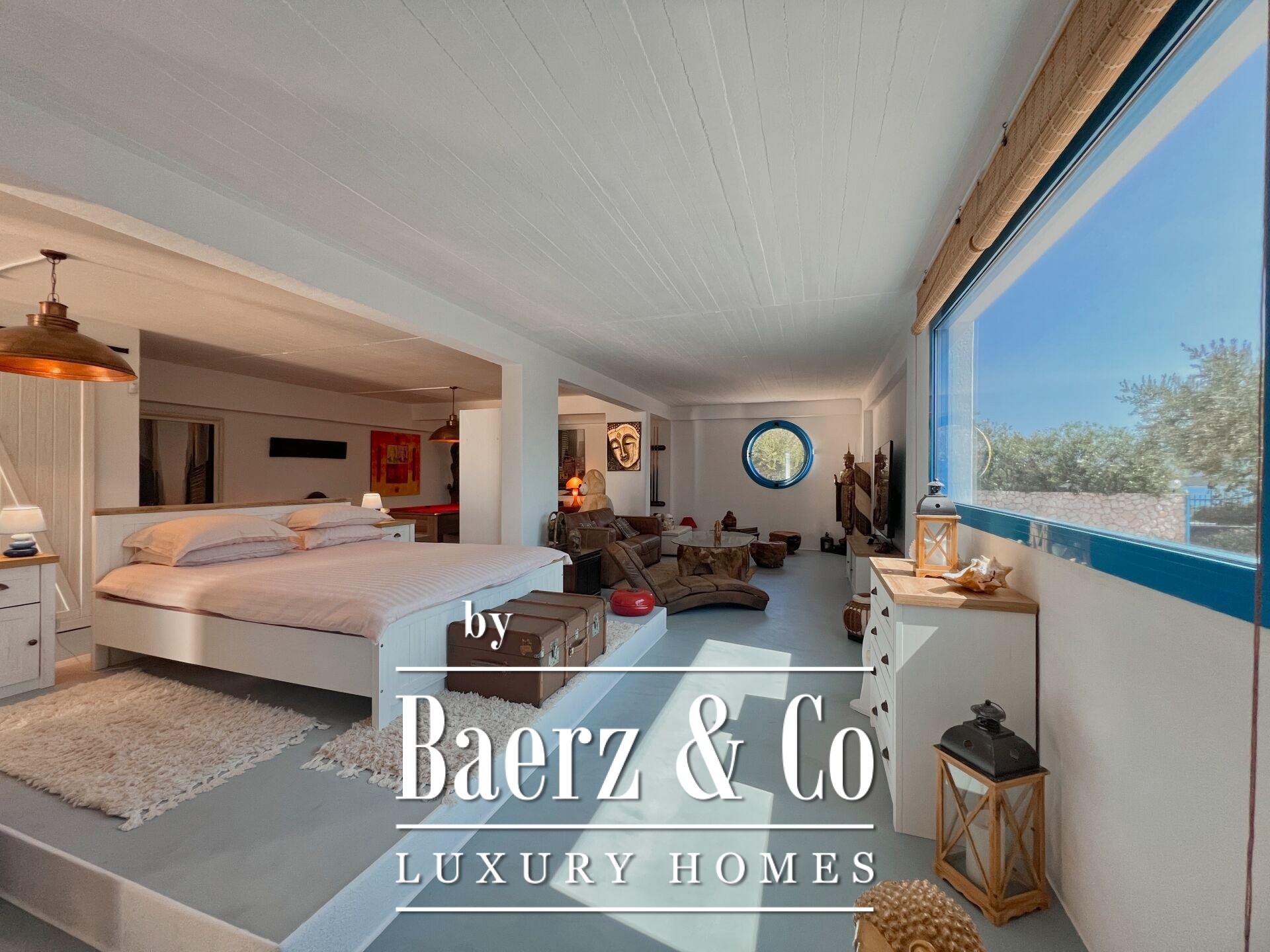 Outdoors, mature olive trees settle the house in its landscape. The expansive garden, designed with automatic irrigation, sits beside a sheltered garage, ample storage, a dedicated barbecue, and space for a future pool. Security features such as security door, CCTV, and alarm complement the villa’s sense of discretion. This property is a rare offering for those seeking a villa Kouverta experience defined by privacy, luxury, and the elemental presence of Aegean light.