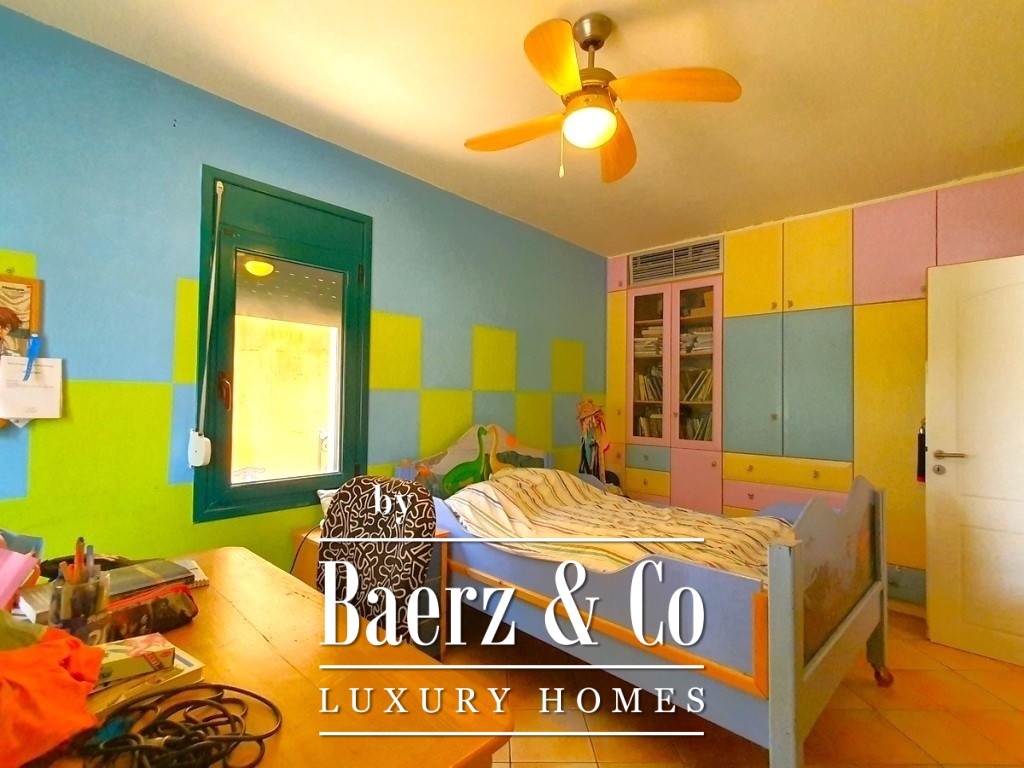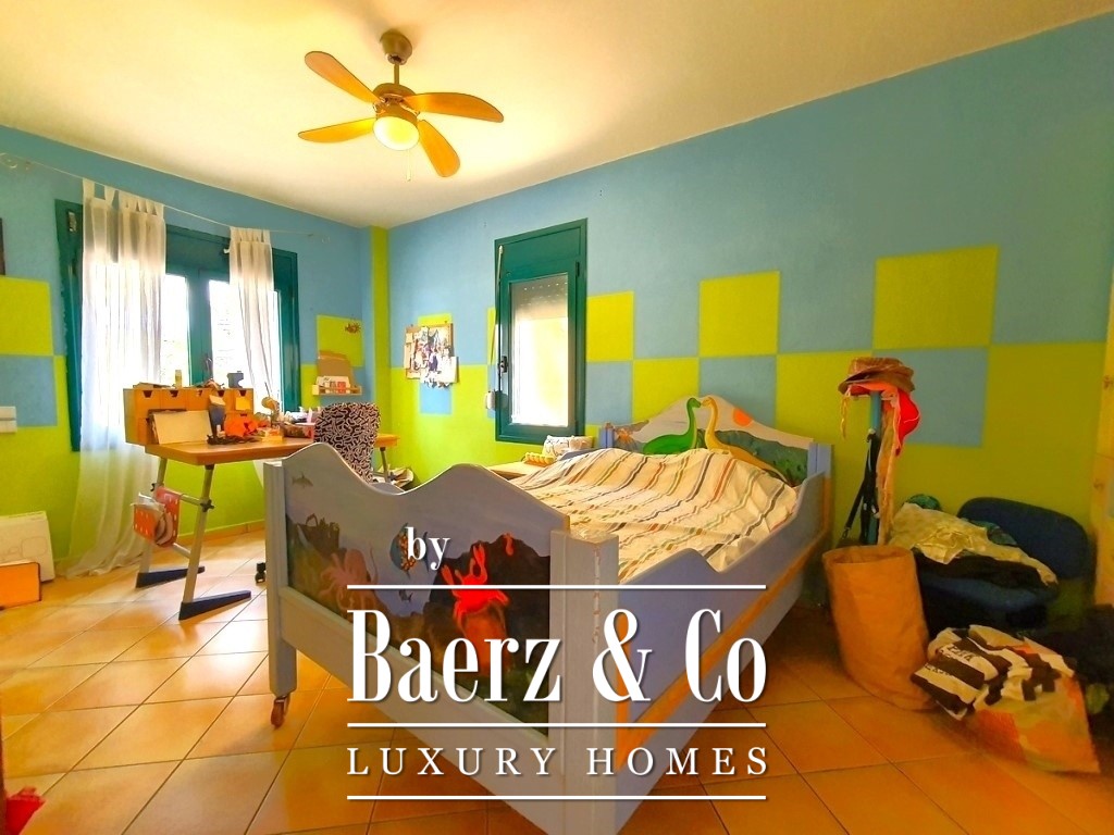 The walled and illuminated garden is sculpted with conifers and paved paths, housing a 60 m² swimming pool with varied depths, a jacuzzi, and a covered pool bar. Multiple outdoor experiences are layered through the BBQ pavilion, shaped with natural wood and sliding glass, and a covered garage for two cars with ample storage. The scene is completed by views over the garden to the port of Koilada, all within easy reach of the coastline and the soon-to-be-completed 18-hole golf course. This villa for sale in Koilada is marked by architectural discipline, rare privacy, and a landscape that balances serenity with connection to the region’s evolving social rhythm.