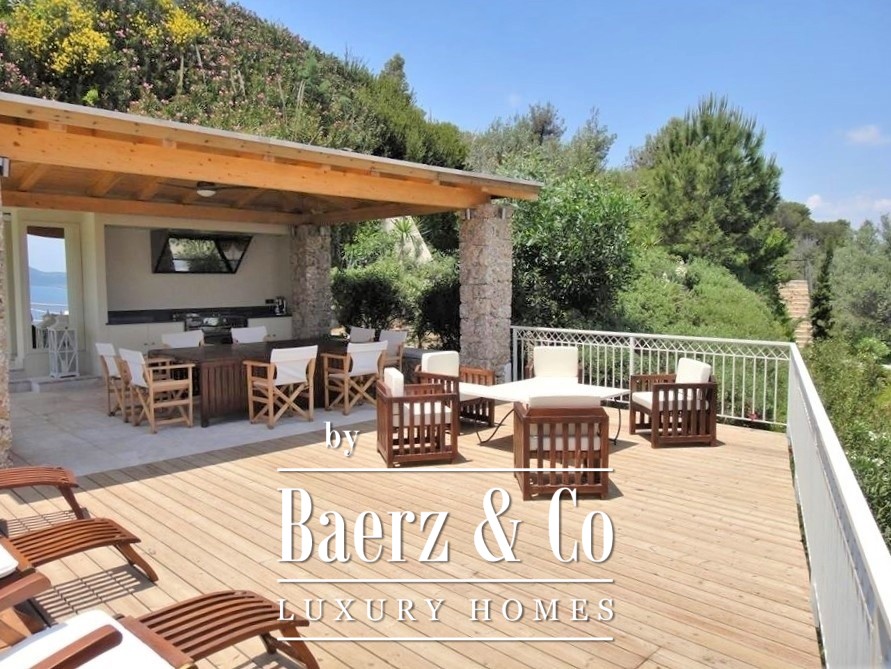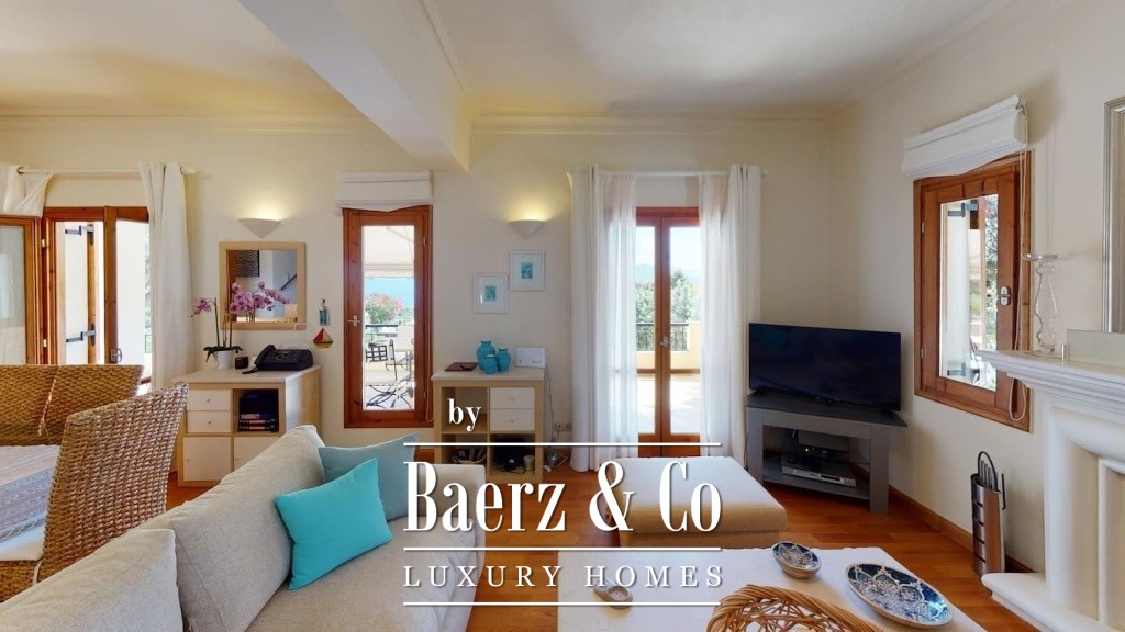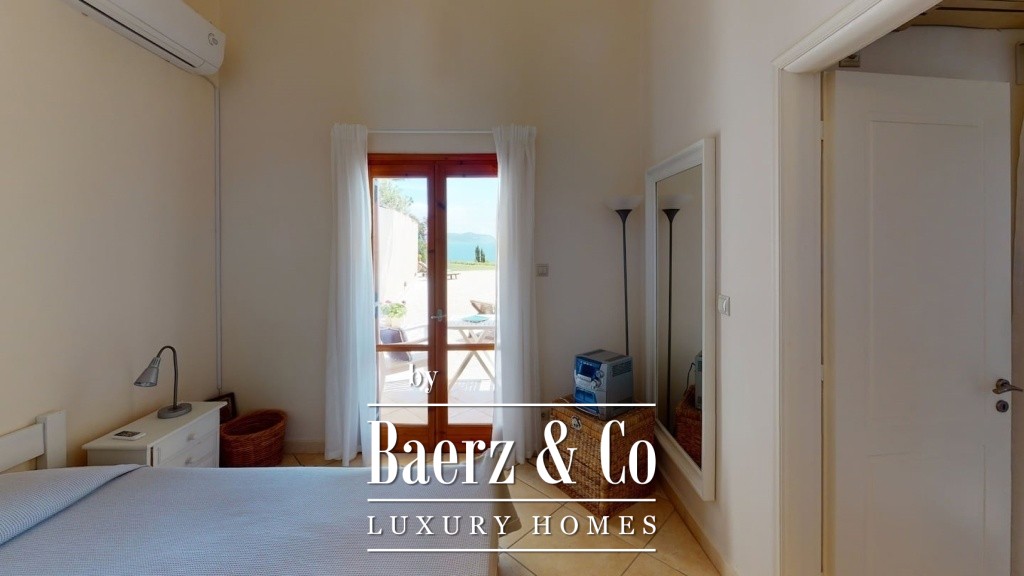Materials include double-glazed insulating windows, autonomous oil heating, solar water system, and full air conditioning, alongside a fireplace that anchors the living space. The property featuress an integrated security alarm, backup power generator, and is offered fully furnished. The landscaped garden, sheltered B.B.Q. and dining pavilion, covered parking, water drilling, and an outdoor shower reflect a commitment to ease and comfort. Villa Kounoupi for sale promises relaxed Mediterranean living with a focus on enduring quality and natural beauty.