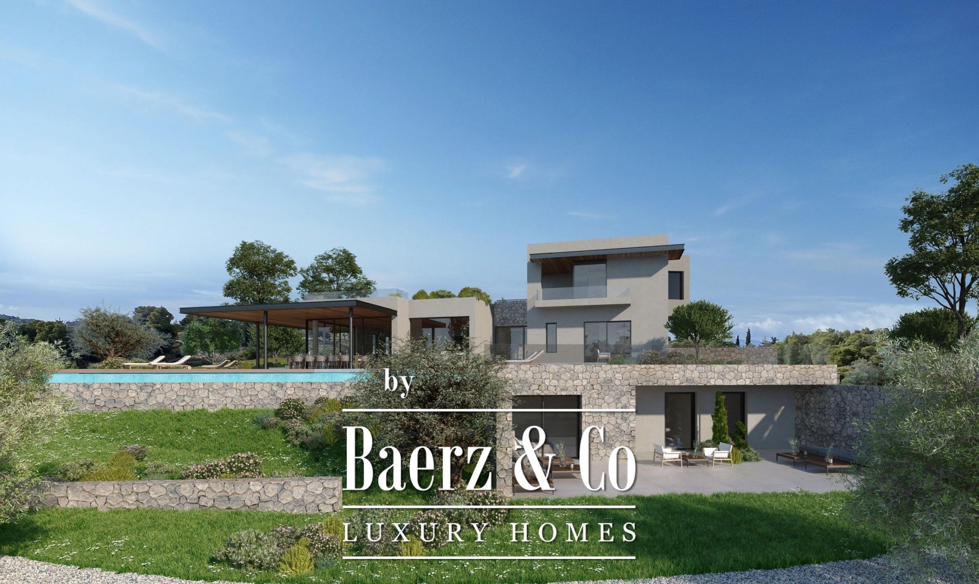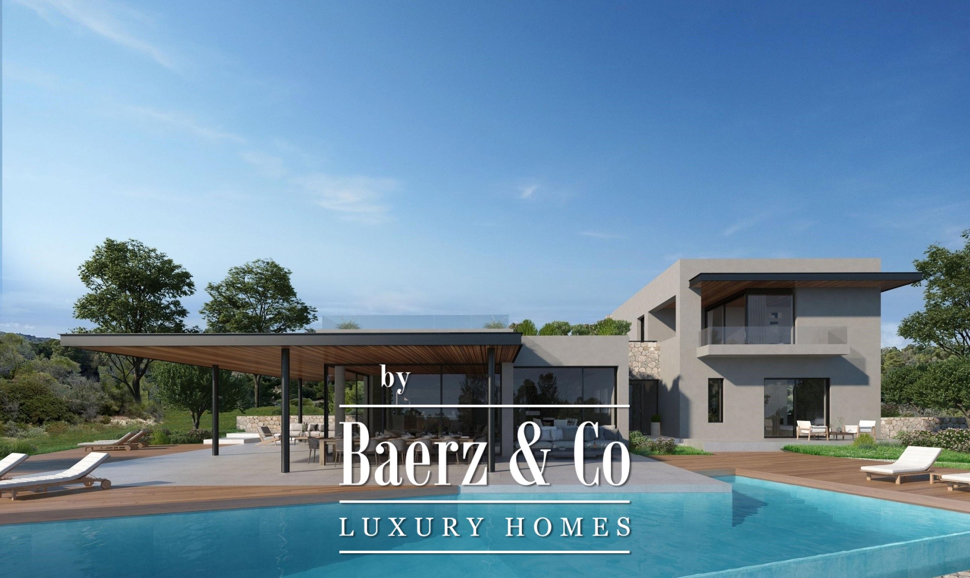 The underground level provides six en suite guest bedrooms, a wellness area with massage and sauna, dressing and storage rooms, all with direct access outdoors. The landscape is shaped by a 100 m² swimming pool, refined stonework, pergolas, and carefully planted gardens, while parking accommodates three covered cars.