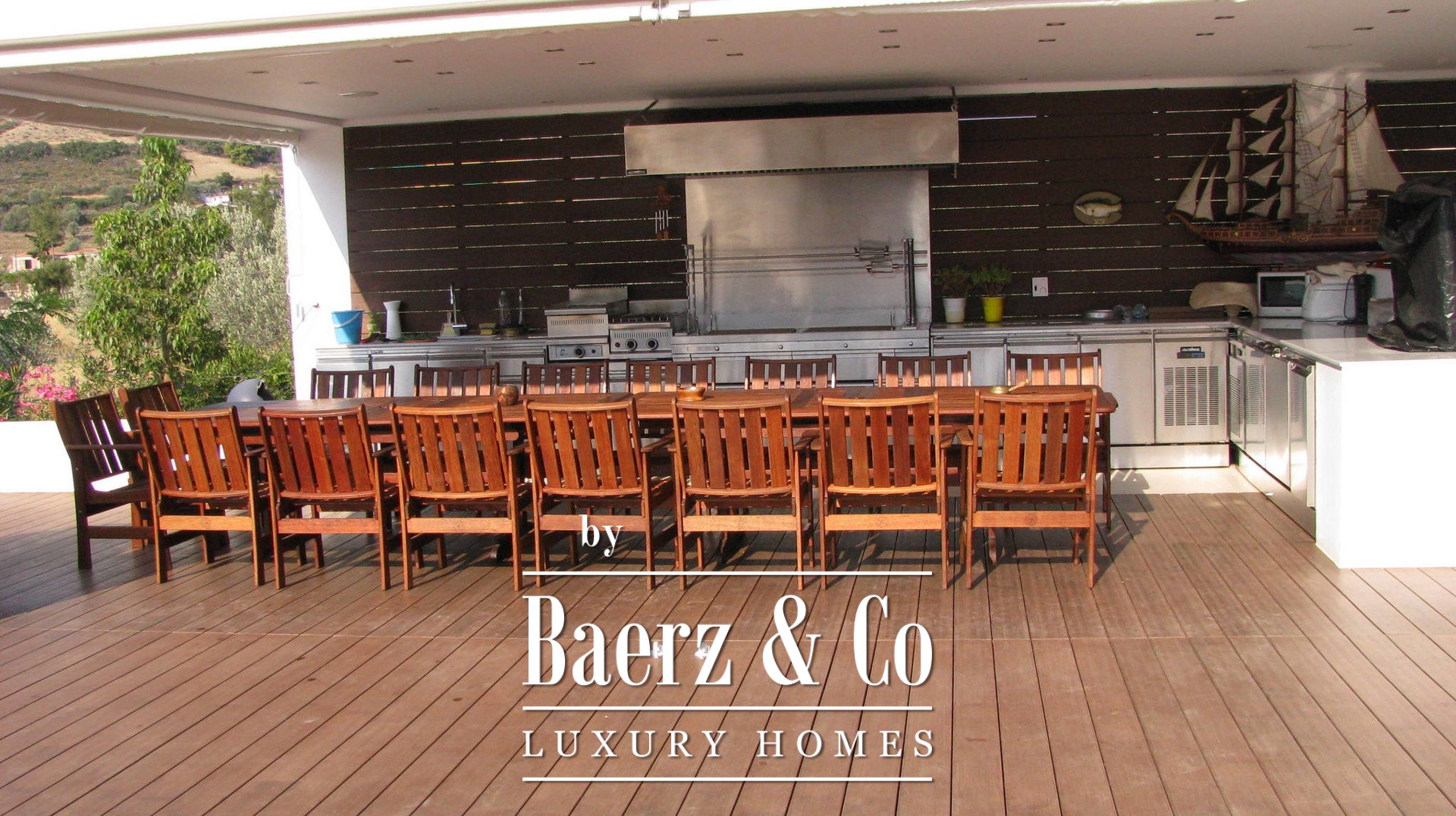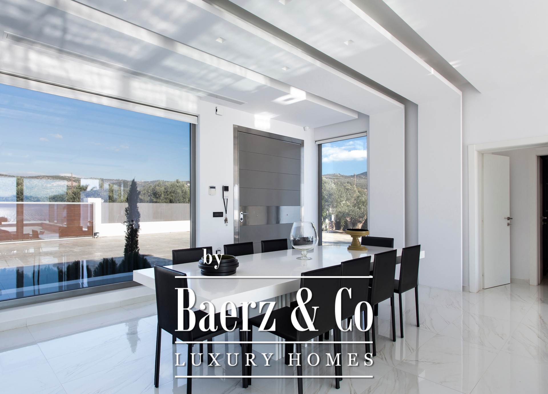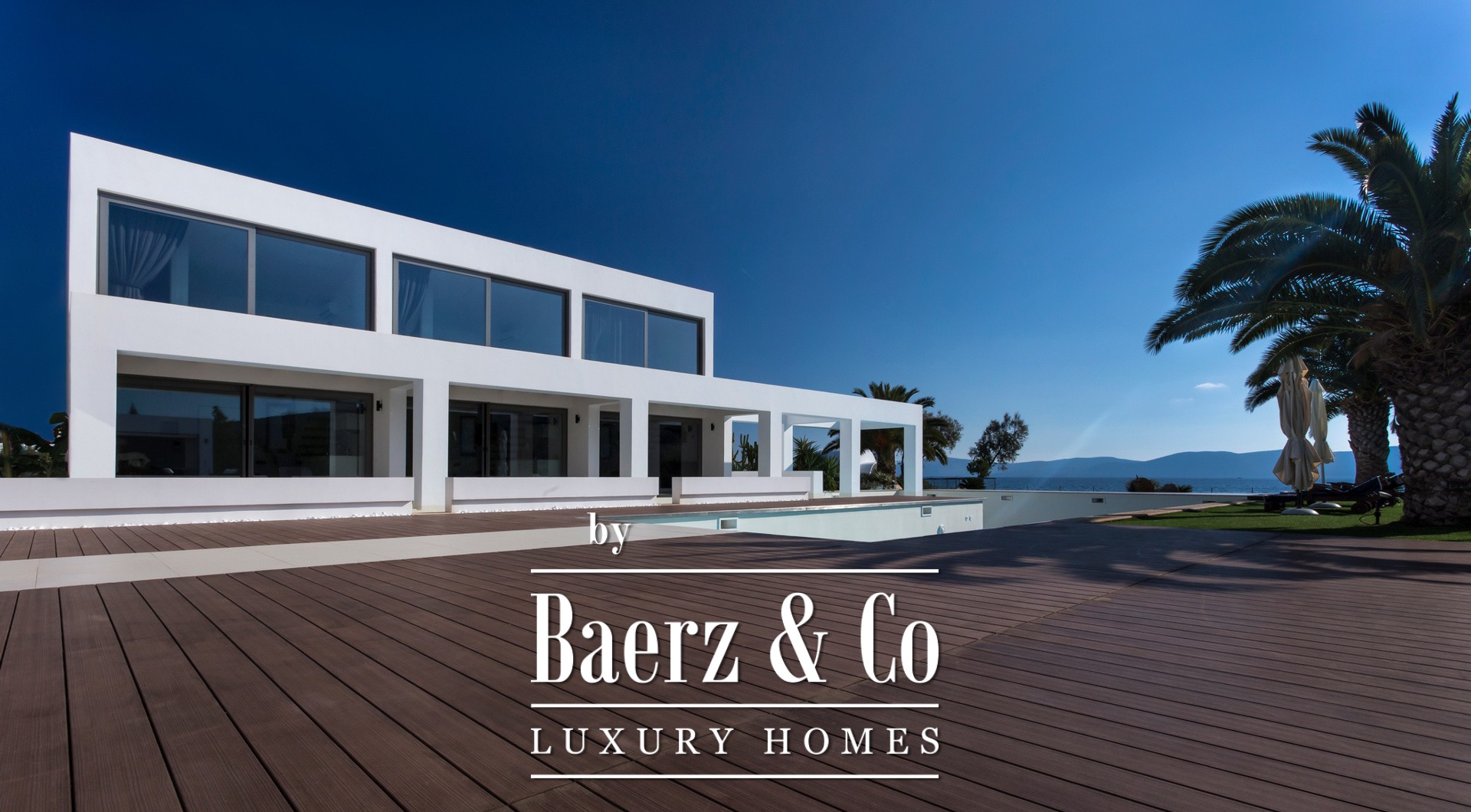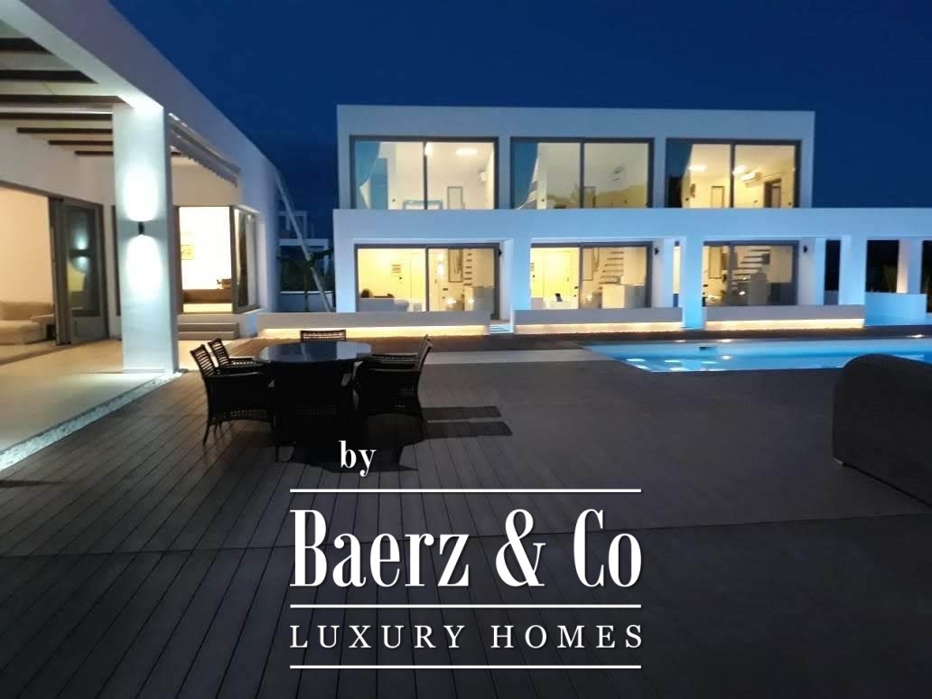 Natural light filters through double-glazed windows, illuminating interiors with a gentle clarity. The living areas maintain a disciplined simplicity that enhances the sense of peace and spaciousness. Outside, a 5,000 m² landscaped plot embraces a large swimming pool, wooden deck, areas dedicated to outdoor dining and living, and a thoughtfully designed zone for sun loungers. Sea views provide an ever-present backdrop, while a sheltered barbeque and designated parking add further practicality.