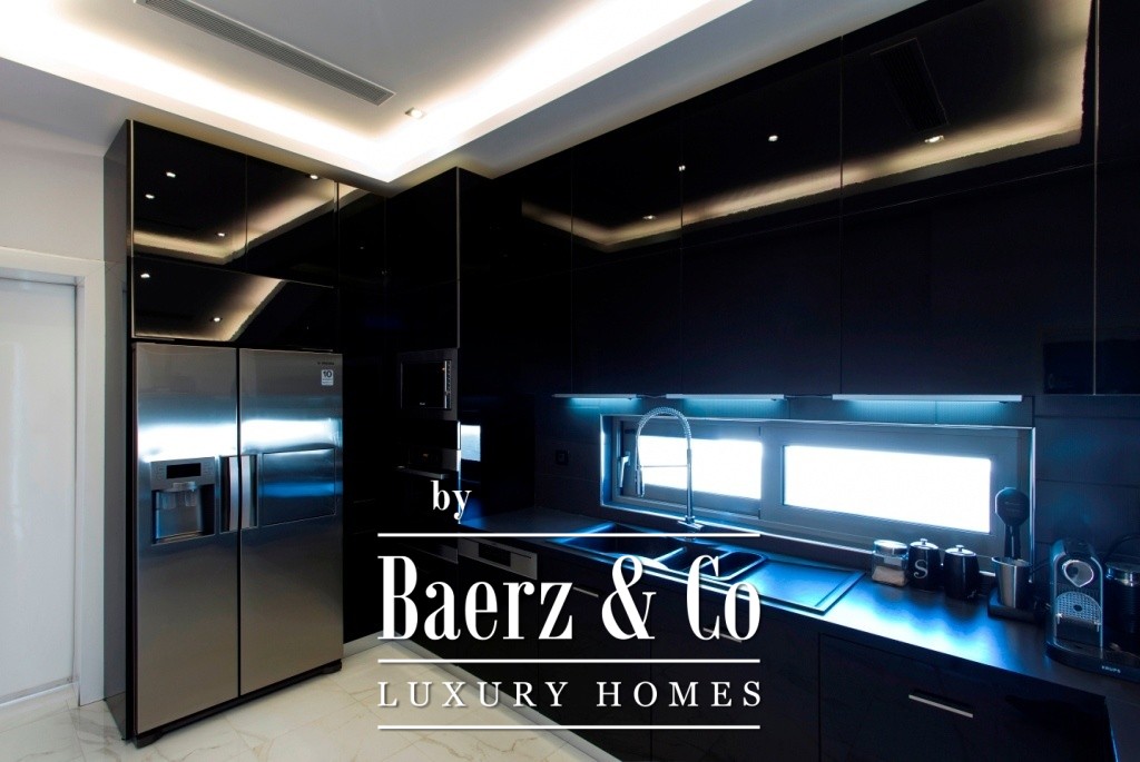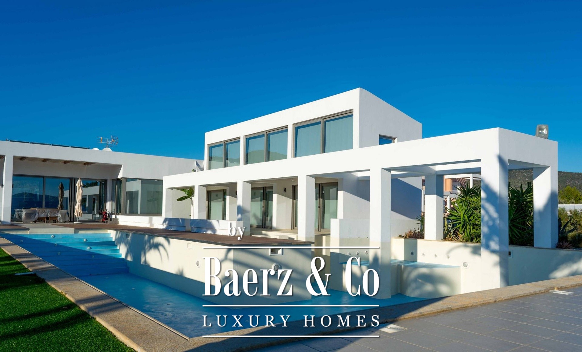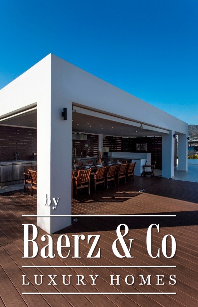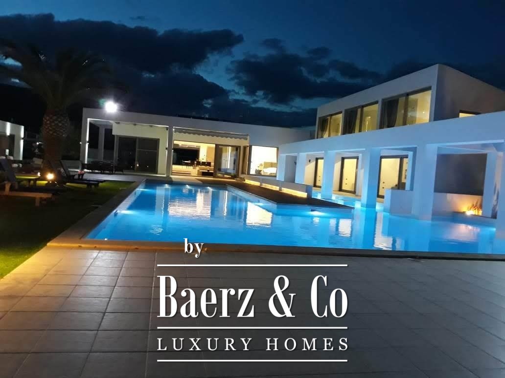 Natural light filters through double-glazed windows, illuminating interiors with a gentle clarity. The living areas maintain a disciplined simplicity that enhances the sense of peace and spaciousness. Outside, a 5,000 m² landscaped plot embraces a large swimming pool, wooden deck, areas dedicated to outdoor dining and living, and a thoughtfully designed zone for sun loungers. Sea views provide an ever-present backdrop, while a sheltered barbeque and designated parking add further practicality.