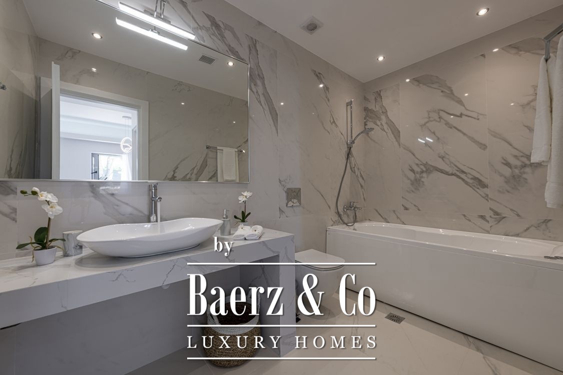 The villa’s layout unfolds with a luminous living room anchored by a fireplace and framed by uninterrupted panoramic views of Porto Cheli Town. An adjacent dining area and a fully appointed kitchen create an intuitive flow for daily life and entertaining. The master suite includes generous wardrobe space, an en suite bathroom with hot tub, and direct access to a wide veranda merging seamlessly with the pool terrace. Three additional bedroom suites, each with en suite bathroom and private patio, ensure privacy and comfort for residents and guests. An independent guest house with its own entrance offers further seclusion.
