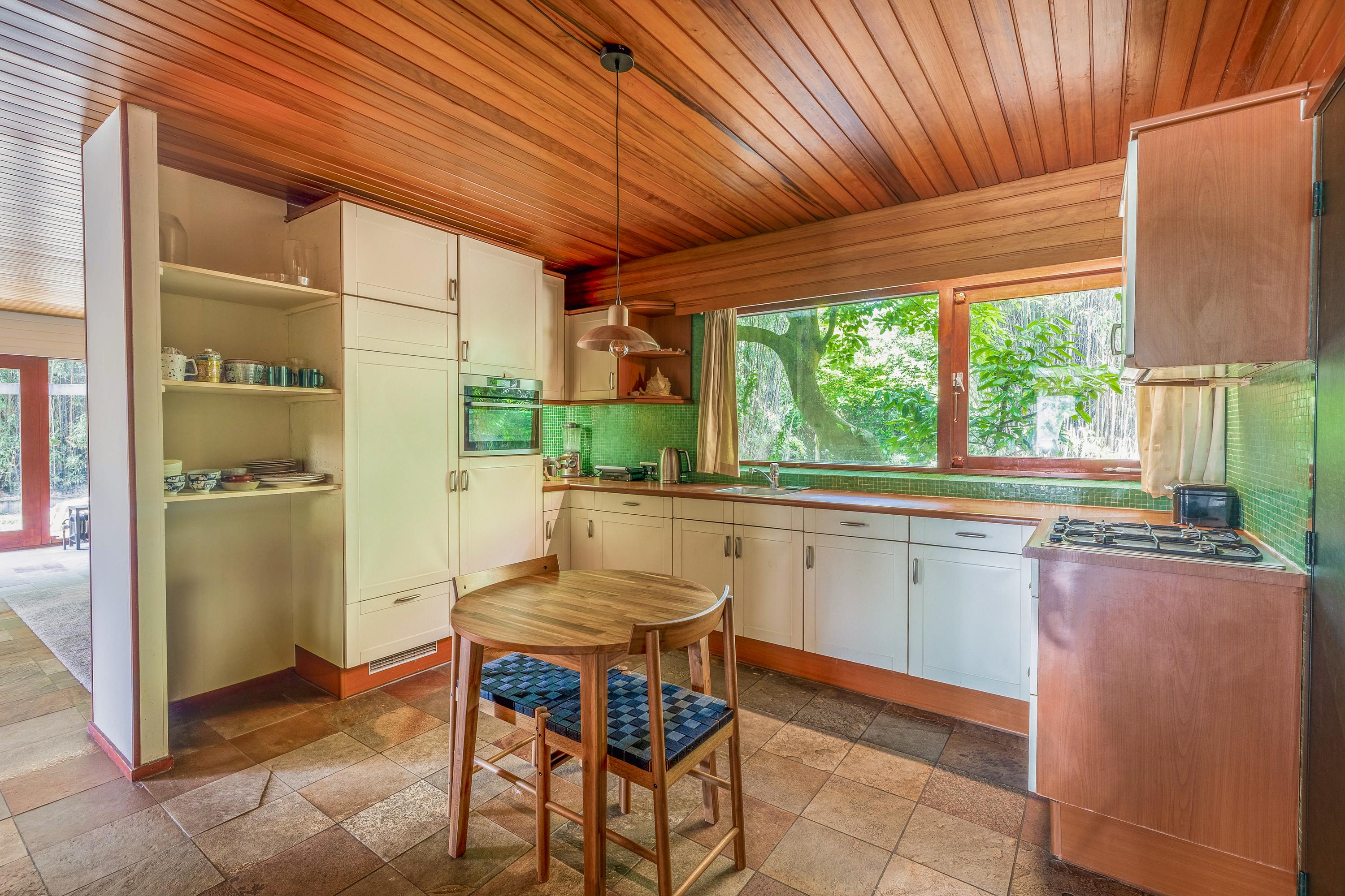 Inside, you’ll find a spacious, garden-oriented living room with large windows that bring in lots of light and offer views of the surrounding greenery. The warm atmosphere and generous layout provide plenty of options for different interior arrangements to suit your personal living style. The adjacent open-plan kitchen is roomy and forms the heart of the home.