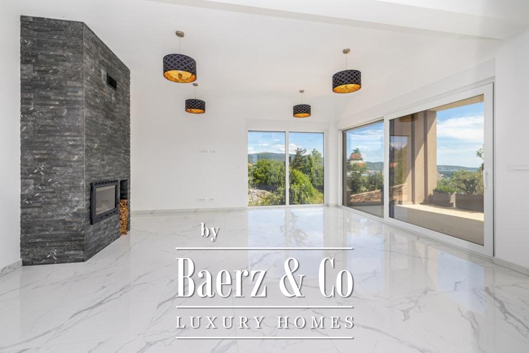 Villa Krk is a modern sea view villa offering 200 m² of contemporary living on the island of Krk. This villa Krk blends sophisticated design with practical comforts, set within a 611 m² landscaped and fenced garden overlooking the Adriatic. Crisp architectural lines and a flat roof define the exterior, while inside, the atmosphere is established by an open-concept living area with an elegant fireplace, kitchen, and dining space that flow directly to a generous terrace.