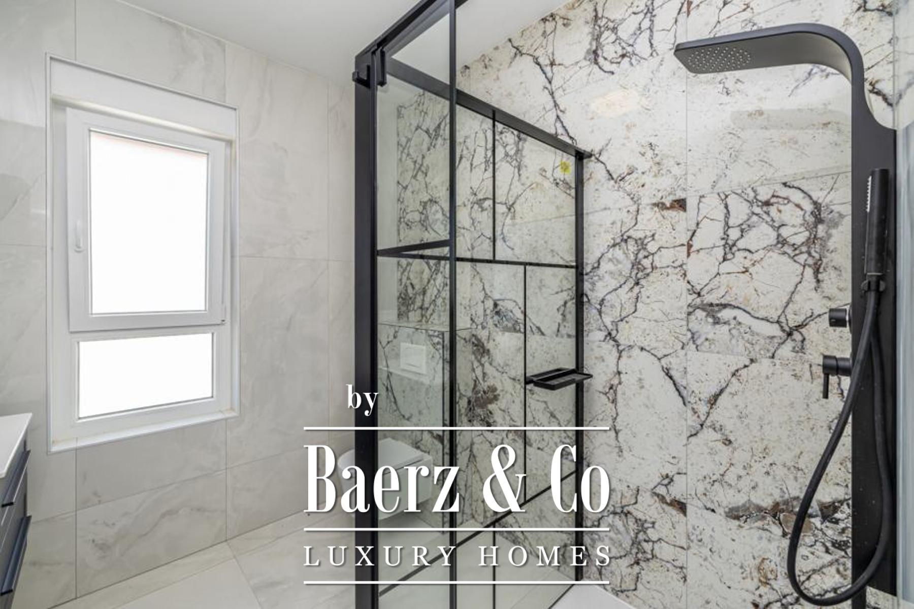On the ground floor, a wellness suite includes a sauna and bathroom, with an adjacent guest toilet, entrance hallway, and a dedicated storage room. The upper level hosts four spacious bedrooms, each with a private en-suite bathroom and their own balcony or terrace, ensuring privacy. Underfloor heating in every bathroom brings seasonal comfort, while a separate laundry room serves the upper floor.