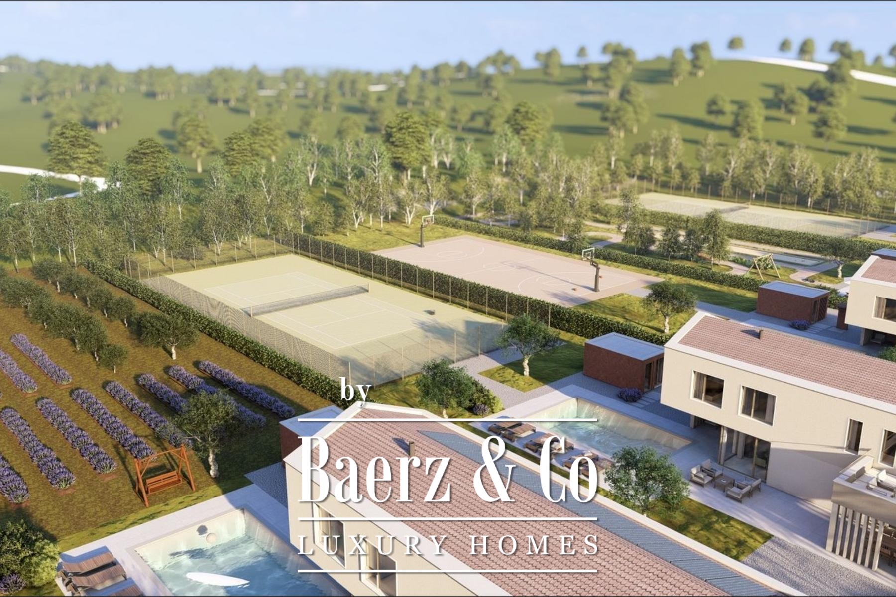 Four bedrooms, each with an en-suite bathroom, compose the upper floor. The master suite presents a private 17 m² roof terrace for moments of quiet repose. Outdoors, landscaped gardens stretch over 1,439 m², accommodating a future sports court or curated plantings according to the wishes of the new owner. Parking for three vehicles lies at the entrance, and systems such as underfloor heating, inverter climate control and solar readiness quietly support year-round comfort. This villa for sale in Labin exemplifies a harmonious merging of modern architecture and untouched Istrian landscape.