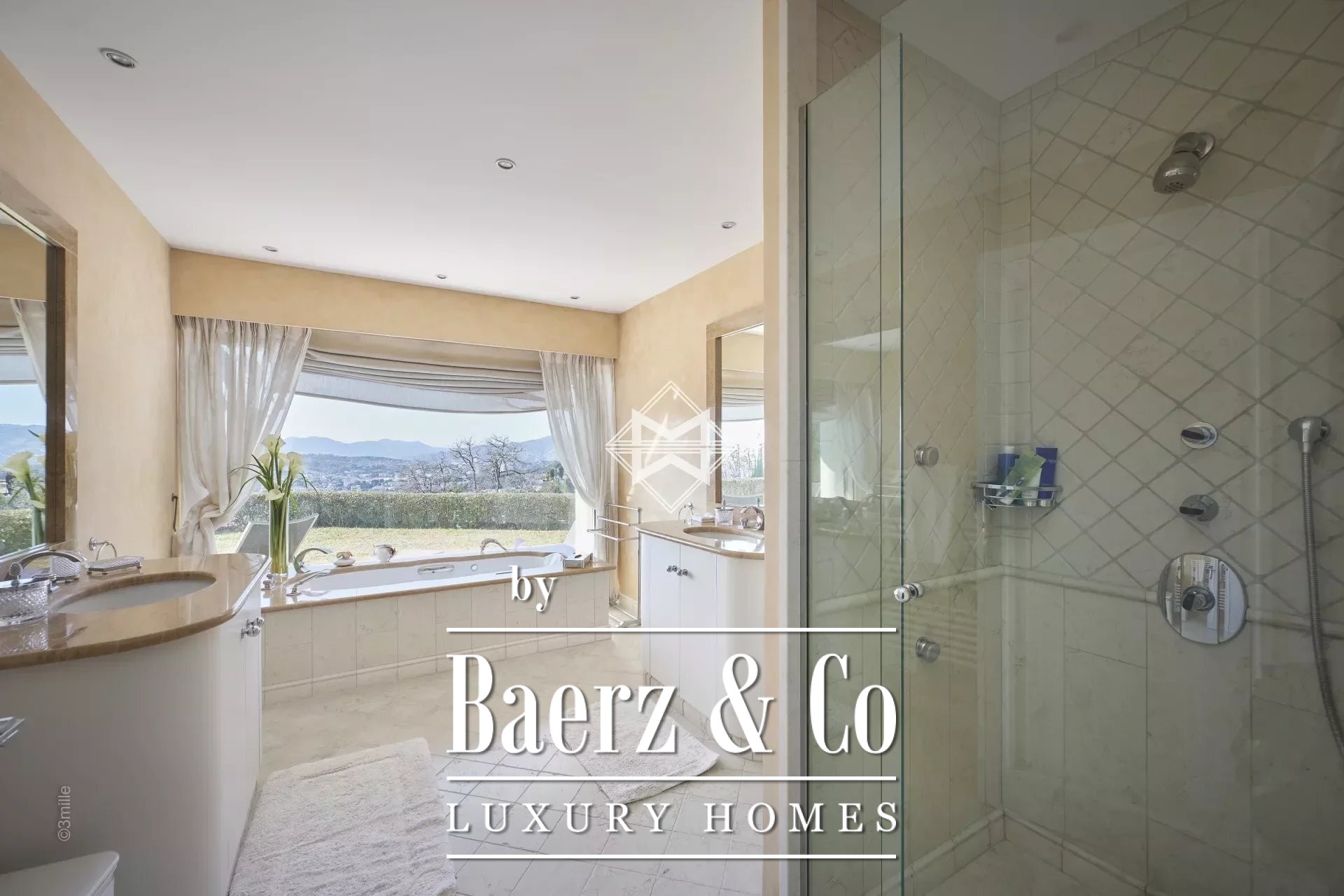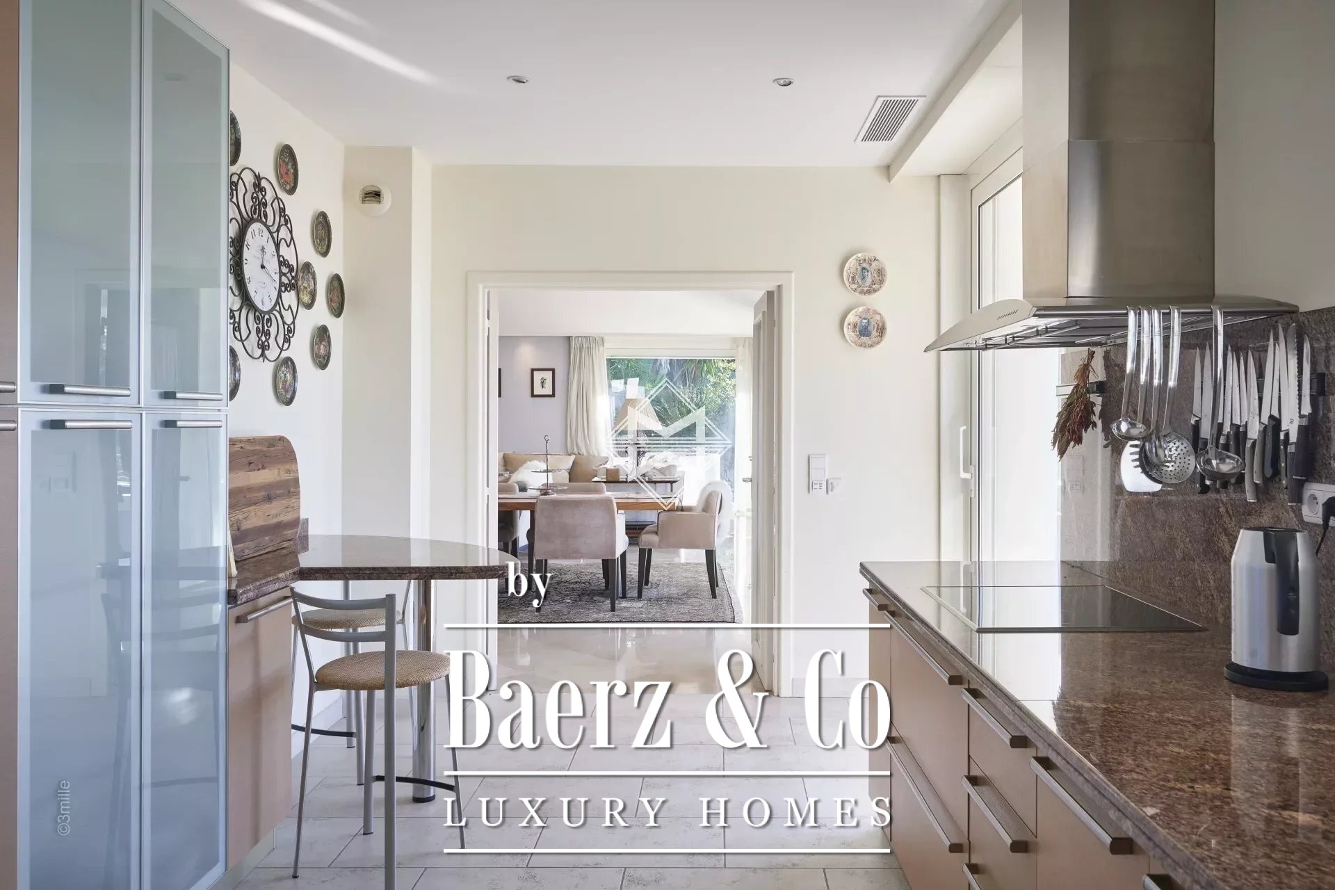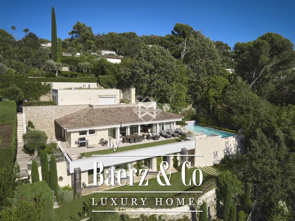 Amenities include a wellness area and a wine cellar, while an independent studio with kitchenette offers flexibility for guests or staff. Air-conditioning, electric shutters, and an alarm system reflect considered attention to comfort and security. Completing the property are a two-car garage and carefully curated outdoor spaces, all oriented to capture the sea horizon. This villa for sale in Cannes offers a setting attuned to privacy, design, and the natural rhythm of its surroundings.