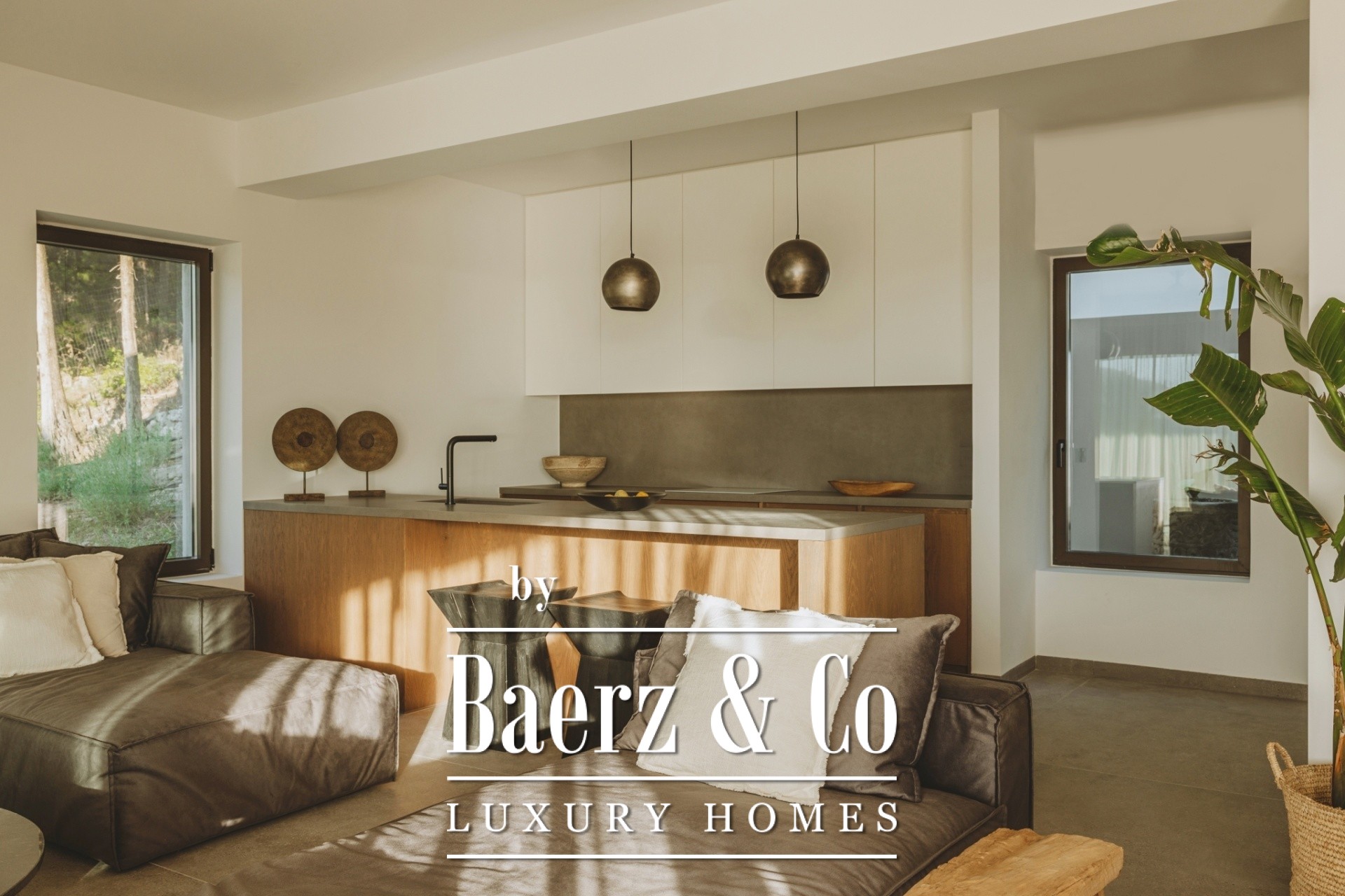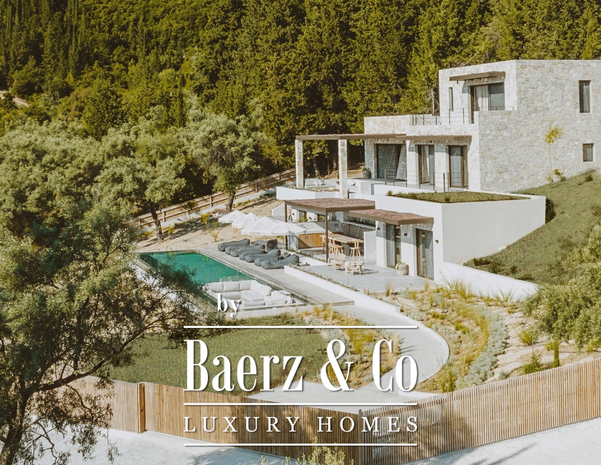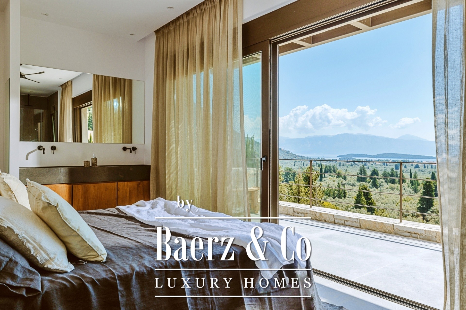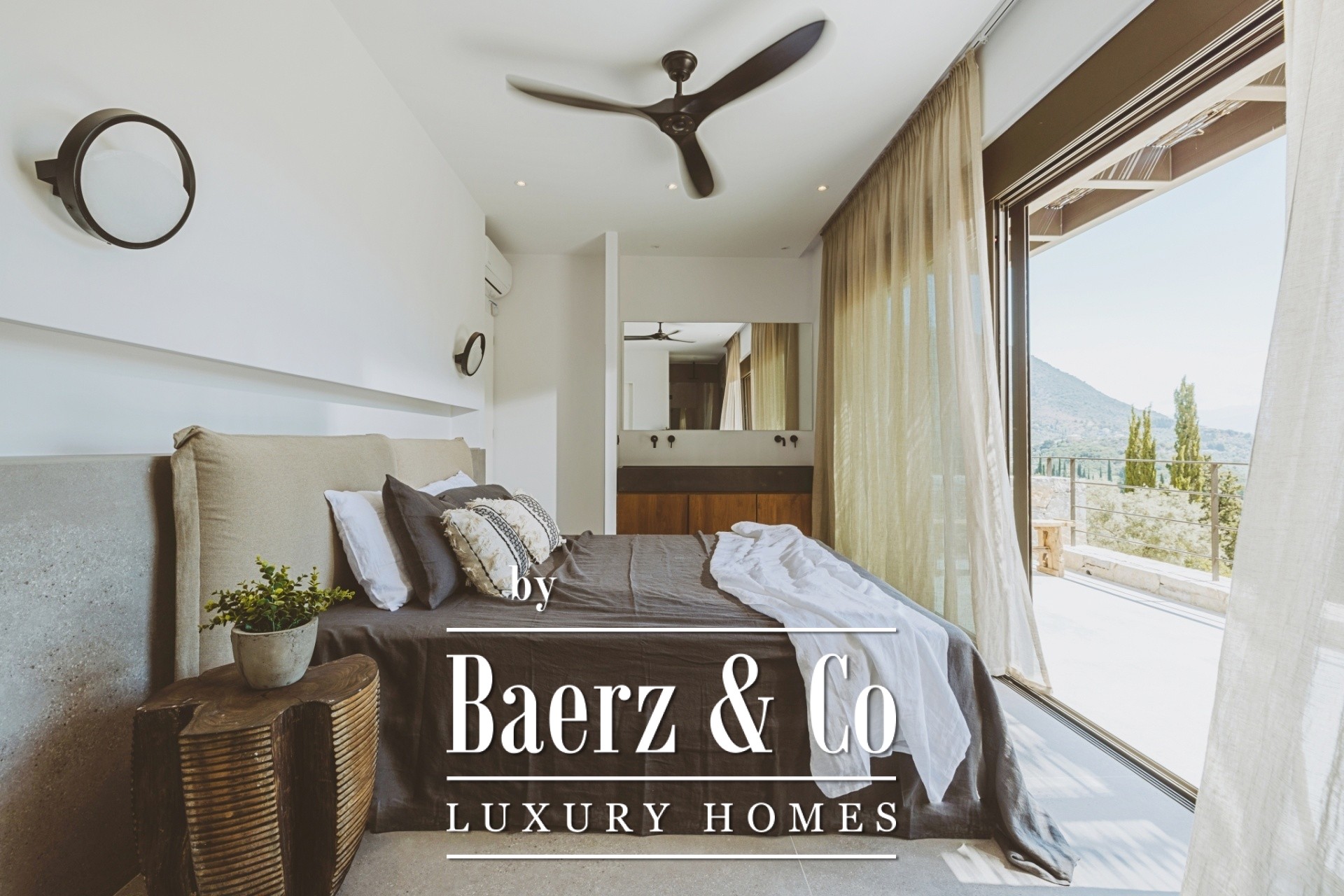 Luxury villa Lefkada defines understated coastal living, set on a commanding 6,820 m² plot in the heart of Nidri. This three-level villa offers 233 m² of sculpted interior space where form and function meet the expanse of the Ionian Sea. Upon entering, an open-plan dining area welcomes natural light and uninterrupted sea views, melding modern architecture with the landscape. The kitchen, seamlessly linked to the living room and dining space, expresses harmony and intentional design. Two en-suite bedrooms on this level provide comfort and privacy.
