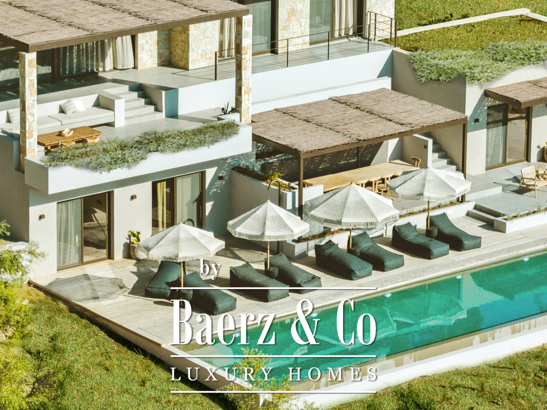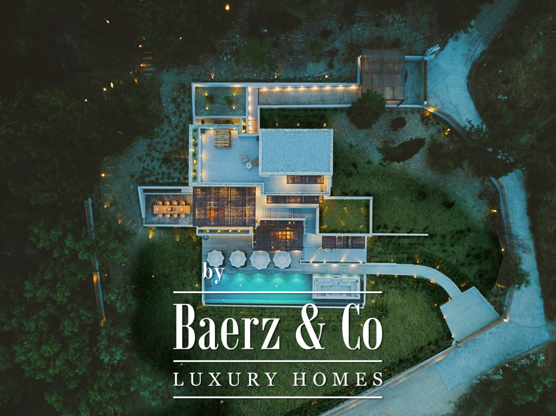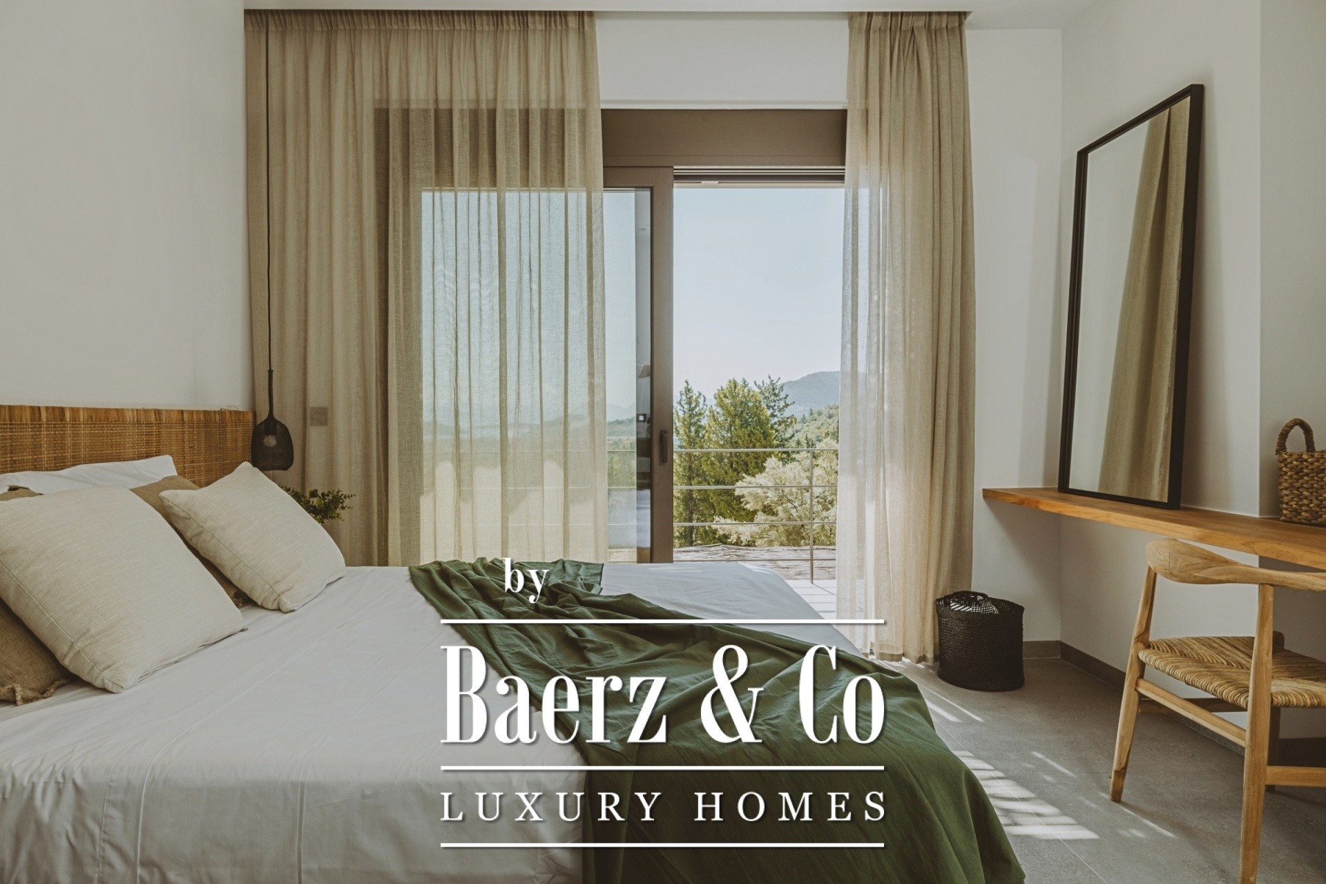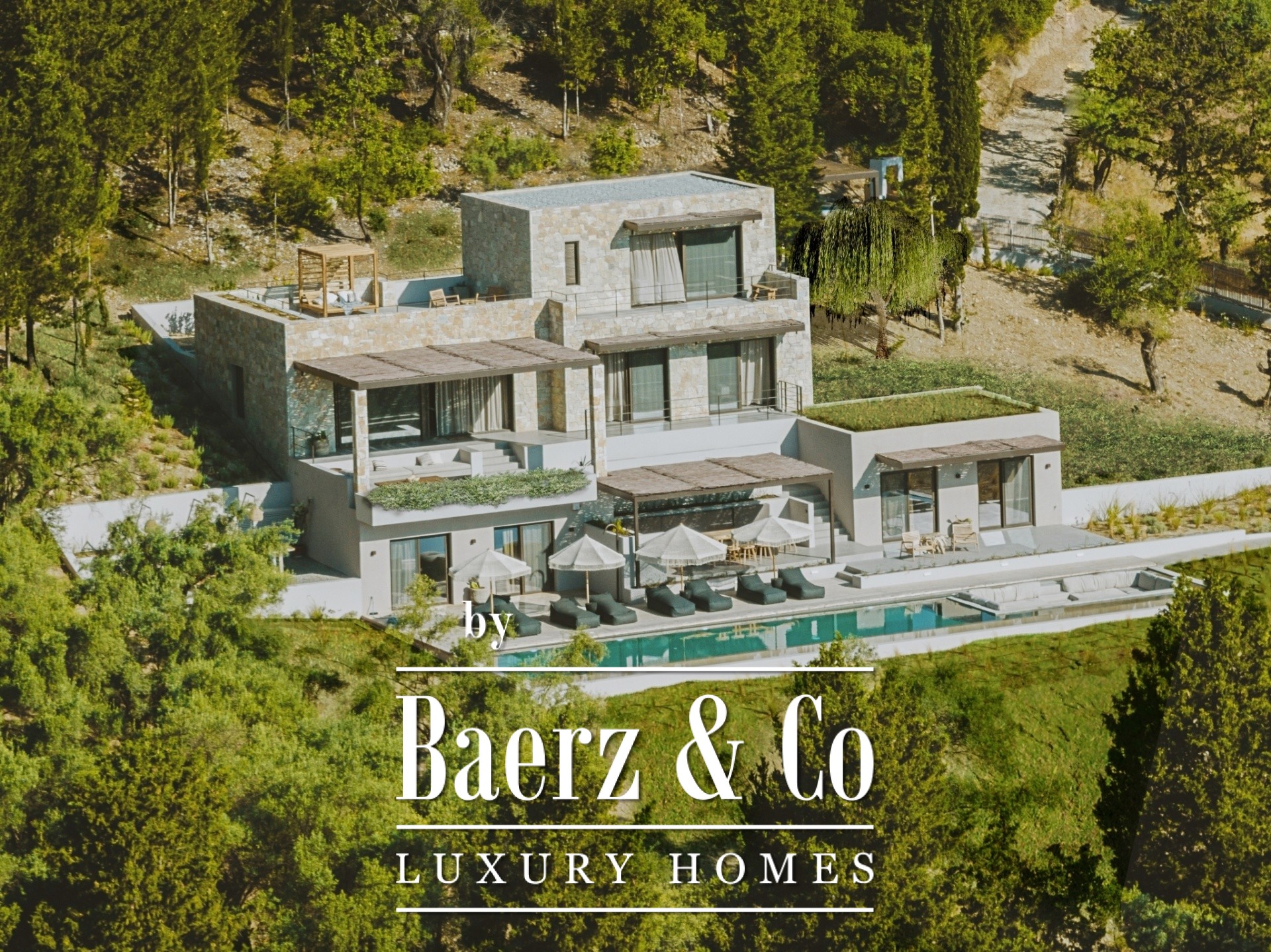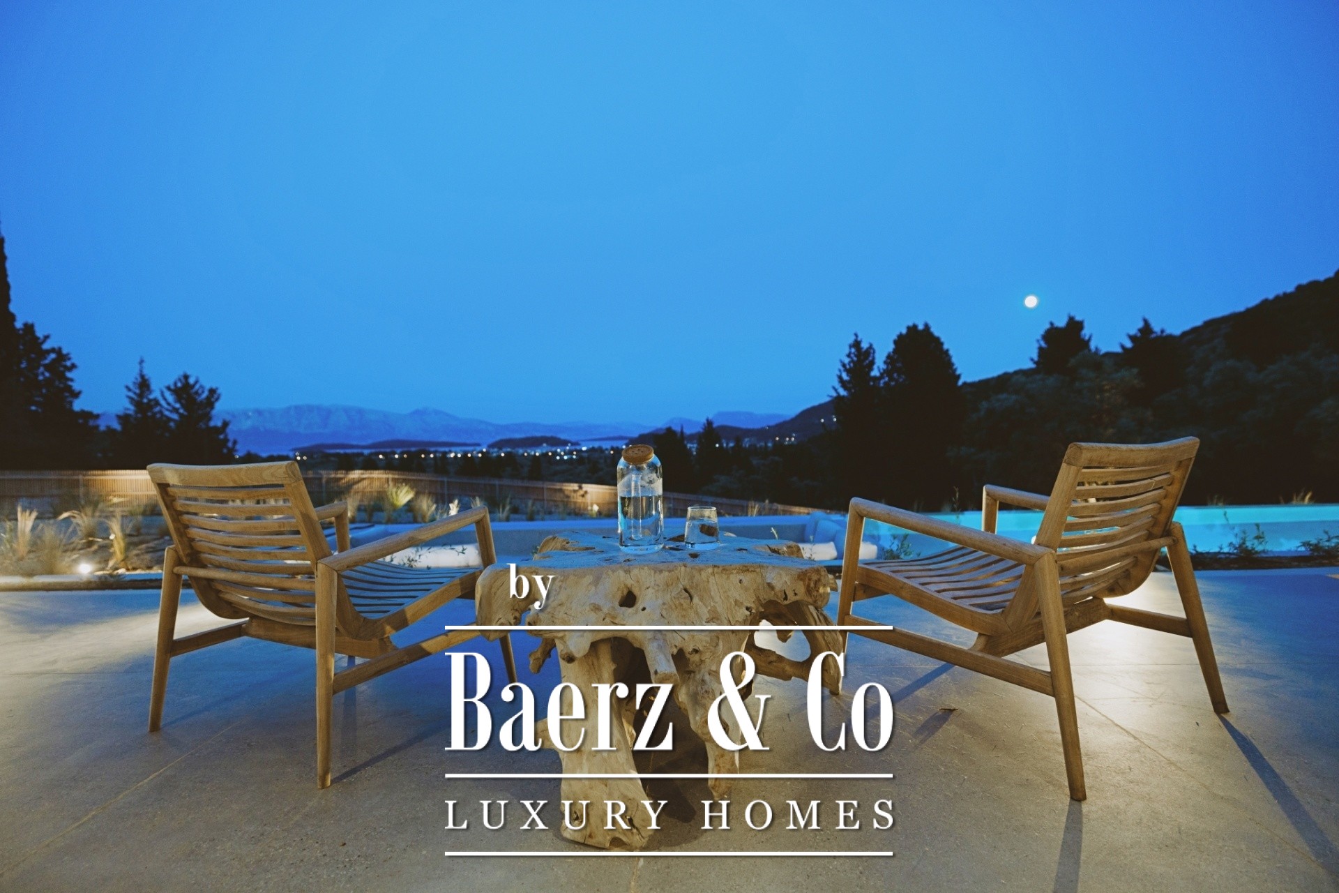 Luxury villa Lefkada defines understated coastal living, set on a commanding 6,820 m² plot in the heart of Nidri. This three-level villa offers 233 m² of sculpted interior space where form and function meet the expanse of the Ionian Sea. Upon entering, an open-plan dining area welcomes natural light and uninterrupted sea views, melding modern architecture with the landscape. The kitchen, seamlessly linked to the living room and dining space, expresses harmony and intentional design. Two en-suite bedrooms on this level provide comfort and privacy.