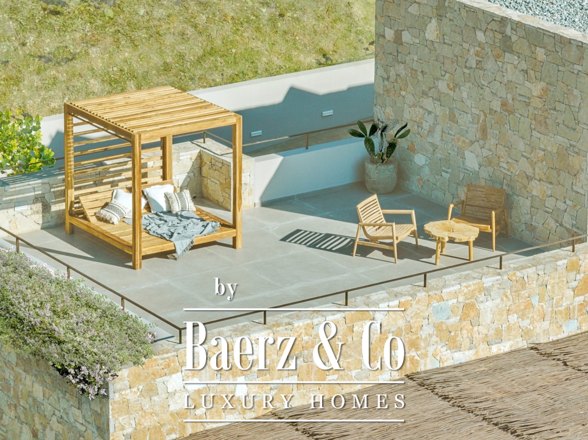 On the villa’s uppermost level, the master suite stands apart—comprising a bedroom, refined bathroom, spacious walk-in closet, and a private 50 m² balcony surveying sea and horizon. Mature gardens encircle the residence, softening its contemporary lines with nature’s presence. Four parking spaces, two shaded by pergolas, add to the discreet convenience. For buyers seeking a luxury villa for sale in Lefkada, this property is a serene sanctuary, combining panoramic views, architectural clarity, and a refined sense of privacy.