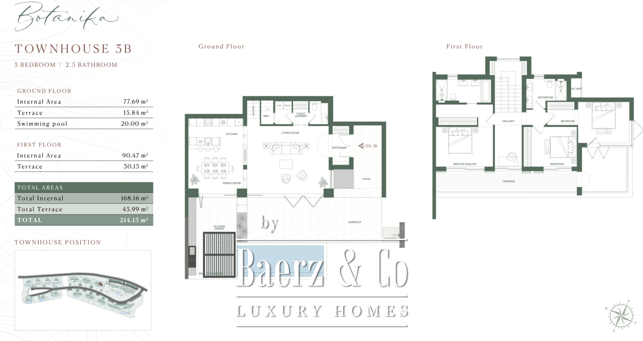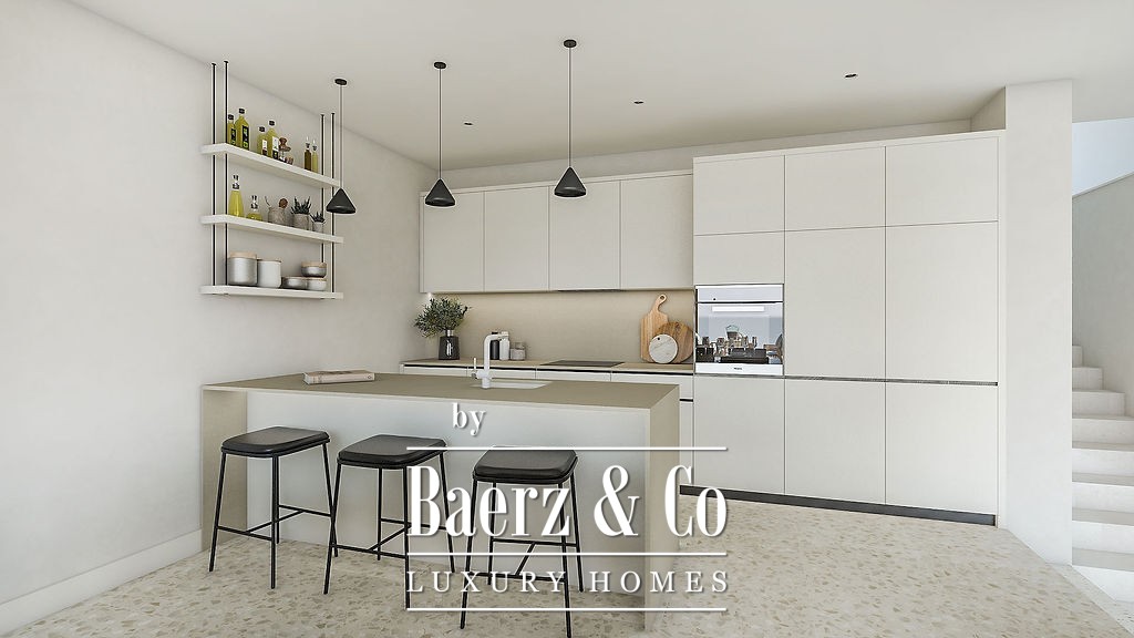 Three bedrooms and two refined bathrooms are detailed with porcelain tiling in stone and terrazzo effect, bespoke wardrobe finishes, and choice fittings from leading brands such as Miele and Laufen. A custom-crafted kitchen and high quality parquet further underscore the townhouse’s calm elegance. Wraparound balconies extend living outwards, while residents enjoy use of the neighborhood pool, Guvno seating area and dedicated parking.