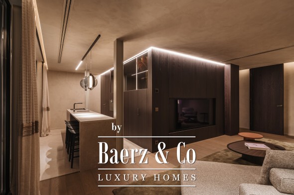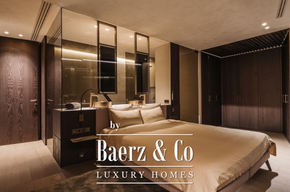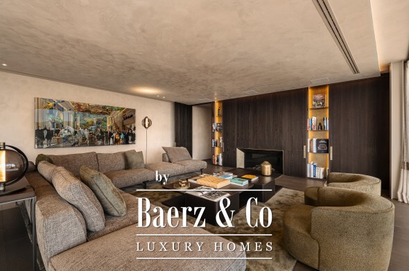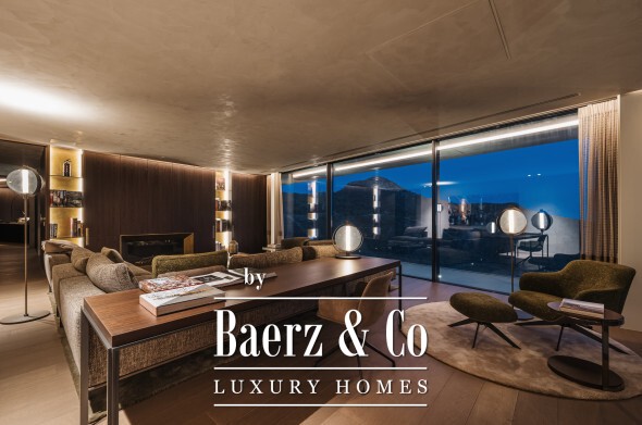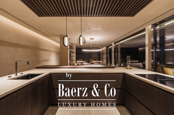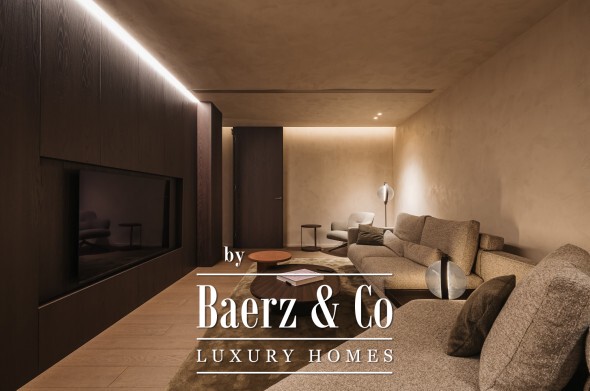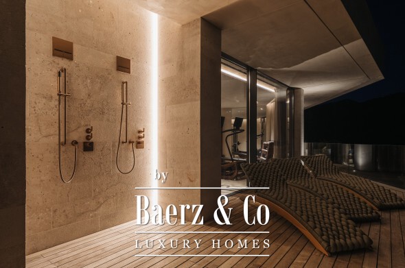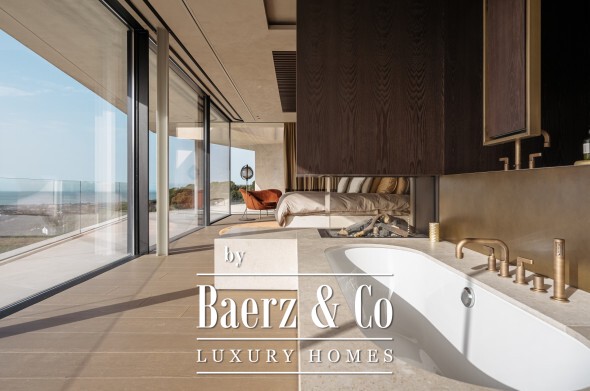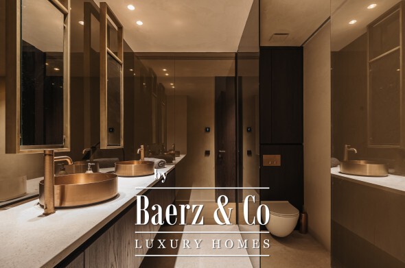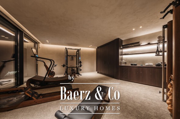 Inside, seven bedrooms and seven bathrooms are distributed between private and guest wings, each benefitting from generous proportions and sophisticated materials. Four kitchens equipped with Gaggenau appliances, a 6 m² walk-in refrigerator, and high-end Italian furnishings by Minotti, Molteni, Gessi and DeCastelli establish a standard of absolute quality. Full-height Schüco windows invite in panoramas, while multiple fireplaces and custom woodwork define living spaces.