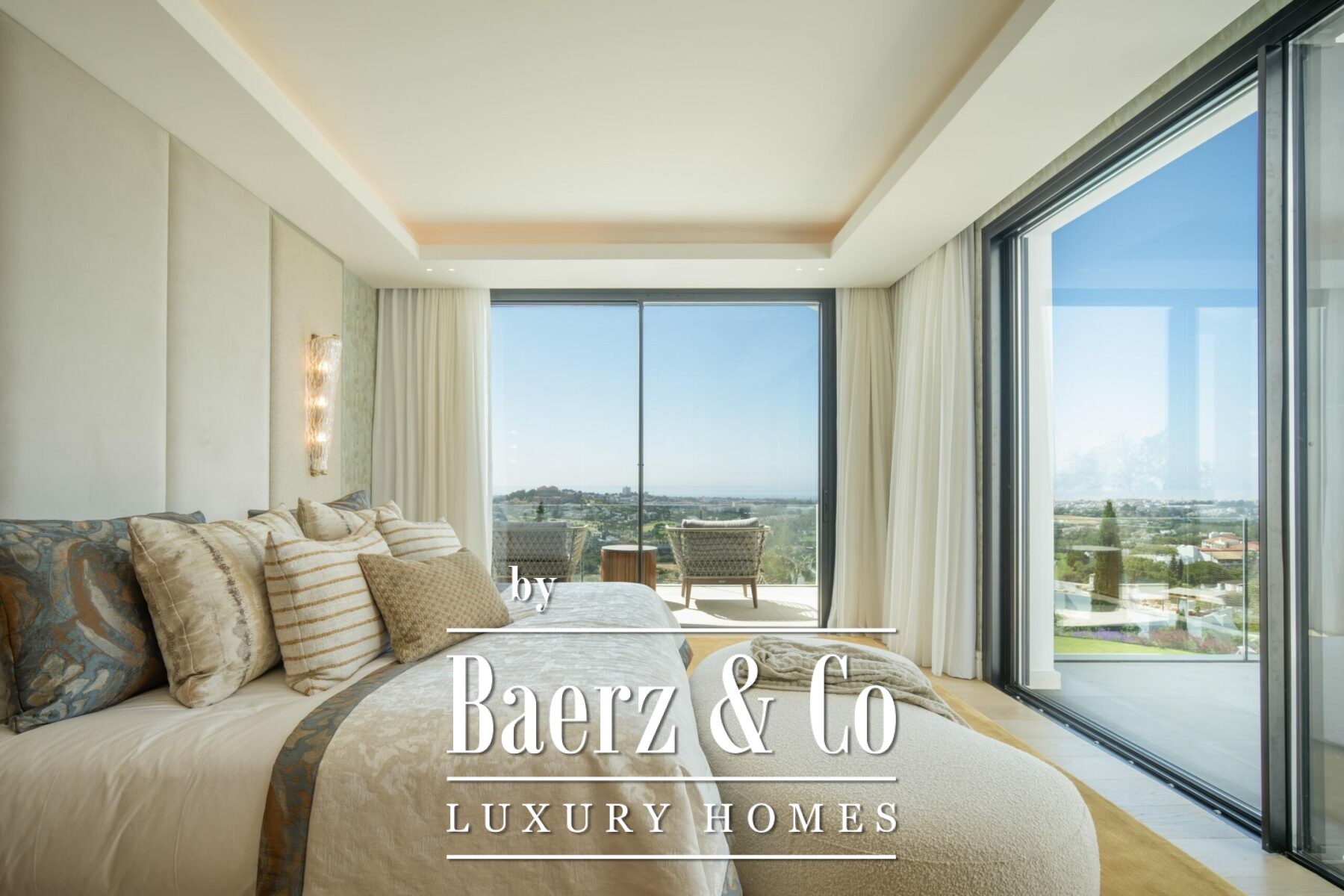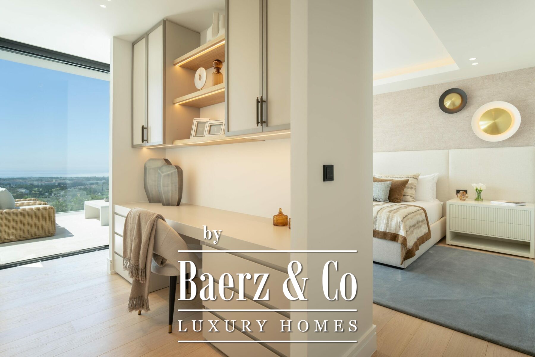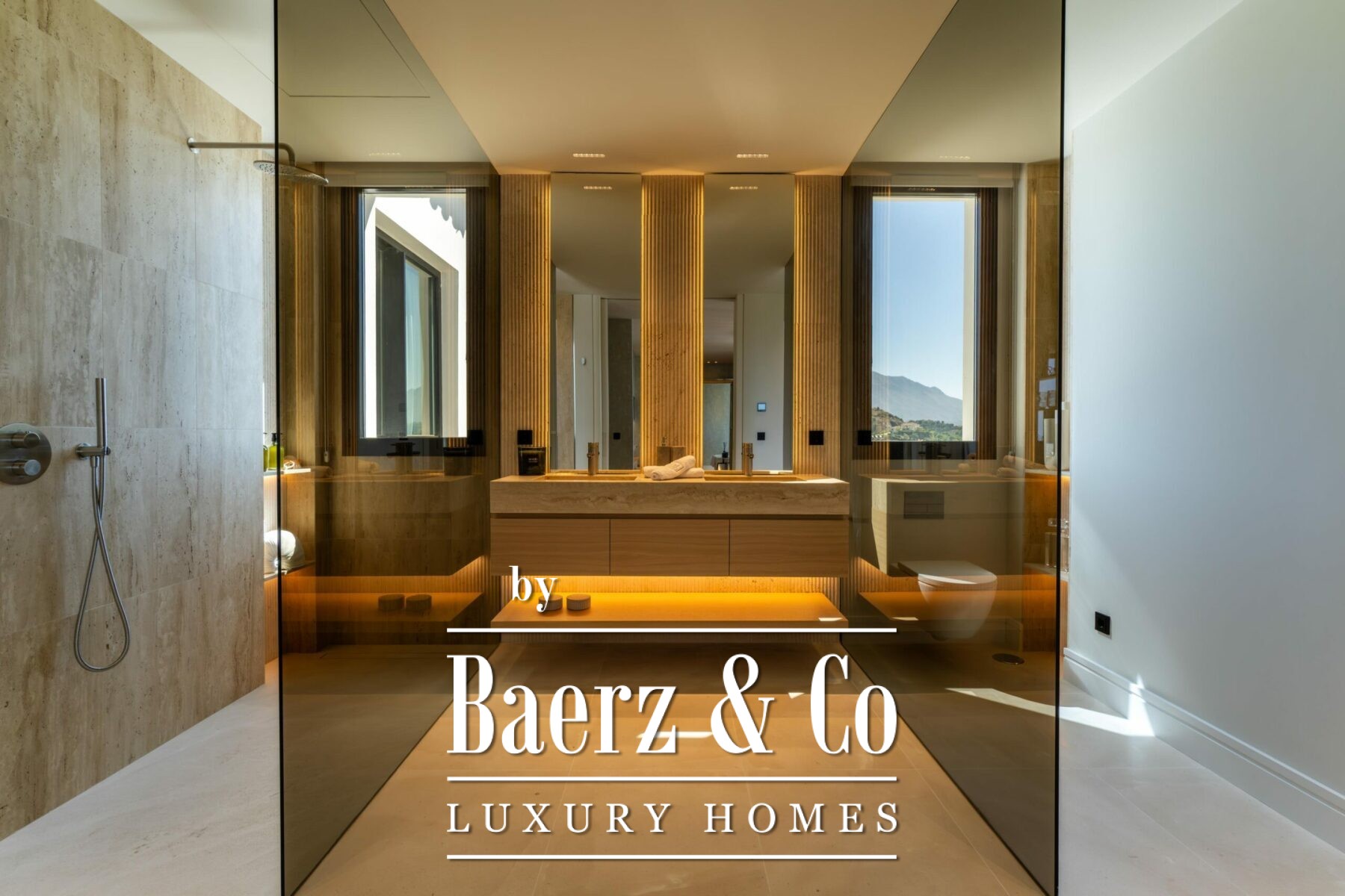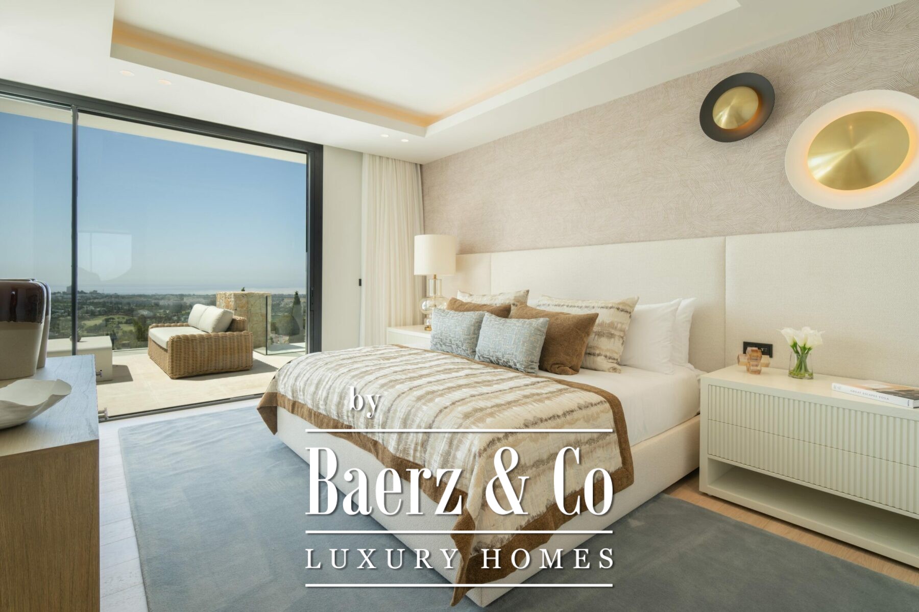 Eight en suite bedrooms embody sophistication, with the master suite offering a peaceful sanctuary, adjoining a private terrace that frames panoramic vistas of the Mediterranean Sea and rolling mountains. For leisure and wellbeing, amenities include a cinema room, home gym, spa with sauna, and an indoor pool. An advanced alarm system, A/C, and underfloor heating provide comfort and security, while proximity to golf courses, beaches, and amenities completes the experience of a luxury villa for sale in Marbella.
