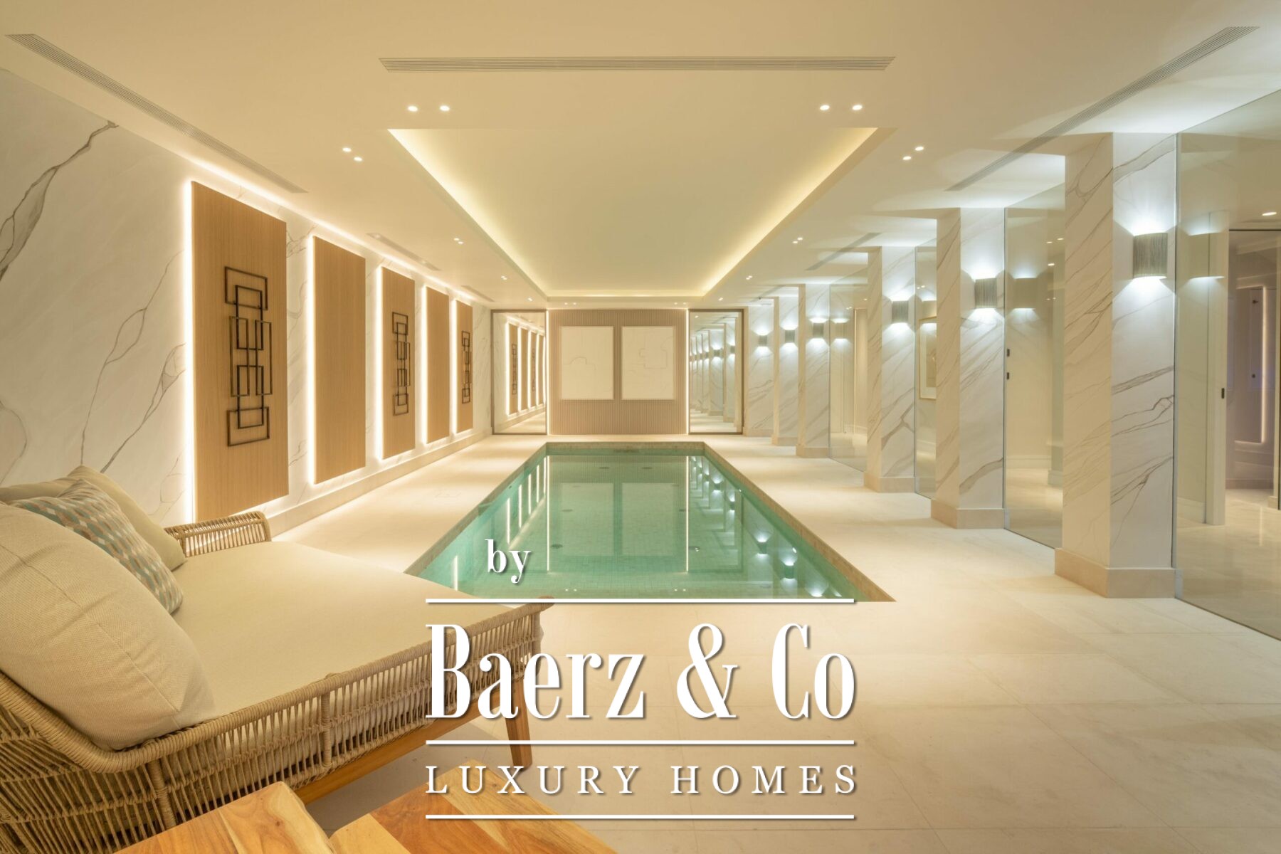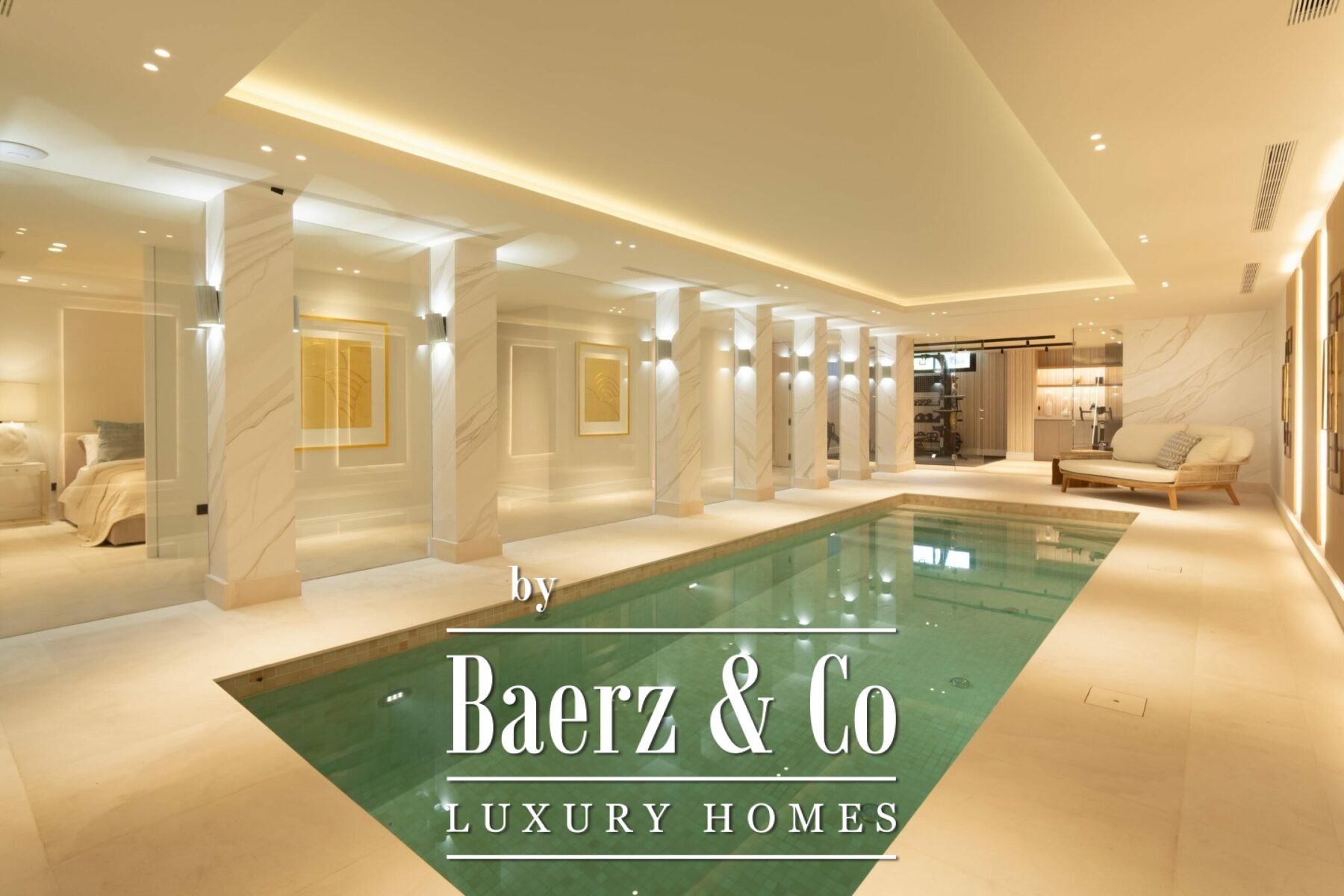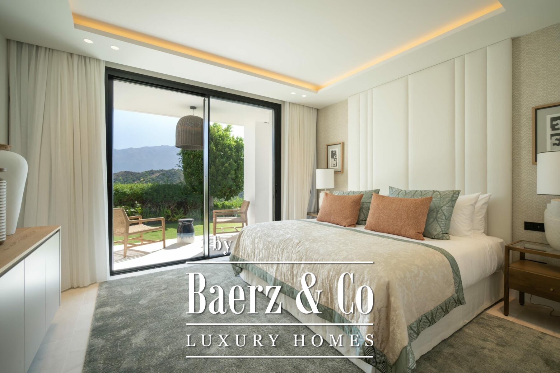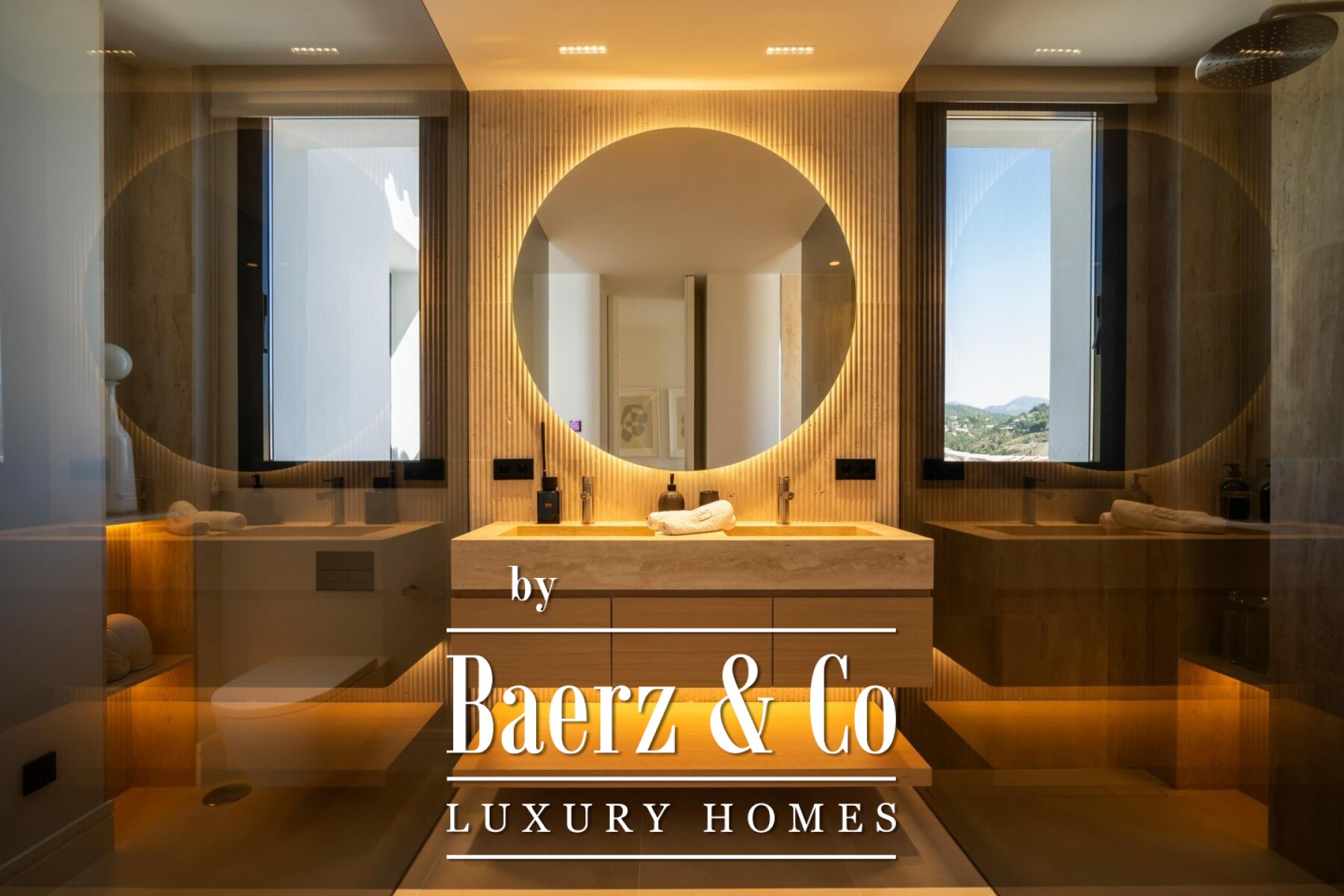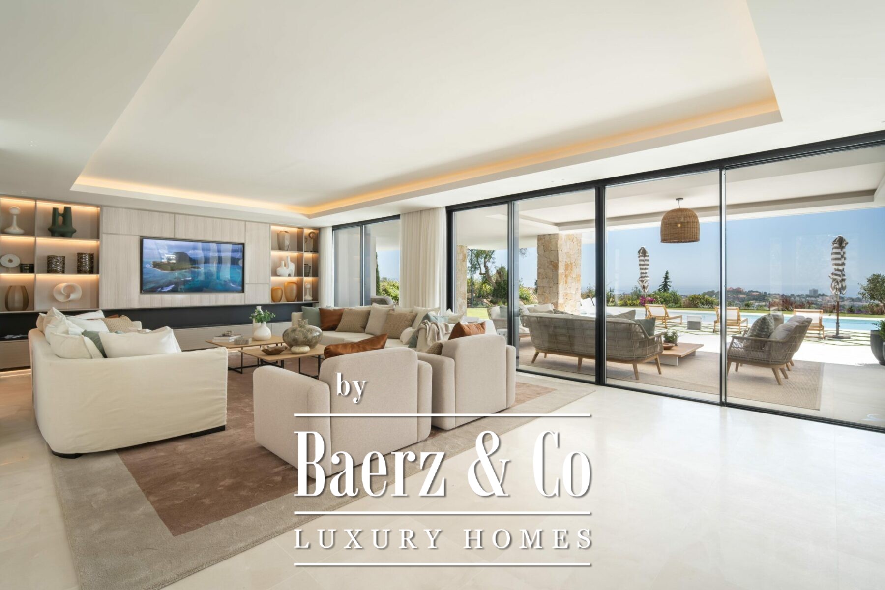 Eight en suite bedrooms embody sophistication, with the master suite offering a peaceful sanctuary, adjoining a private terrace that frames panoramic vistas of the Mediterranean Sea and rolling mountains. For leisure and wellbeing, amenities include a cinema room, home gym, spa with sauna, and an indoor pool. An advanced alarm system, A/C, and underfloor heating provide comfort and security, while proximity to golf courses, beaches, and amenities completes the experience of a luxury villa for sale in Marbella.