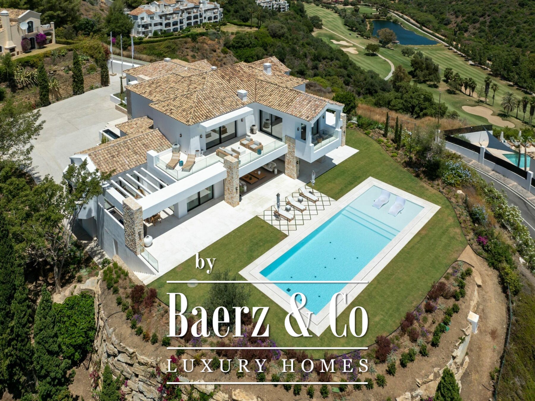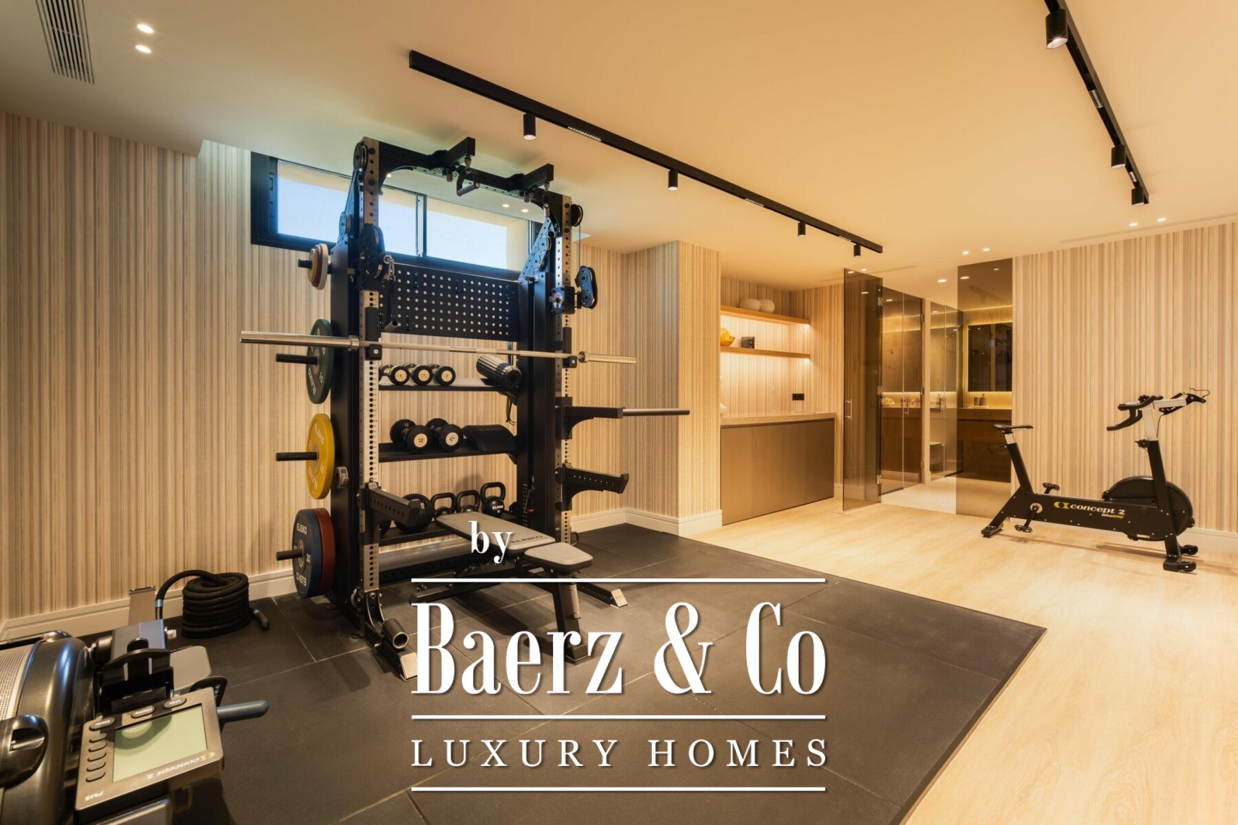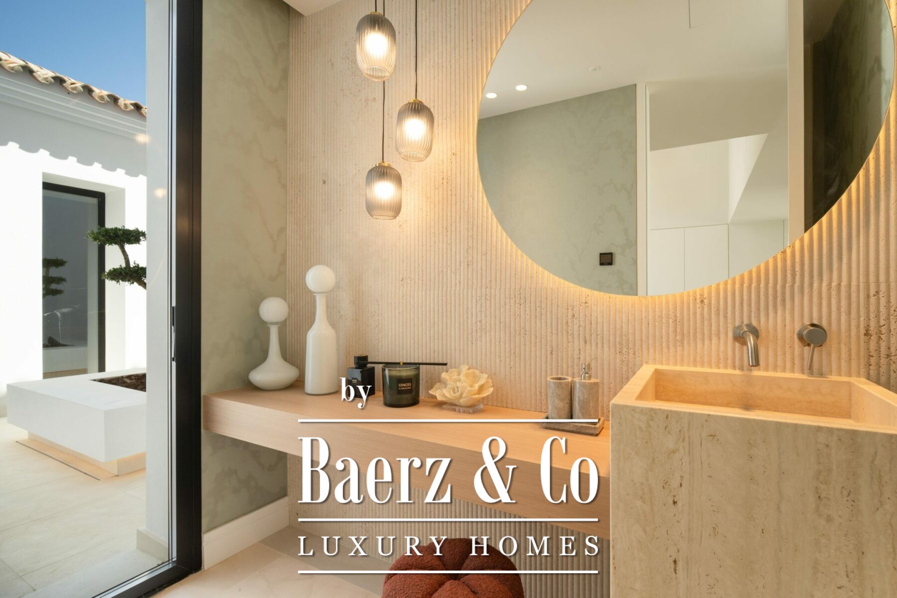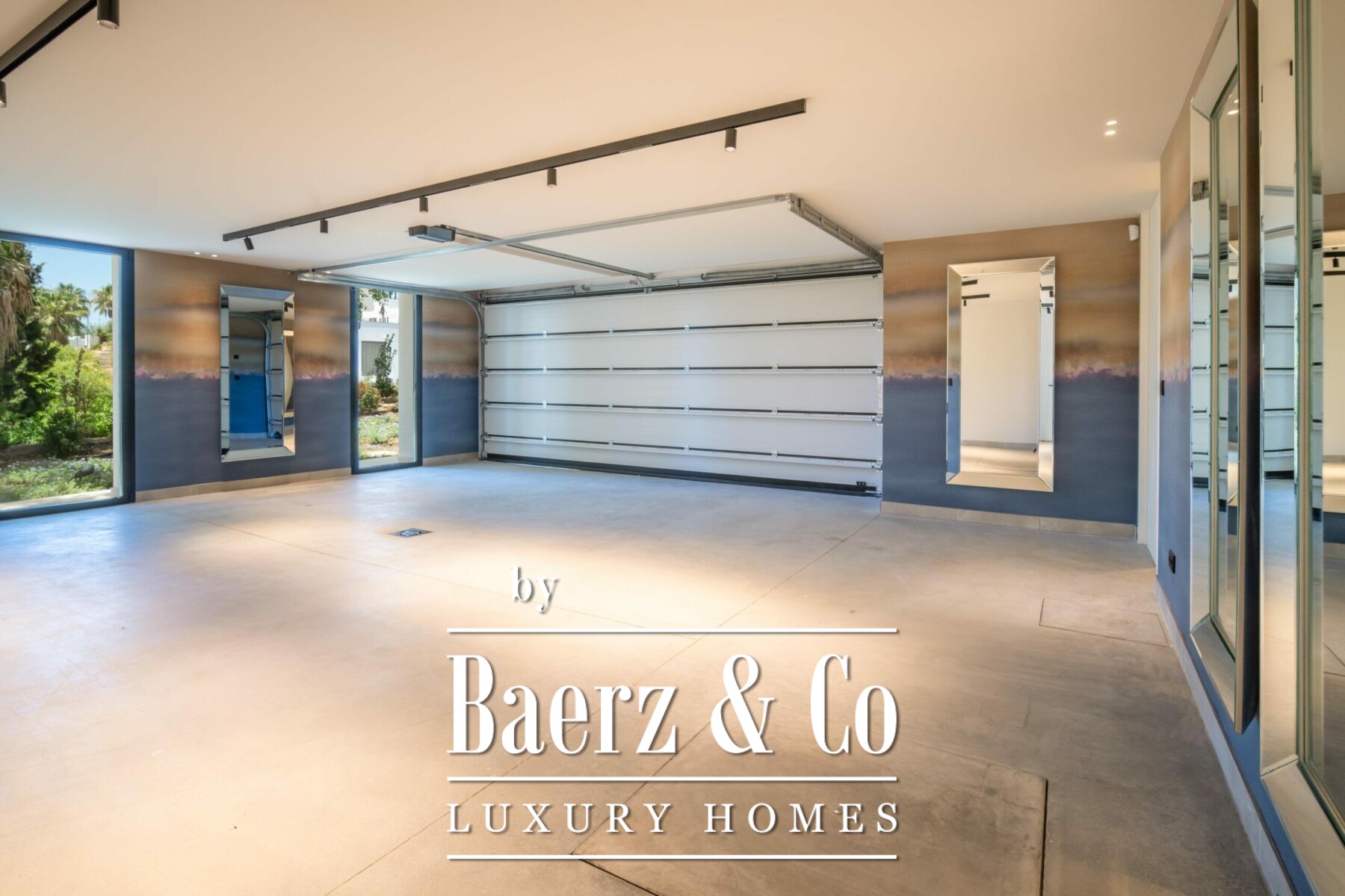 Eight en suite bedrooms embody sophistication, with the master suite offering a peaceful sanctuary, adjoining a private terrace that frames panoramic vistas of the Mediterranean Sea and rolling mountains. For leisure and wellbeing, amenities include a cinema room, home gym, spa with sauna, and an indoor pool. An advanced alarm system, A/C, and underfloor heating provide comfort and security, while proximity to golf courses, beaches, and amenities completes the experience of a luxury villa for sale in Marbella.