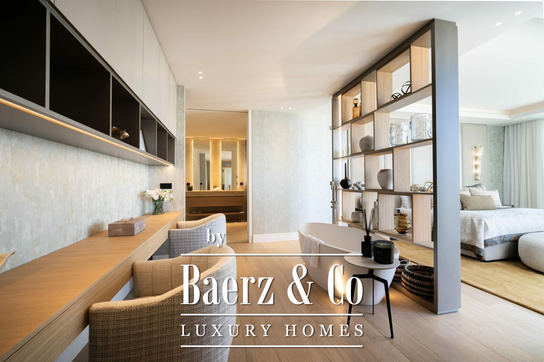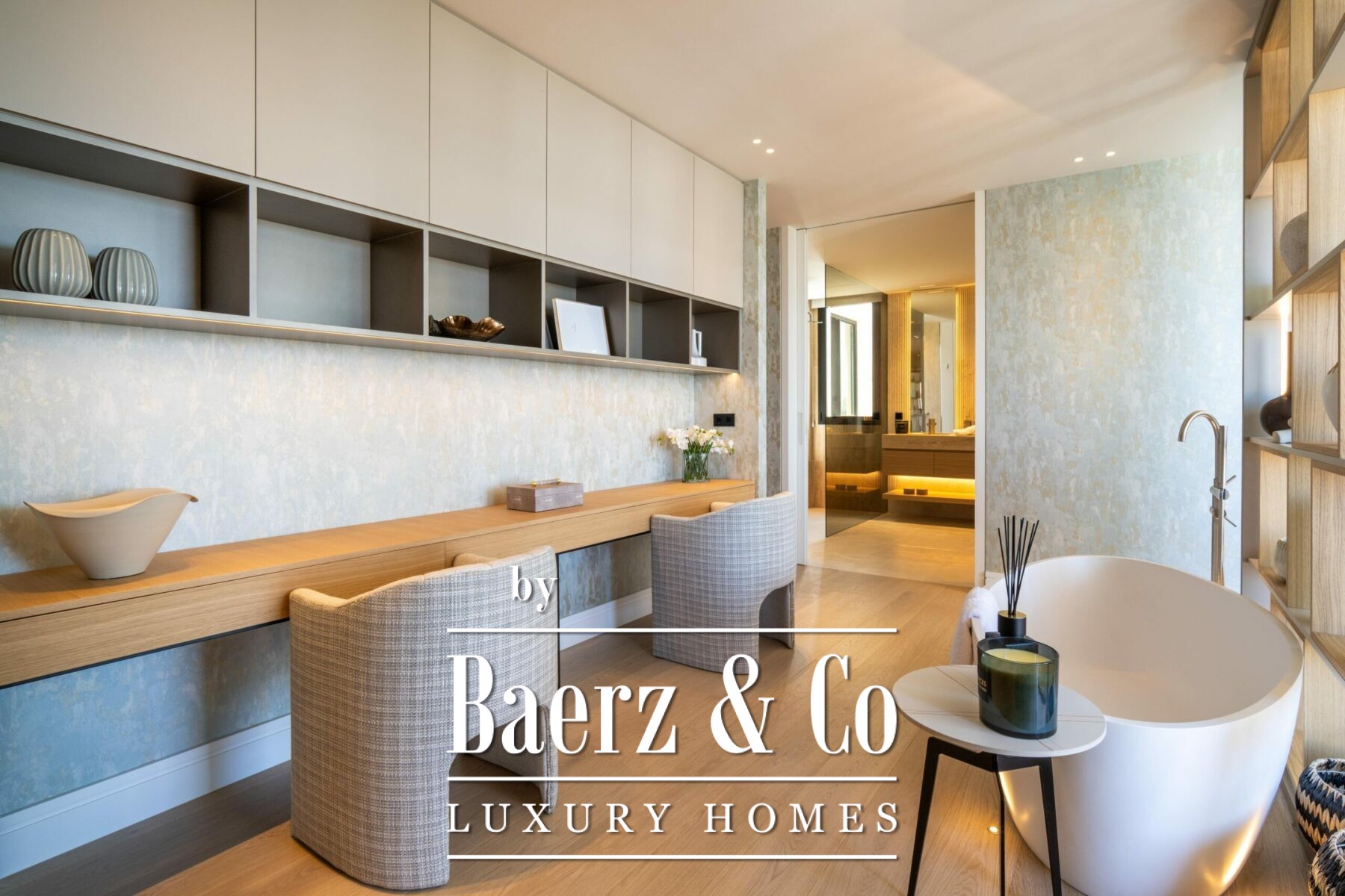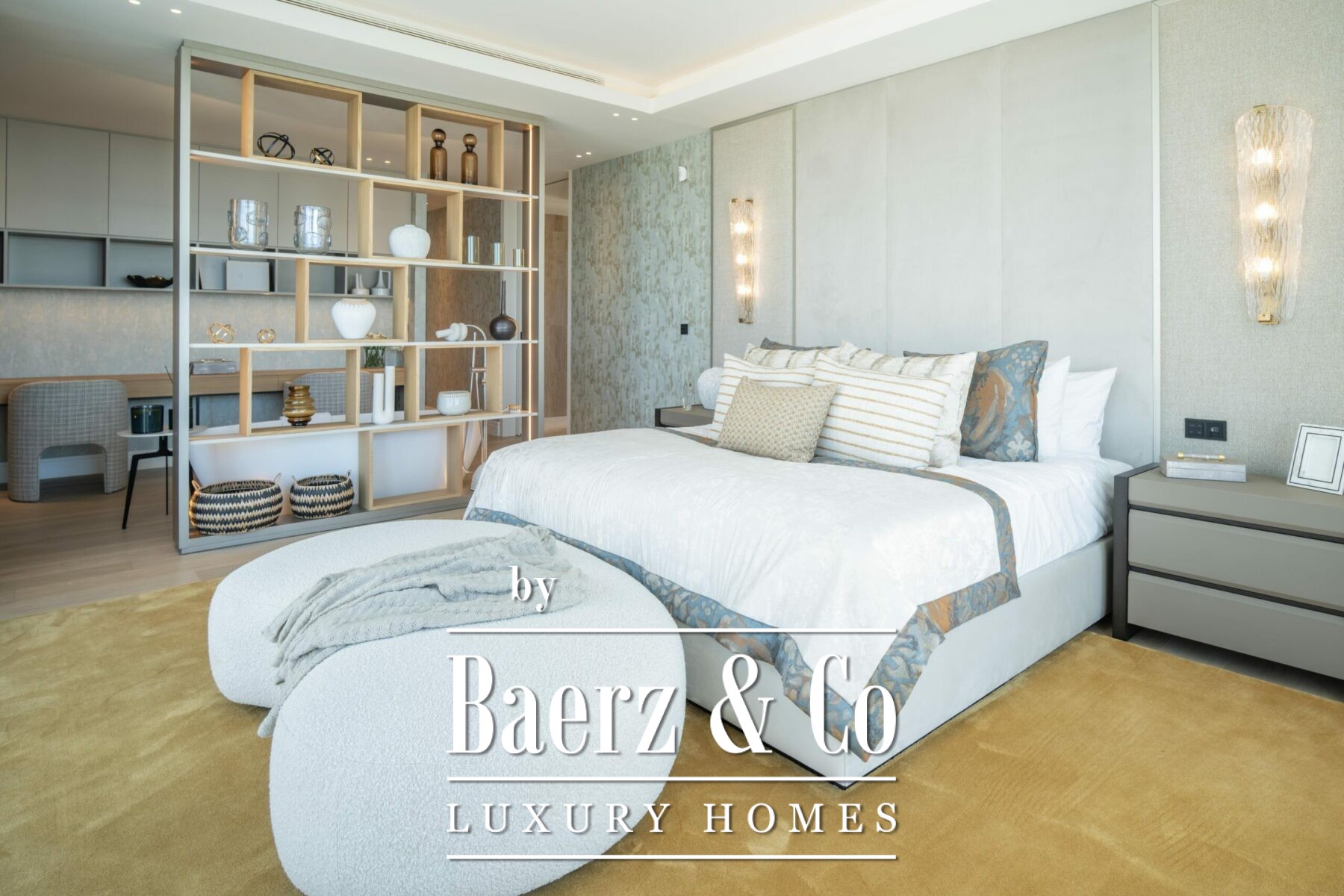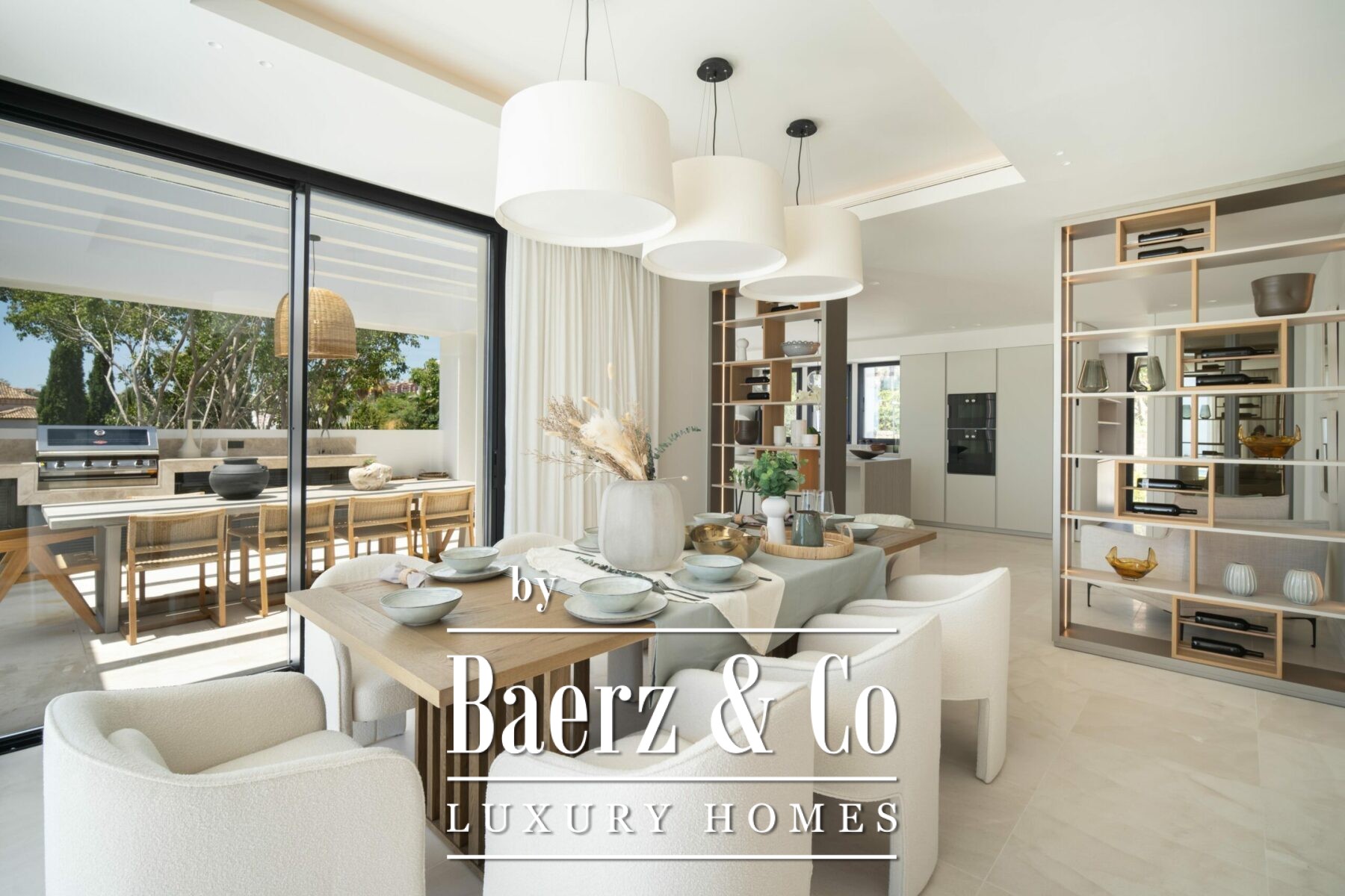 Expansive floor-to-ceiling windows permeate the 958 m² interior, infusing each space with soft natural light. Attention to detail is evident throughout the home, from the selection of curated furnishings to the seamless interplay between living, dining, and a modern kitchen equipped with a generous island and abundant storage. Integrated indoor-outdoor living is enhanced by several chill-out areas and an outdoor kitchen suited for refined entertaining.