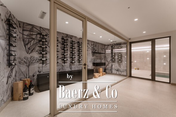 The upper level delivers both privacy and perspective. The master suite features dual bathrooms, separate wardrobes, and expanses of glass framing the landscape. Two further guest suites, one with a private terrace, complete this sanctuary. On the lower floor, a spa with heated indoor pool, sauna, gym, and steam room await, complemented by an entertainment lounge, climate-controlled wine cellar, and a staffed apartment with its own kitchen. Four cars rest securely in the garage, with additional guest parking for six vehicles.