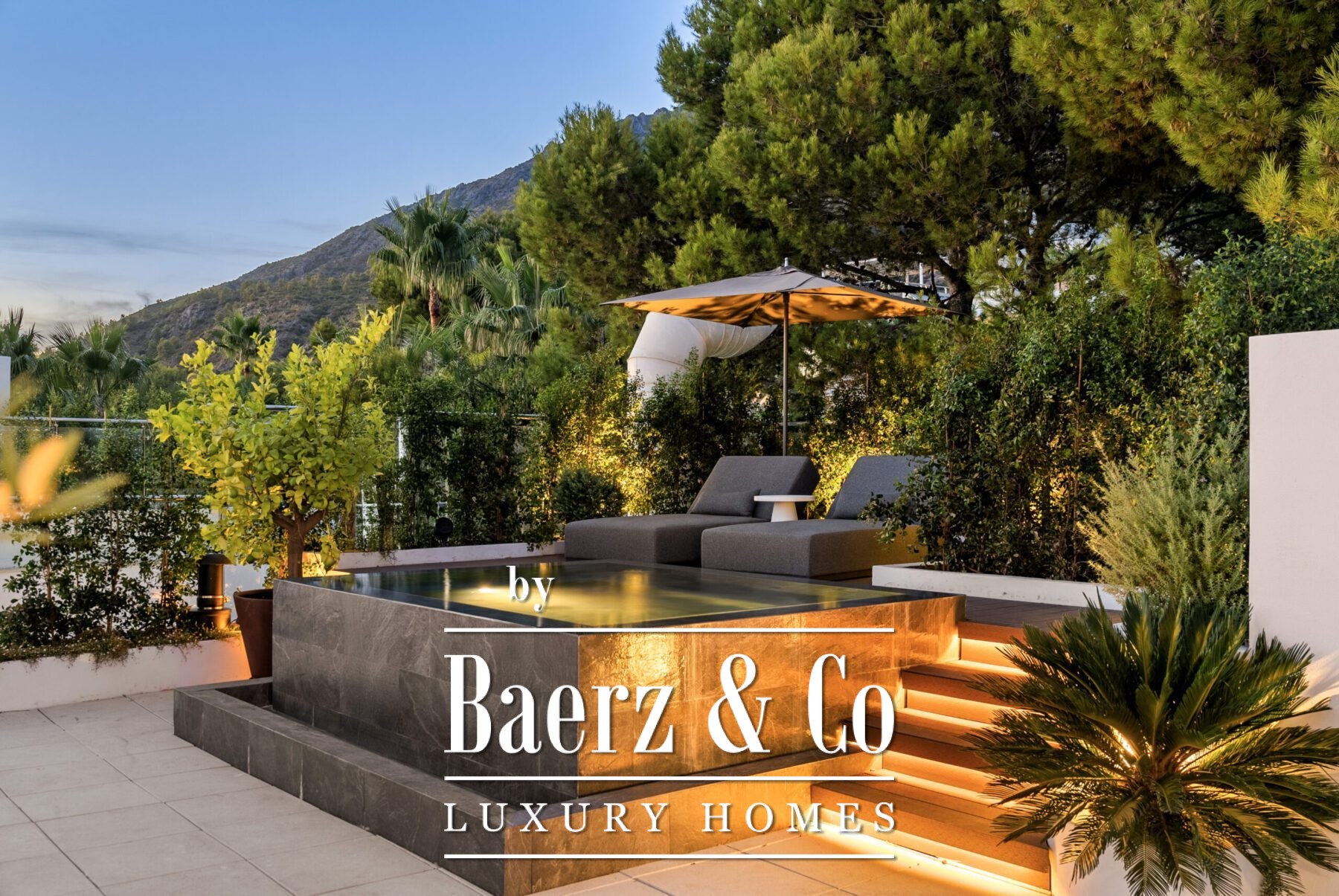Semi detached house Marbella stands at the intersection of contemporary design and enduring elegance. Nestled in the sought after enclave of Sierra Blanca, this residence enjoys an enviable setting beneath the iconic La Concha mountain, offering panoramic views over the Mediterranean coastline and a heightened sense of privacy.