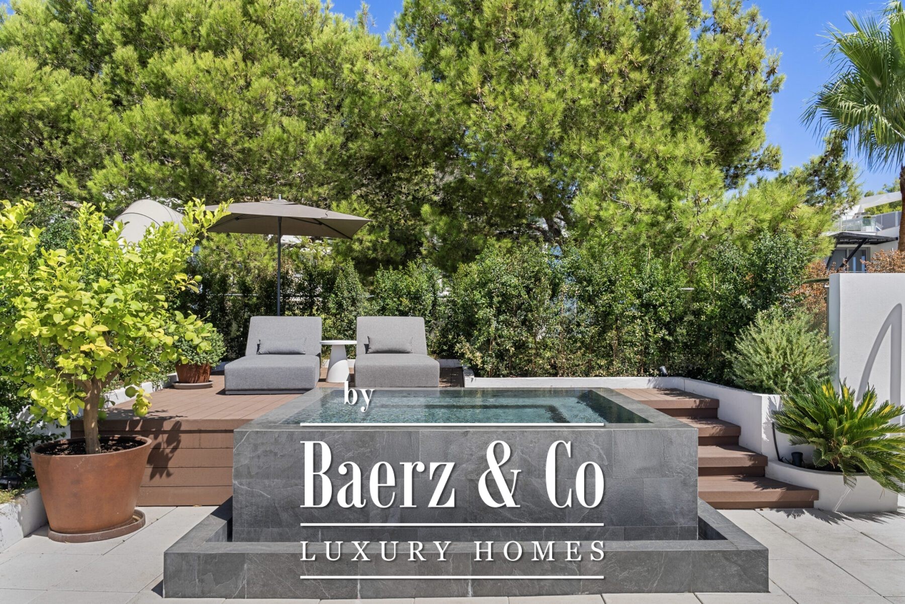 A private elevator connects four levels, seamlessly integrating daily life with moments of refined entertaining. The south facing terrace features a private pool, inviting relaxation beneath Marbella's year round sun. On the rooftop, a solarium with jacuzzi and outdoor kitchen offers unbroken coastal and sunset views, an exclusive retreat above the city.