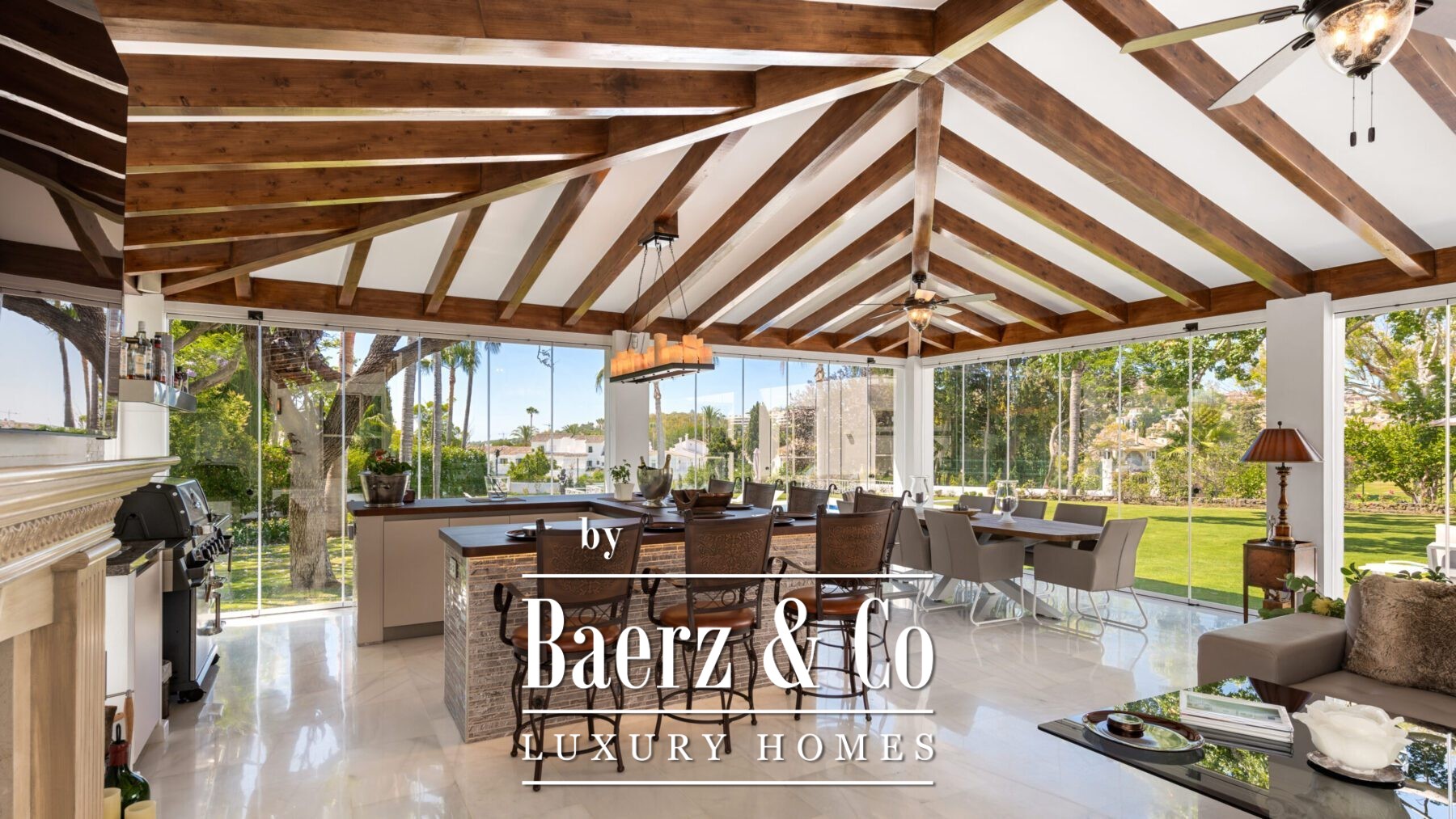 Outdoors, a large pool with waterfall feature is surrounded by manicured lawns, mature trees, and multiple seating and dining spaces—including a tiled courtyard with a decorative fountain. Expansive glass walls and terraces establish an effortless connection with Marbella’s climate. The property is one of the few with direct Los Naranjos Golf entrances, with thoughtfully designed pathways suitable for a golf buggy.