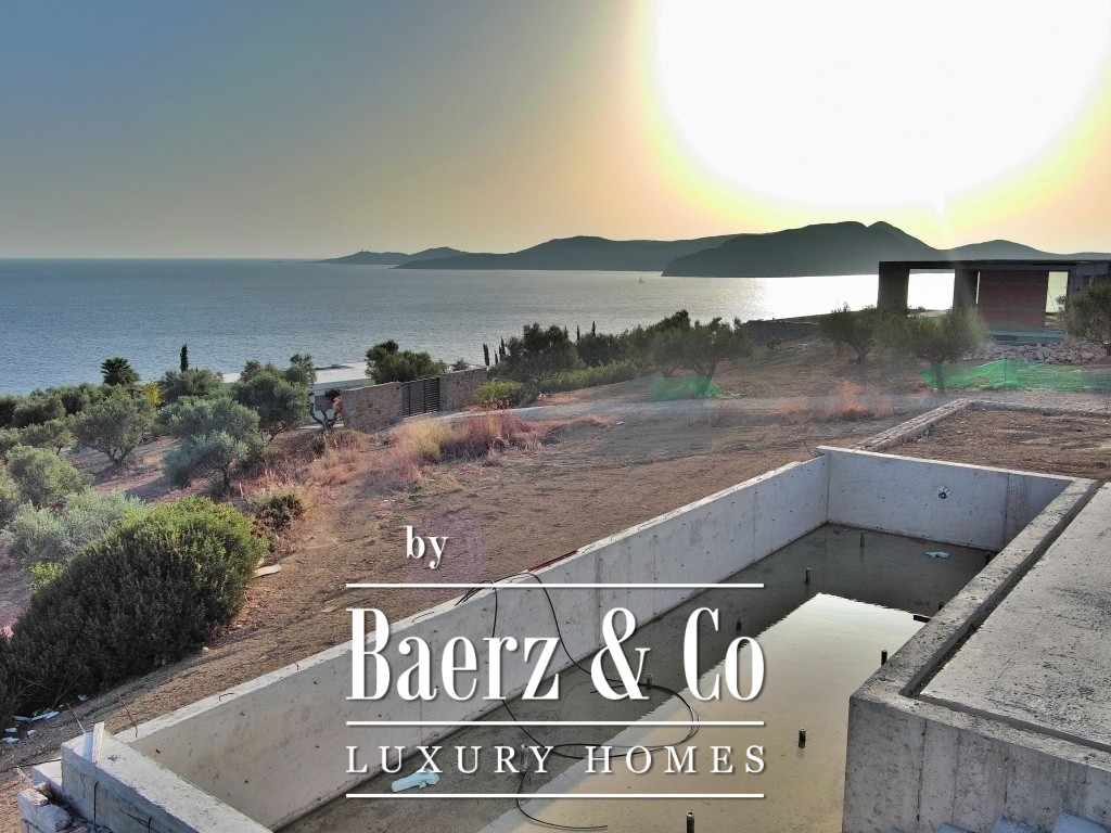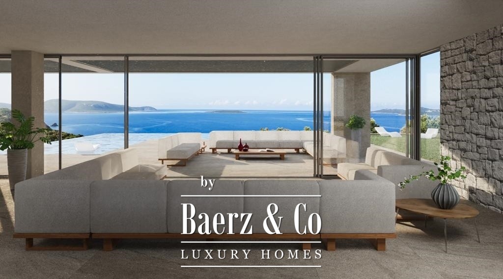 Inside, the open plan living room and kitchen are crowned by glazed windows, creating seamless transitions between interior and the Ionian panorama beyond. The island kitchen, set to the side, provides both function and a choreography for indoor and outdoor living. With a single gesture, large glass walls slide open, letting space and light flow freely.