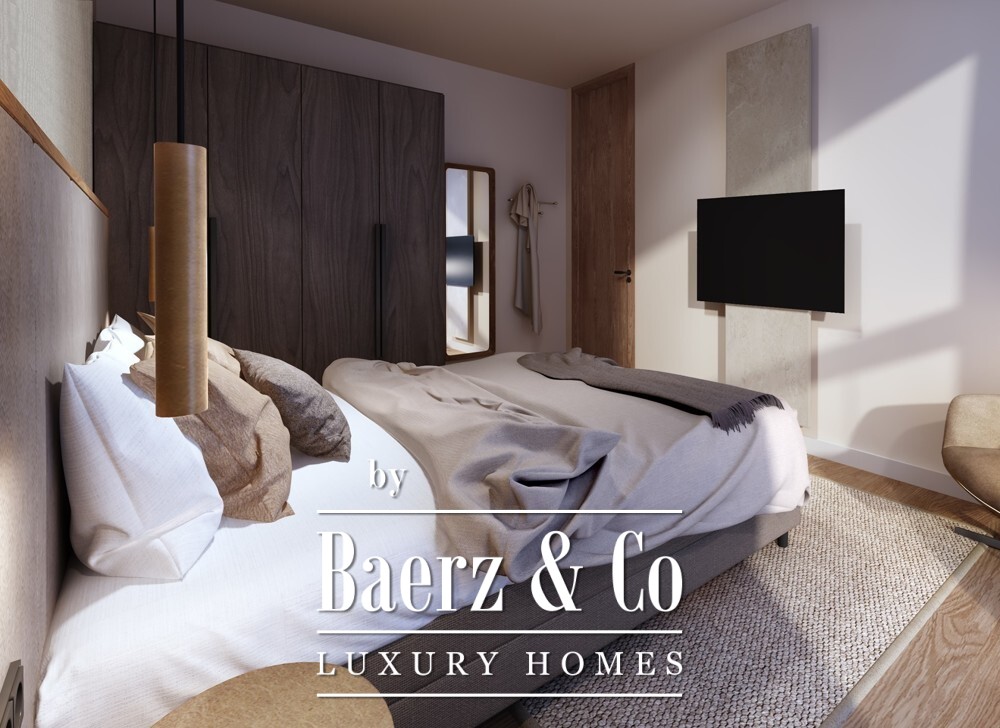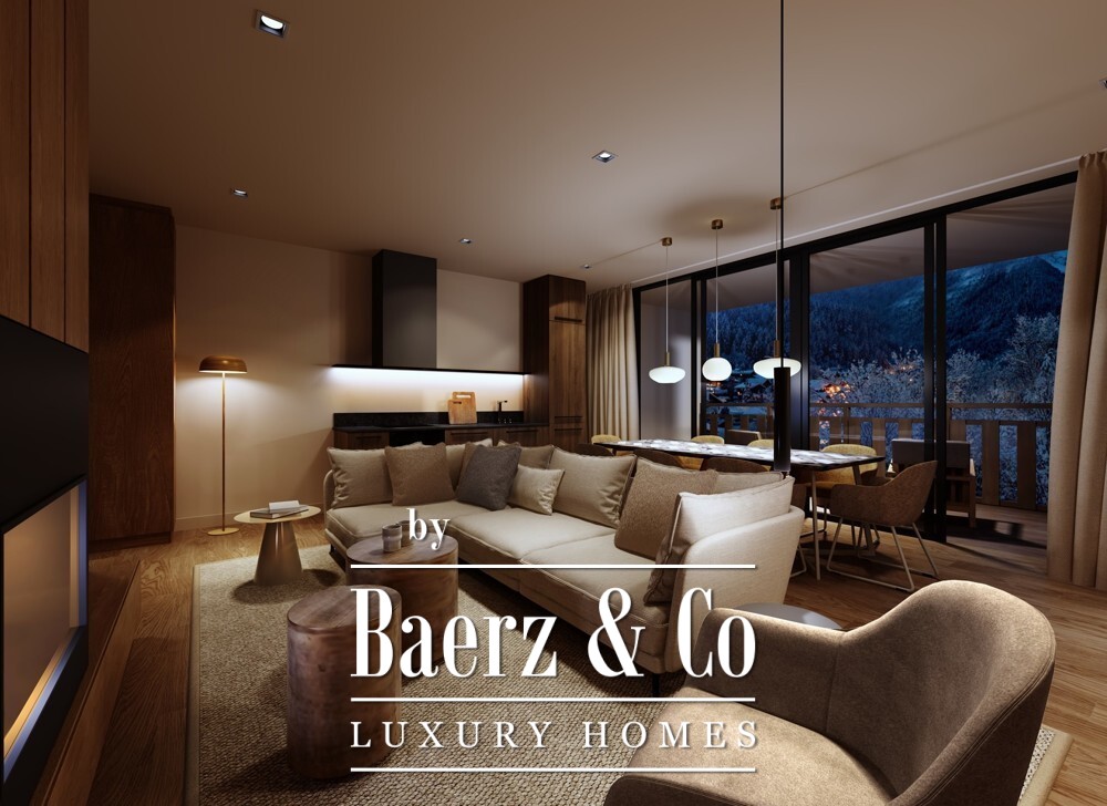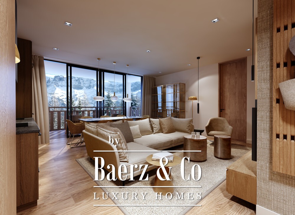 The property offers four bedrooms and two bathrooms, each shaped for both comfort and privacy. Residents can select between two architectural styles, embracing either modern luxury or luxurious alpine character. Large windows frame the mountains and the village, while green spaces interweave the three low-rise buildings, fostering a continuous connection to nature.
