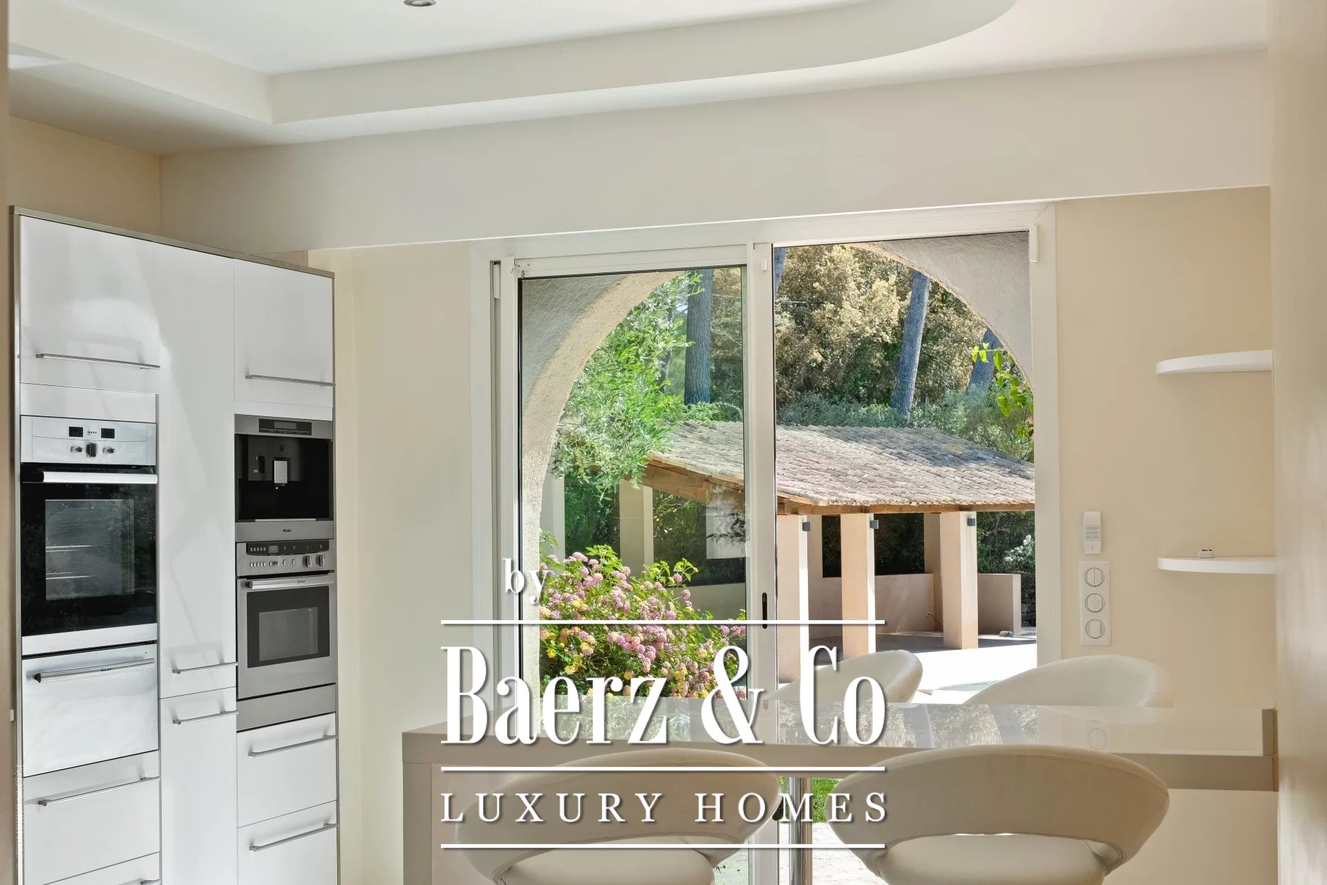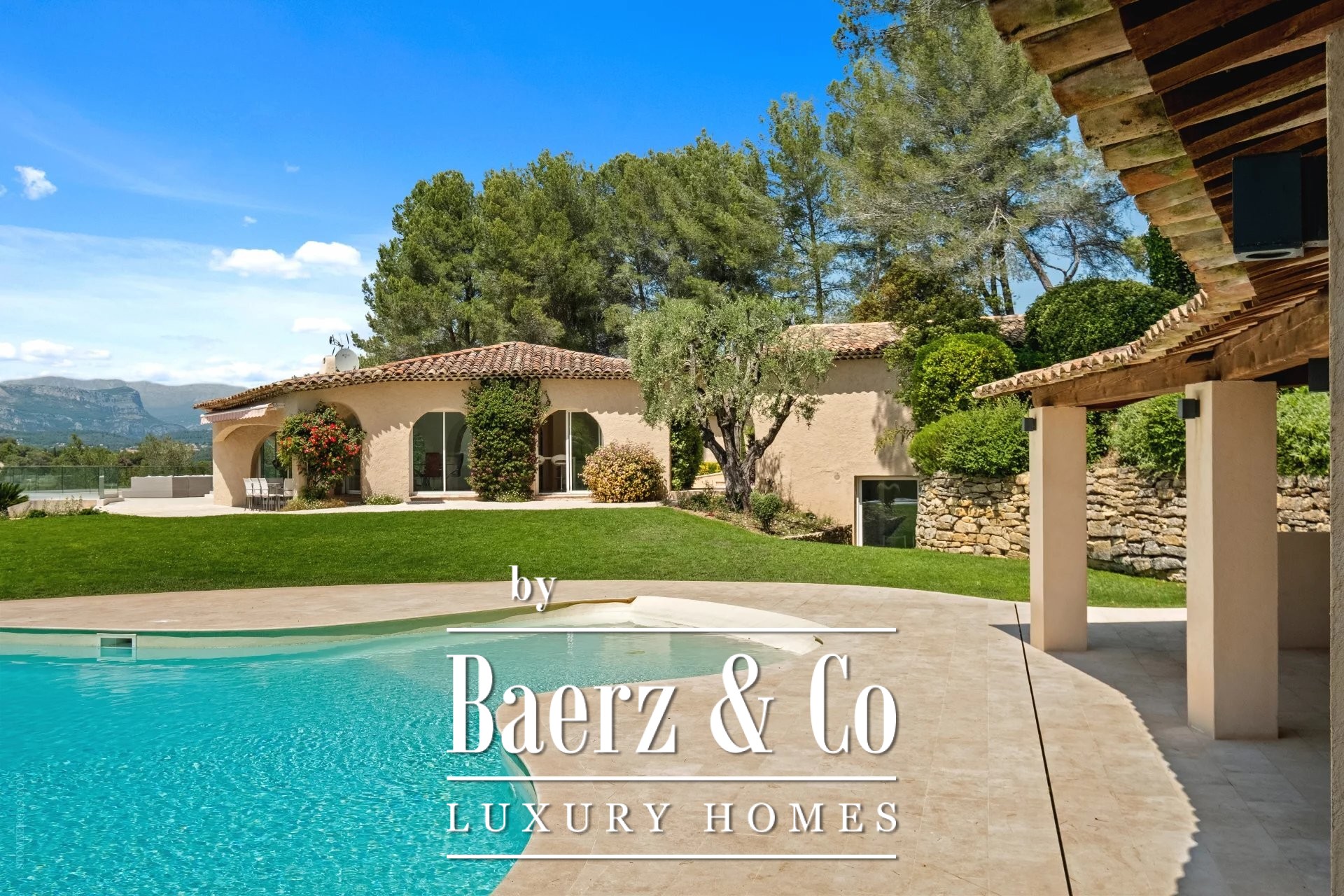 Outdoors, a sculpted free-form swimming pool is complemented by a pool house and jacuzzi, inviting quiet recreation or discreet entertaining. Air-conditioning, sliding windows, an alarm system, and a two-car garage with ample parking add to the comfort and security. This luxury villa for sale in Mouans-Sartoux is shaped for those who value both design pedigree and tranquil vistas.
