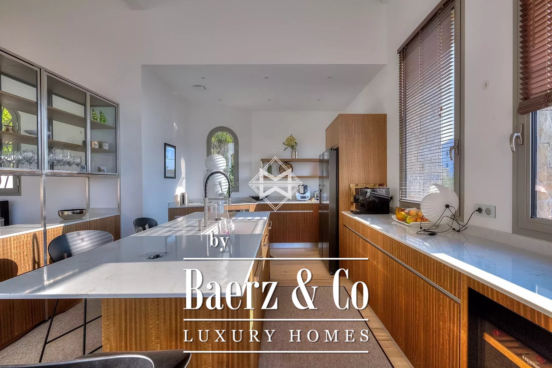 Arranged over two levels, the main house delivers four bedrooms, with an additional fully furnished independent studio of 40 m² that amplifies flexibility and privacy. The garden level flows seamlessly between a large living and dining room, an office space, and a serene master suite with dressing room, en suite bath and shower, all spilling directly onto a sunlit terrace and the elegant saltwater pool.