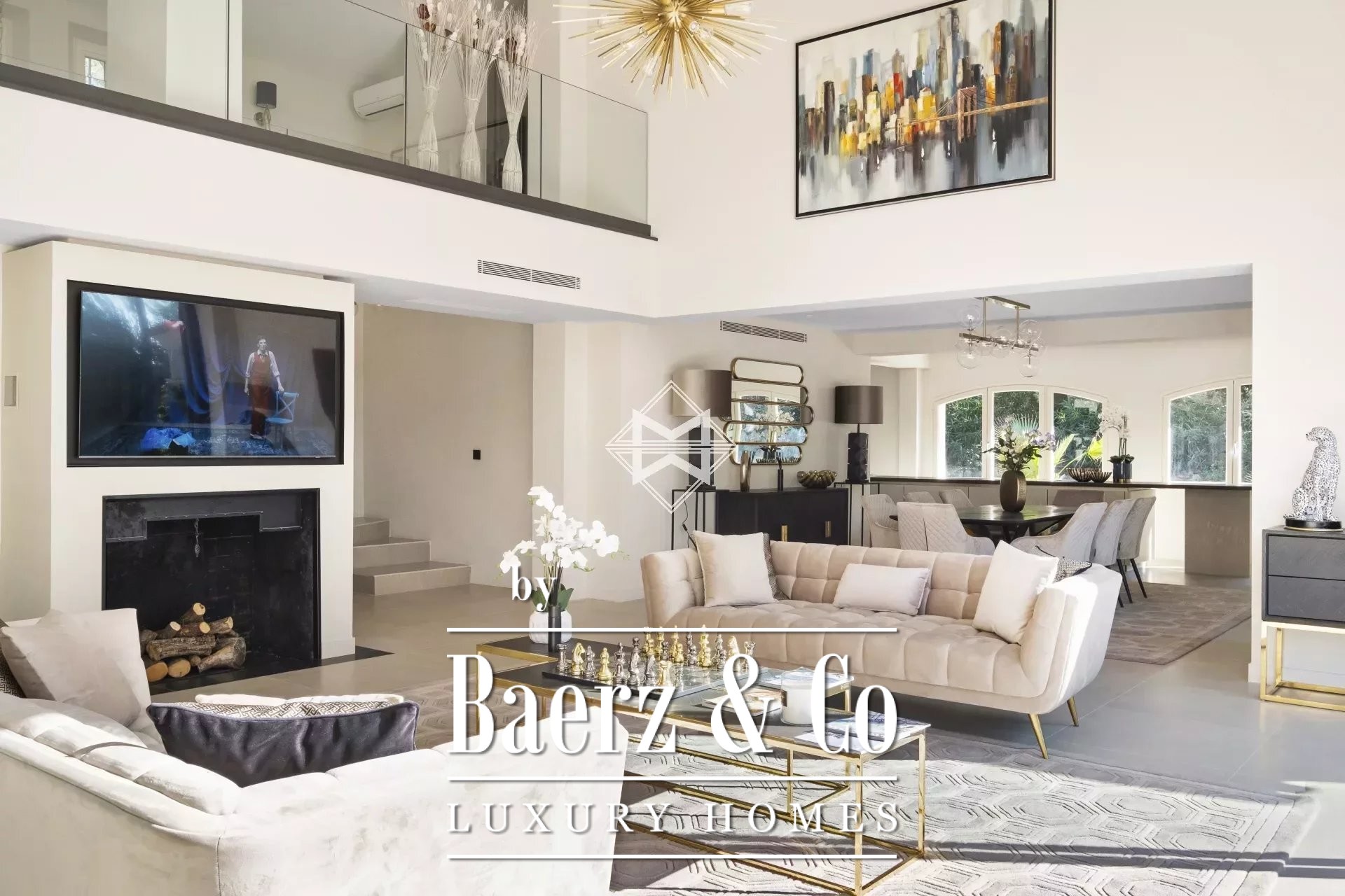 A cathedral-style living room with fireplace anchors the home, opening to a relaxation area and a seamlessly integrated open kitchen with dining space. On the garden level, a master bedroom suite combines a spacious dressing area and bathroom, ensuring privacy and ease. Four additional bedrooms provide ample accommodation, all oriented toward lush greenery, with views that quiet the mind.