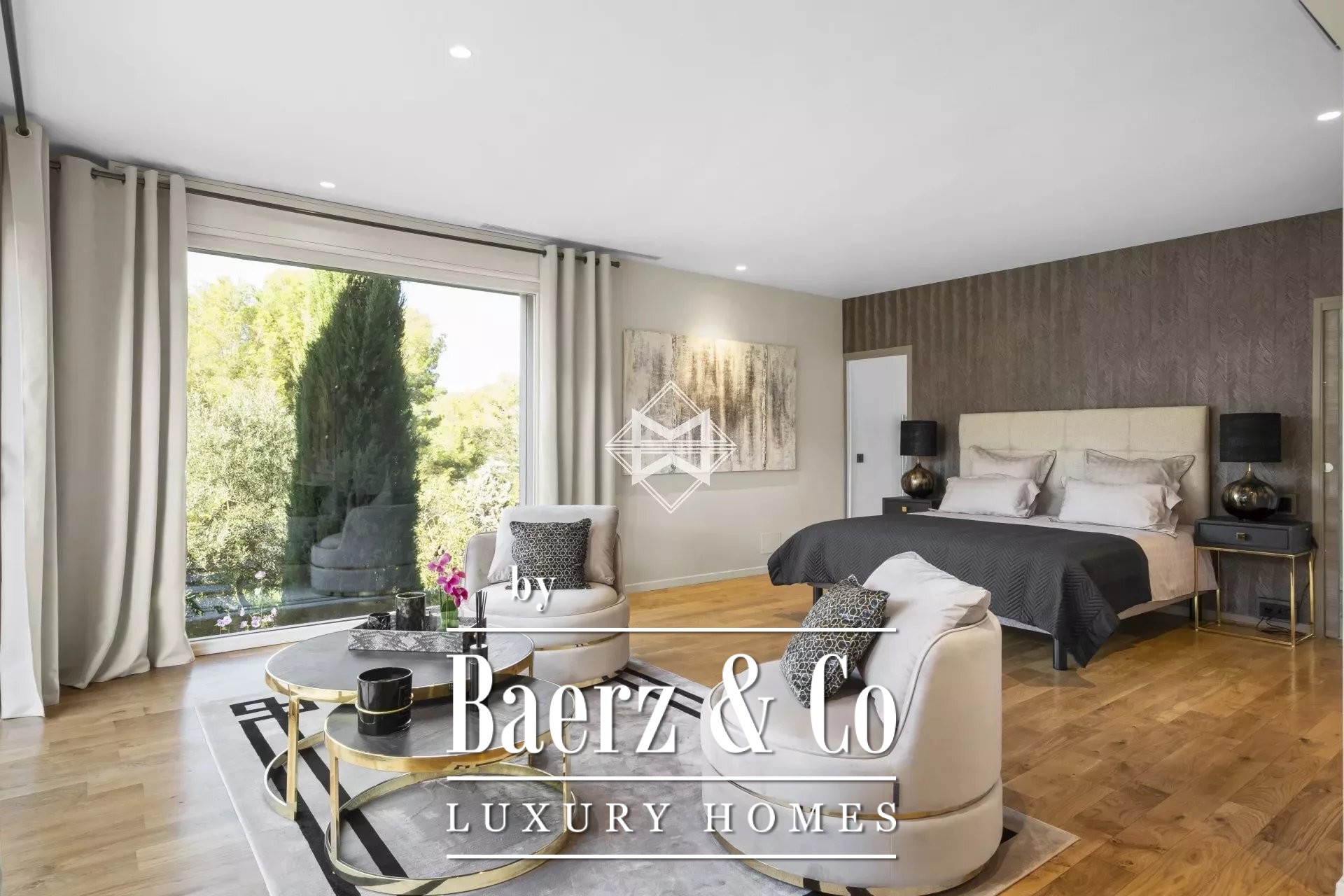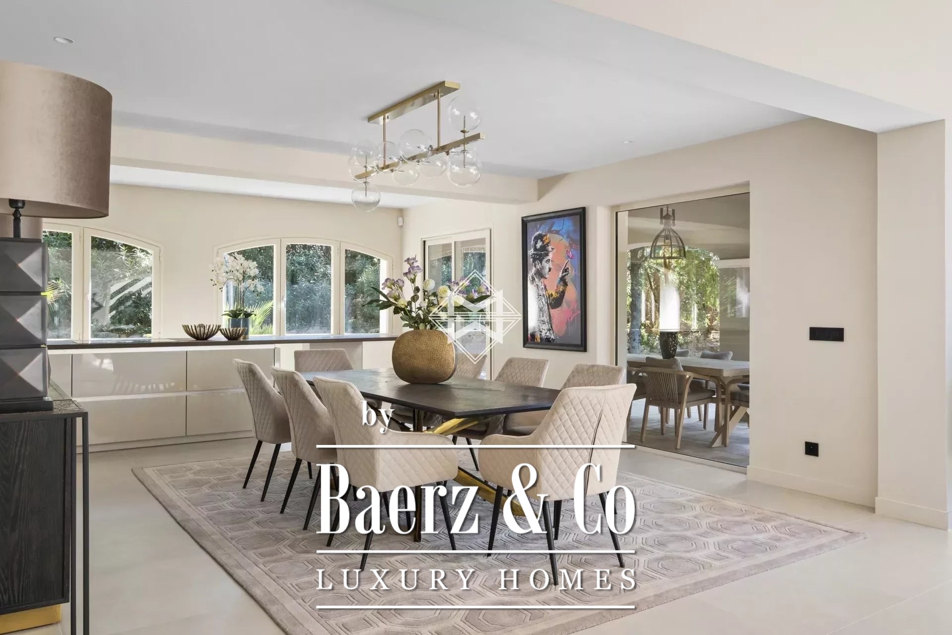 Villa Mougins with pool and garden views is situated on 3,586 m² of private land, blending Provençal heritage with contemporary living. The property offers 430 m² of interior space arranged for both comfort and generous light, with large windows framing the garden and bathing each room in sunlight.
