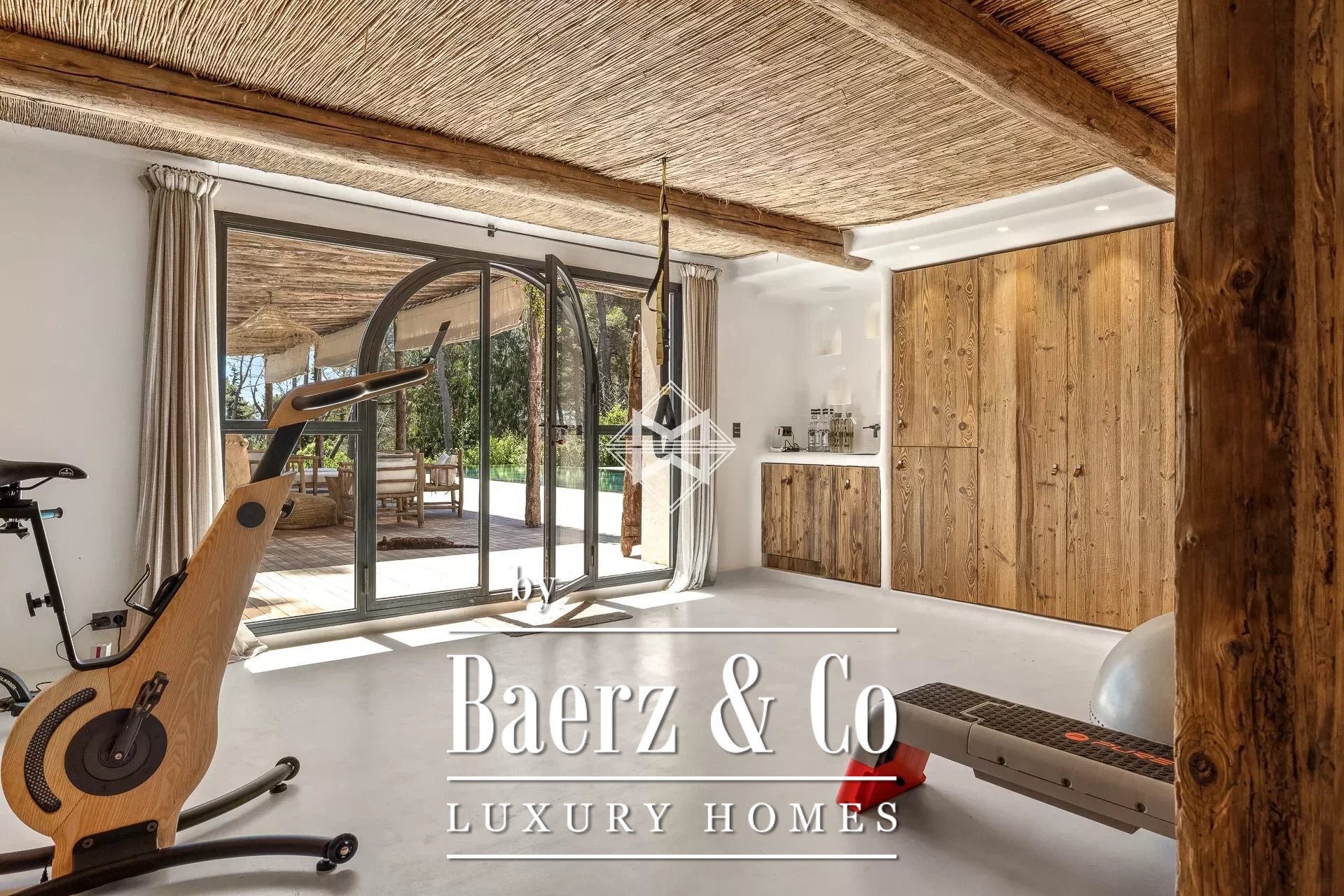 Across six bedrooms, including a serene master suite with office and dressing room, the spatial rhythm is generous yet composed. The wellness area is a private haven, integrating a gym, sauna, hammam, and direct connection to the pool terrace. Entertaining flows outdoors to a landscaped expanse of 4,495 m², where Mediterranean flora surrounds a spacious swimming pool and pool house, inviting a pace attuned to the Southern French climate.