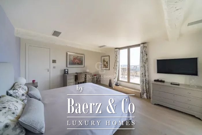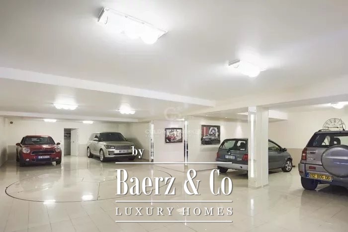 On the lower level, a self-contained flat overlooks landscaped grounds. Indulgent amenities include a gym with leading equipment, a wellness area with sauna and jacuzzi, a wine cellar, and an eight-car garage with a rotating platform. Furnished for refined comfort, this villa for rent in Mougins provides discreet luxury and direct access to local shops, making it an ideal contemporary retreat.