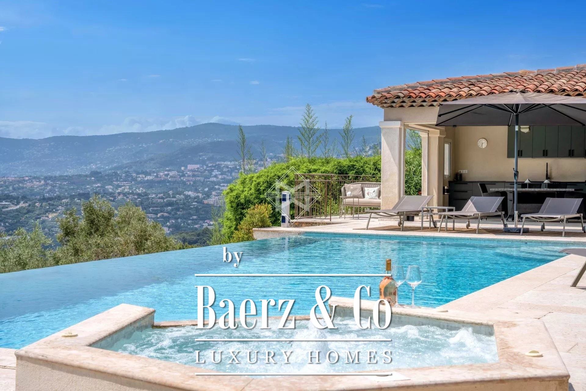 Villa Mougins with panoramic sea and hill views stands quietly in the heart of Castellaras, within an exclusive cul-de-sac that heightens its sense of seclusion. This Provençal stone property offers nearly 223 m² of interior space, where the living area opens onto deep, shaded terraces, inviting both gathering and solitude amid Mediterranean light.