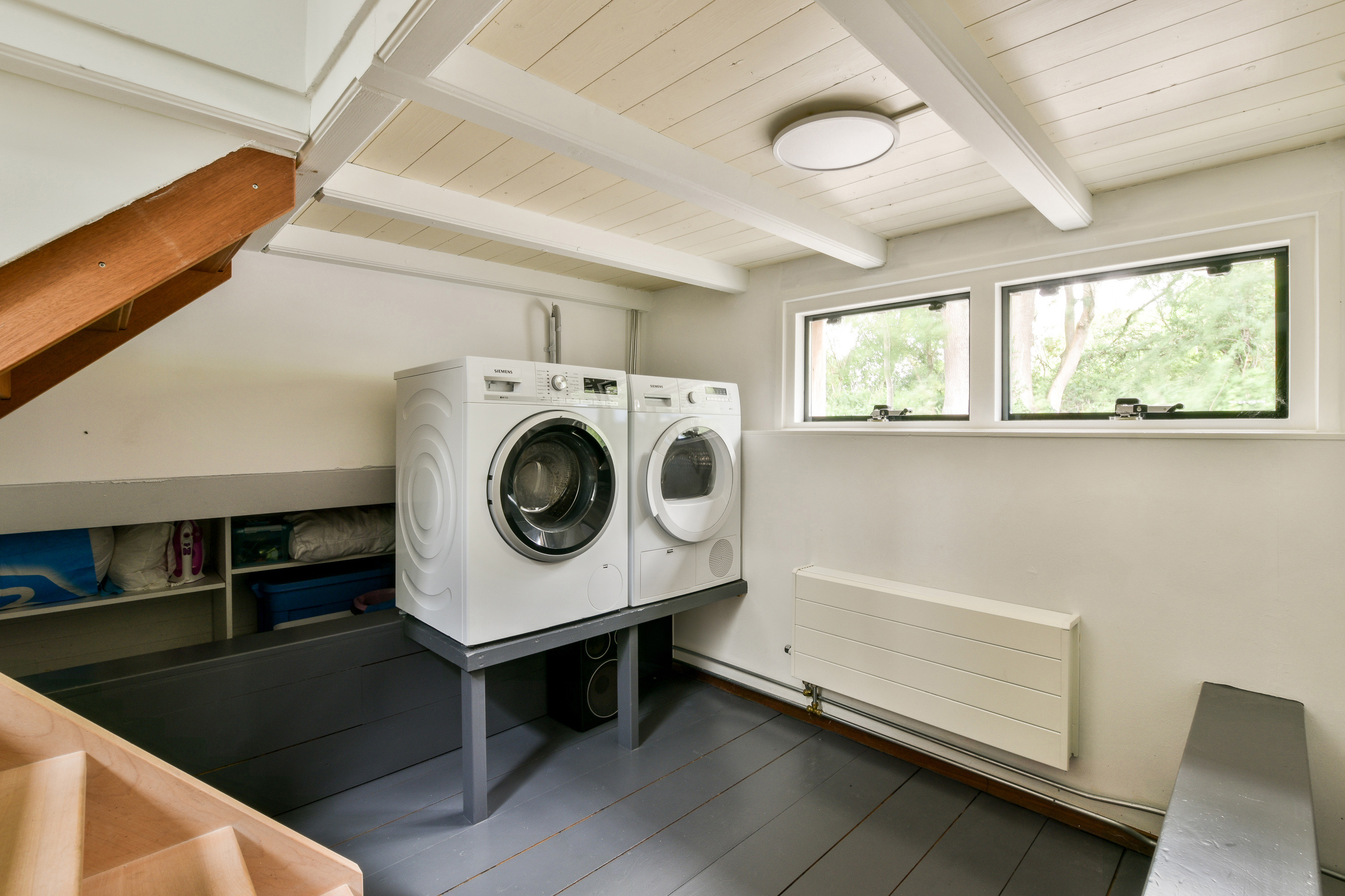 In addition, the houseboat has a second bedroom suitable as a guest room, children’s room or office. The lower level (basement) includes a third room that can also serve as a bedroom, alongside a practical storage/laundry room with connections for a washing machine and dryer. Thanks to the layout and quiet location, these rooms provide comfortable spaces for sleeping, working or relaxing.