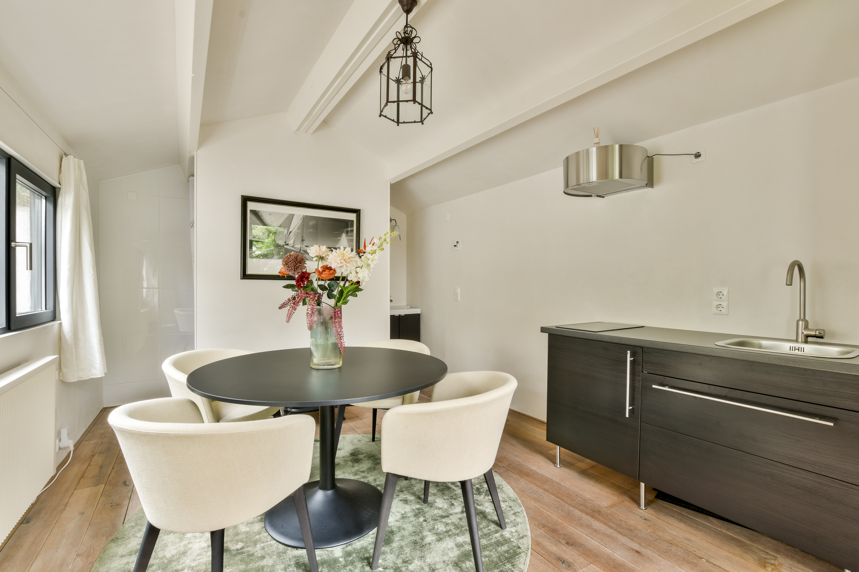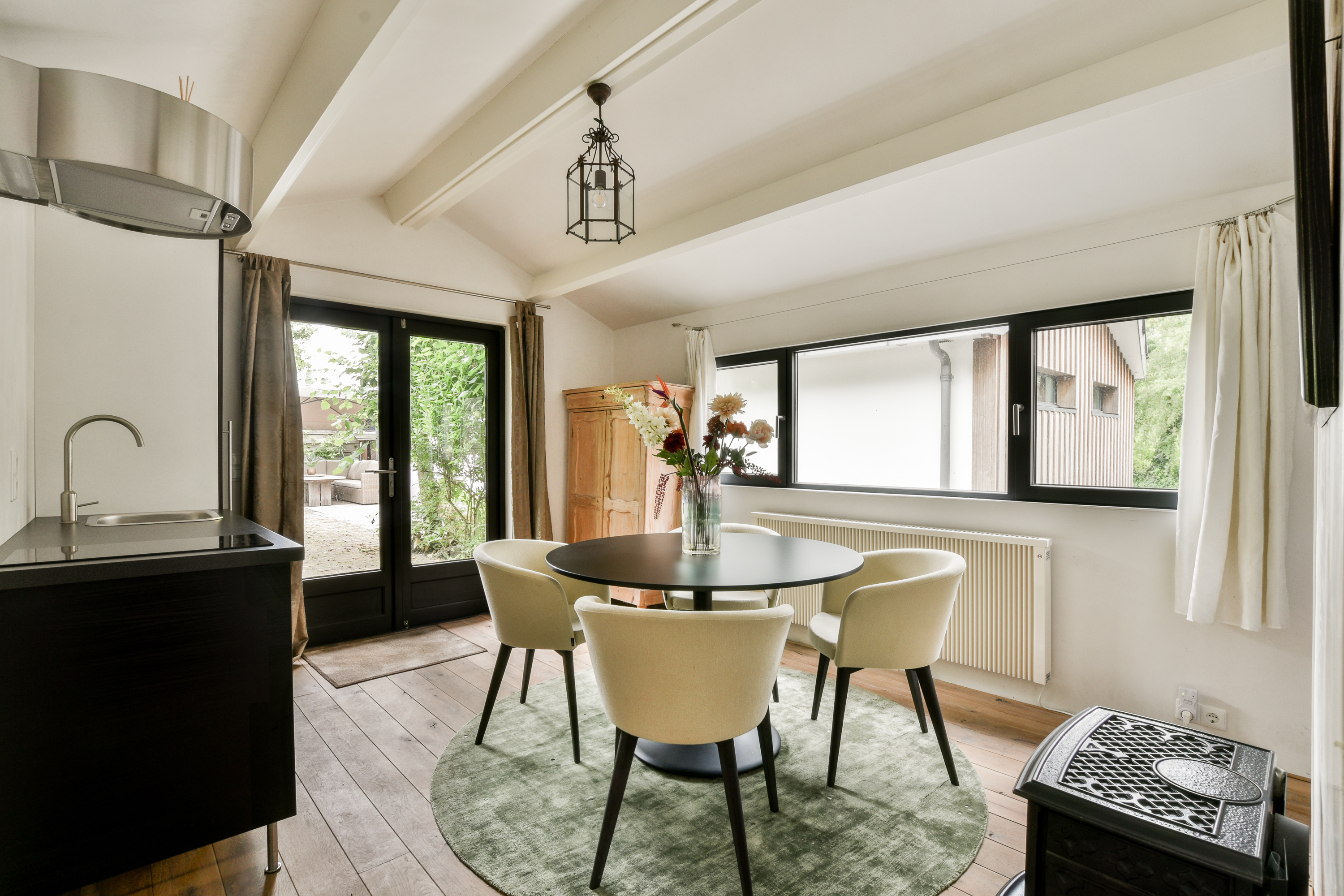 The spacious kitchen is equipped with modern appliances and designed with both functionality and atmosphere in mind.