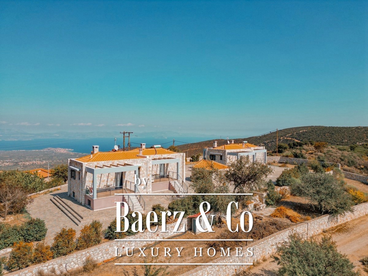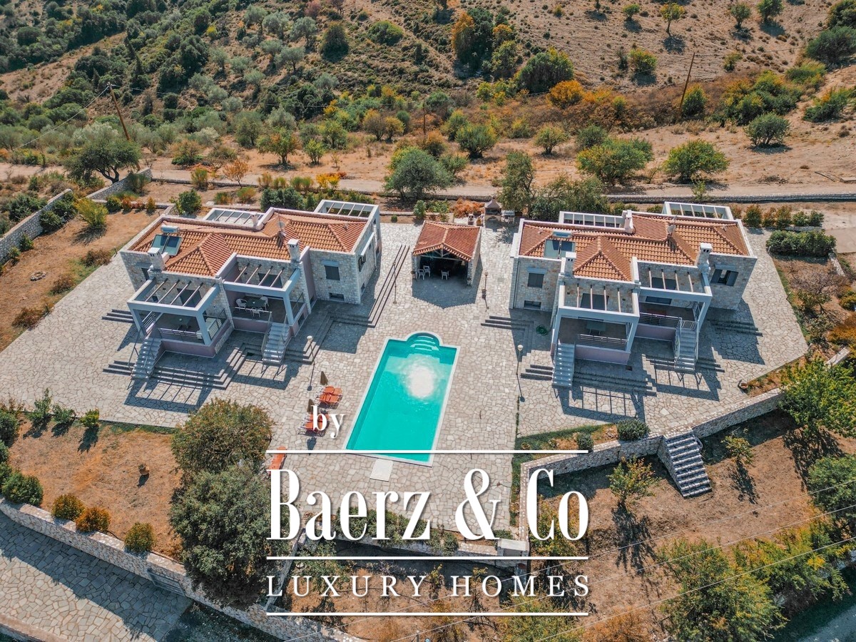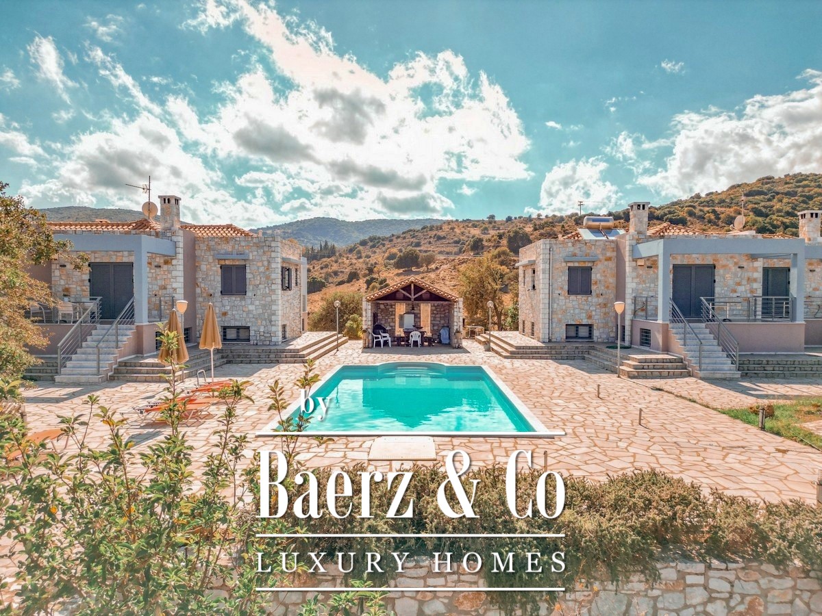 Bedroom suites vary: two villas contain two master bedrooms and a bathroom, while two others offer three bedrooms, including a master, and two bathrooms each. Across all, the total is six bedrooms and twelve bathrooms, quietly supporting comfort and privacy. Security alarm, autonomous heating, fan coil systems, air conditioning, and a solar water system are integrated discreetly for modern ease. The complex is 11 km from Astros, 15 km from the sea, and 44 km from Nafplio, situating it as a tranquil retreat with strategic access. For those seeking a luxury villa for sale in Oreini Meligou, this enclave stands as a testament to restrained elegance and investment potential.