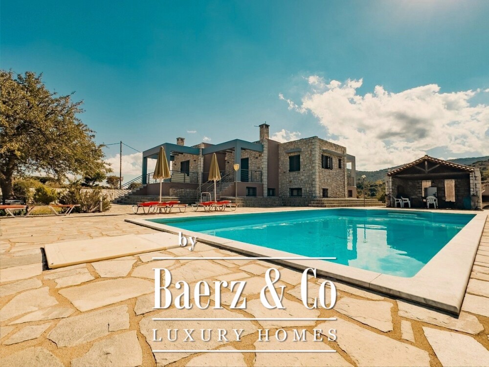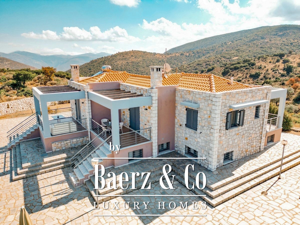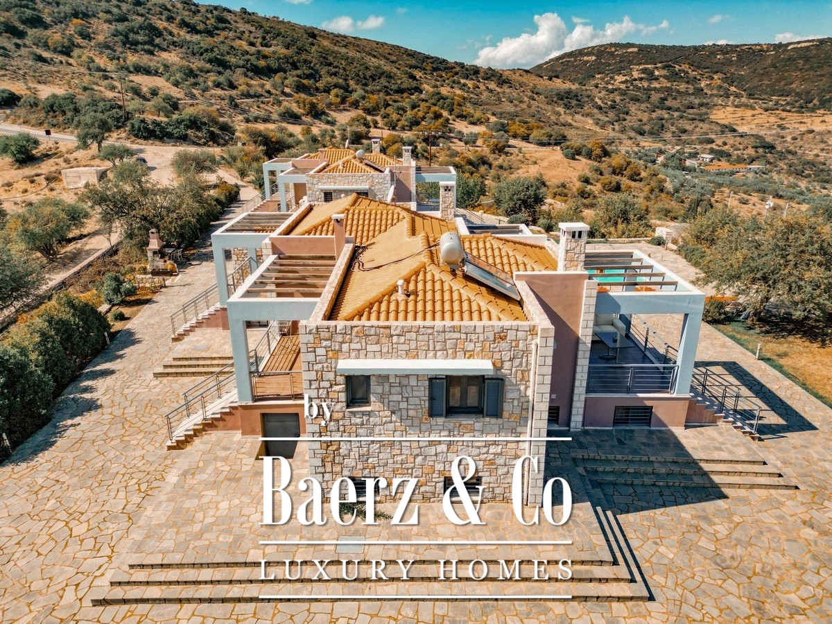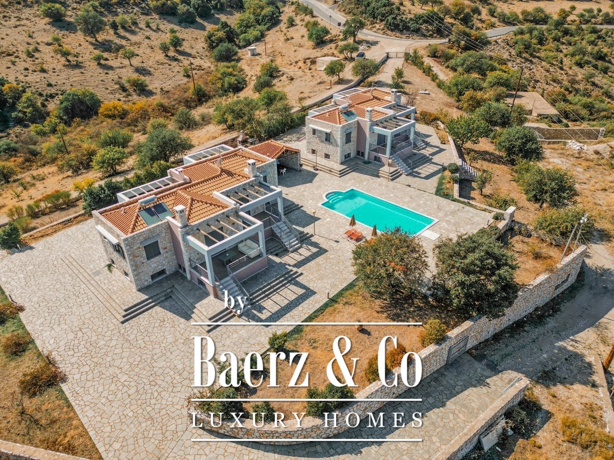 Bedroom suites vary: two villas contain two master bedrooms and a bathroom, while two others offer three bedrooms, including a master, and two bathrooms each. Across all, the total is six bedrooms and twelve bathrooms, quietly supporting comfort and privacy. Security alarm, autonomous heating, fan coil systems, air conditioning, and a solar water system are integrated discreetly for modern ease. The complex is 11 km from Astros, 15 km from the sea, and 44 km from Nafplio, situating it as a tranquil retreat with strategic access. For those seeking a luxury villa for sale in Oreini Meligou, this enclave stands as a testament to restrained elegance and investment potential.