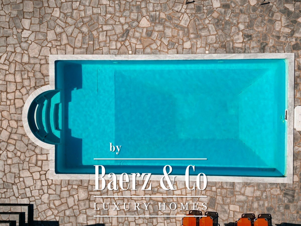 Within each villa, stone-built walls, marble floors, and custom-built cabinetry combine modern craftsmanship with enduring Greek materials. Large terraces, paved courtyards, and a 50 m² pool encourage outdoor living, surrounded by a landscaped garden enhanced with a barbecue and covered dining area. The interiors feature a bright living room anchored by a fireplace, seamlessly connected to a fully equipped kitchen and an integrated dining area with direct access to the pool and terraces. Double glazed aluminum frames ensure not only thermal comfort but also a bright, airy atmosphere throughout.