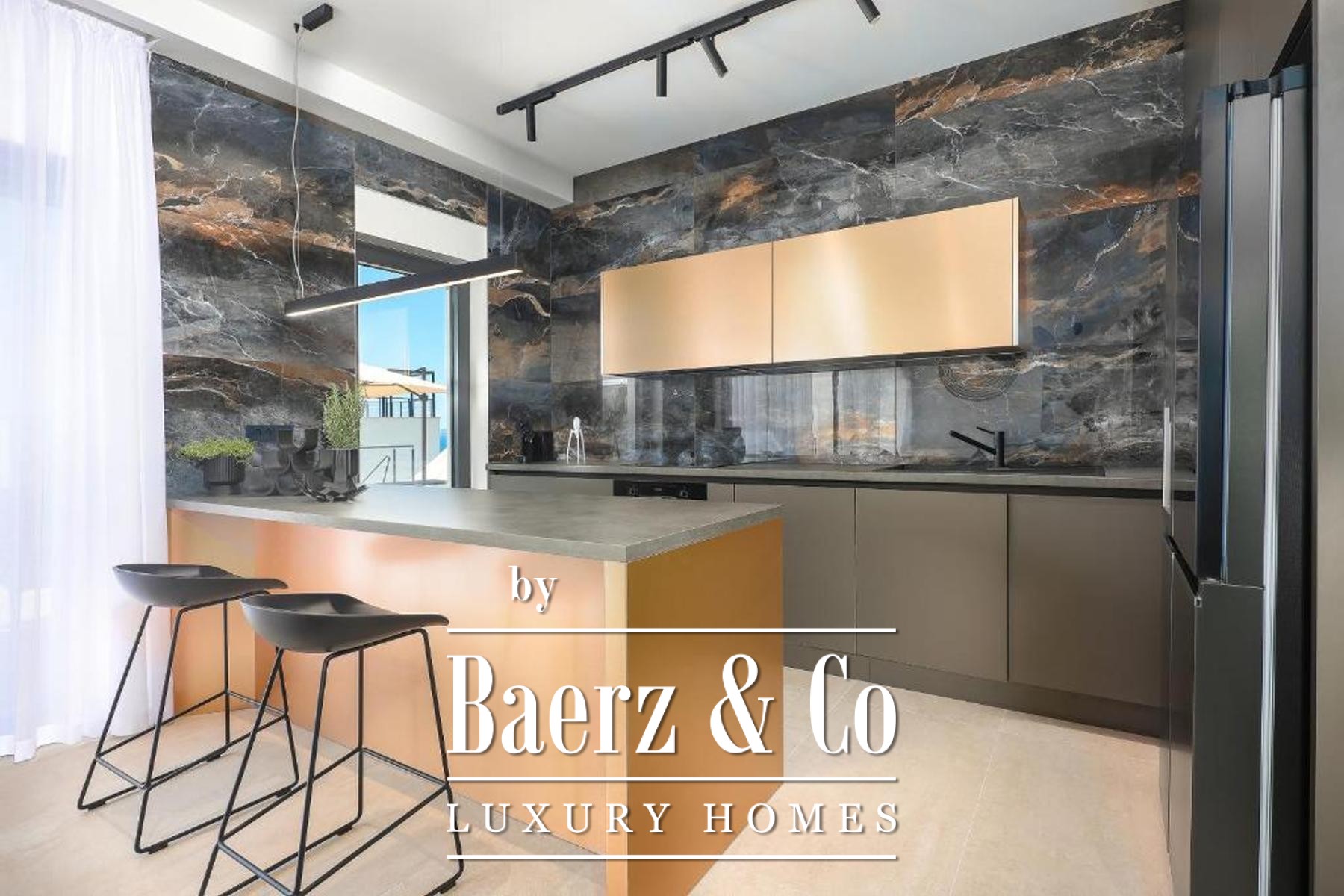 Four bedrooms, each with a private en-suite bathroom, create a rhythm of comfort and seclusion; the primary spaces are designed for effortless movement between indoors and outdoor terraces. Details include Schüco joinery, Bosch built-in appliances, Luceplan and Tom Dixon lighting, Hansgrohe fittings, and furniture from Natuzzi, Kare Design, BoConcept, Kartell, plus custom pieces. The entire villa is unified by elegant ceramic flooring and benefits from Toshiba air-conditioning and Samsung media installations.
