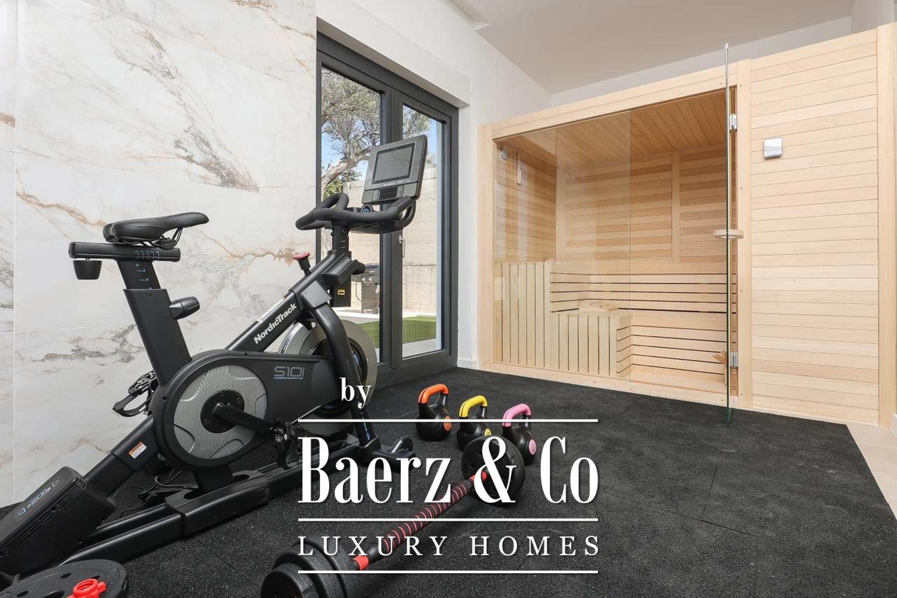Outdoor living is equally refined, with a heated swimming pool, wellness area featuring sauna and gym, multiple terraces, and amenities for children. Security is assured with video surveillance inside and out, and the fully fenced Mediterranean gardens assure a private retreat. Set within the peaceful pace of Jakišnica—near the ancient Lun olive groves and just minutes from Novalja—this property offers rare tranquility, authenticity, and exclusivity for those seeking a luxury townhouse for sale in Novalja.