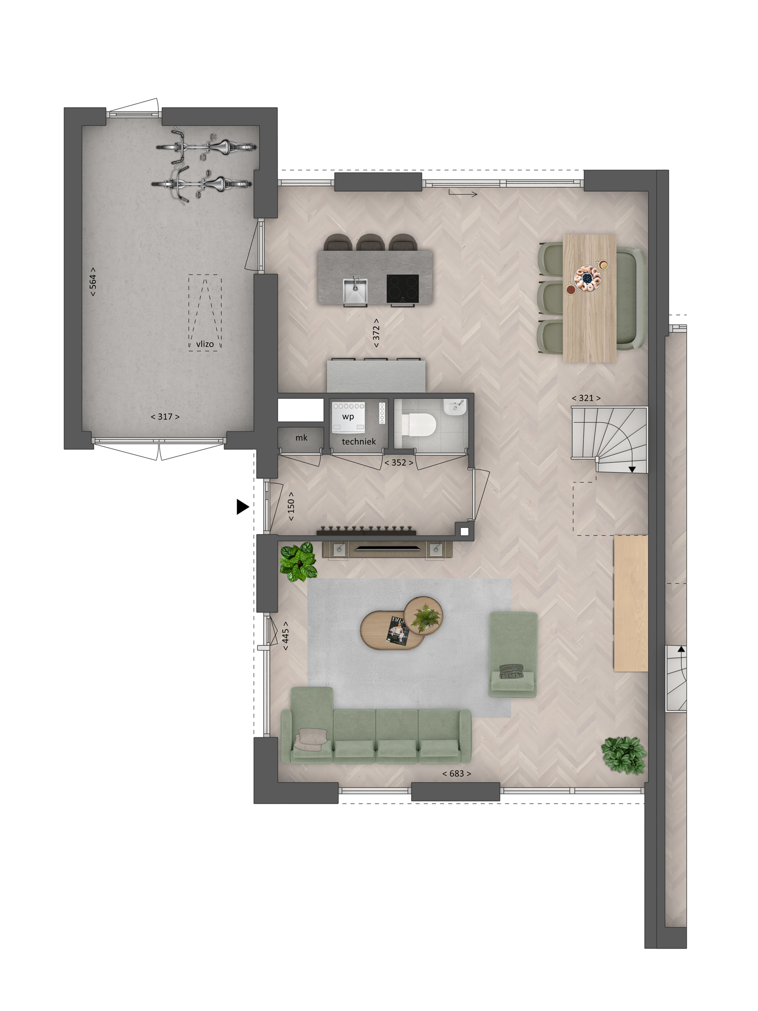 Een karakteristieke woning met houtaccenten en opvallend veel raampartijen! Landelijk en toch modern. Even binnenkijken? Via de voordeur aan de zijkant stap je de hal binnen met toegang tot de meterkast, woonkamer en het toilet. In het open c-vormige woongedeelte staan koken, eten en wonen gezellig met elkaar in verbinding. Koken doe je in de keuken aan de achterkant van de woning. In de zomer zet je de schuifpui naar de achtertuin op het zuid-oosten open en verbindt je het binnen leven met buiten. Zet een lekkere grote eettafel neer voor het hele gezin om lang aan te tafelen. In de woonkamer is genoeg plek voor een gezellige zithoek met een loungebank en grote fauteuil. In de stenen berging heb je ruimte voor de fietsen of tuingereedschap, hoe fijn is dat!