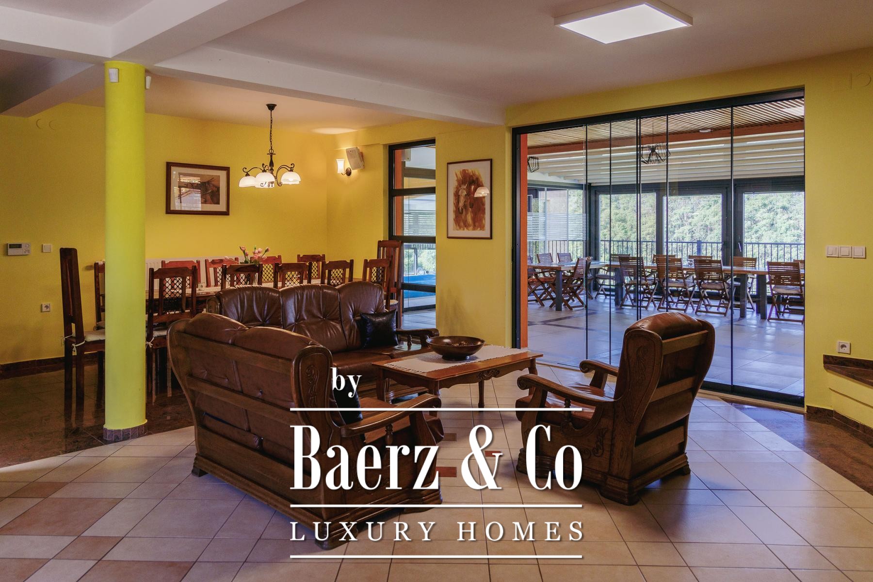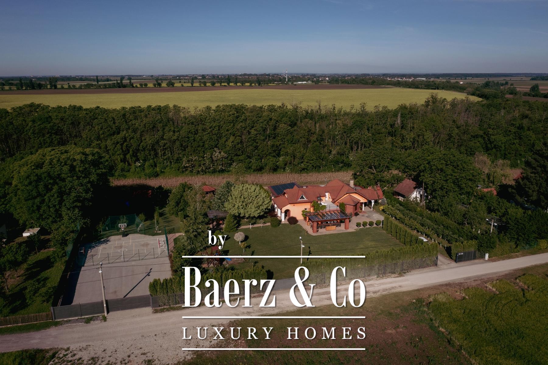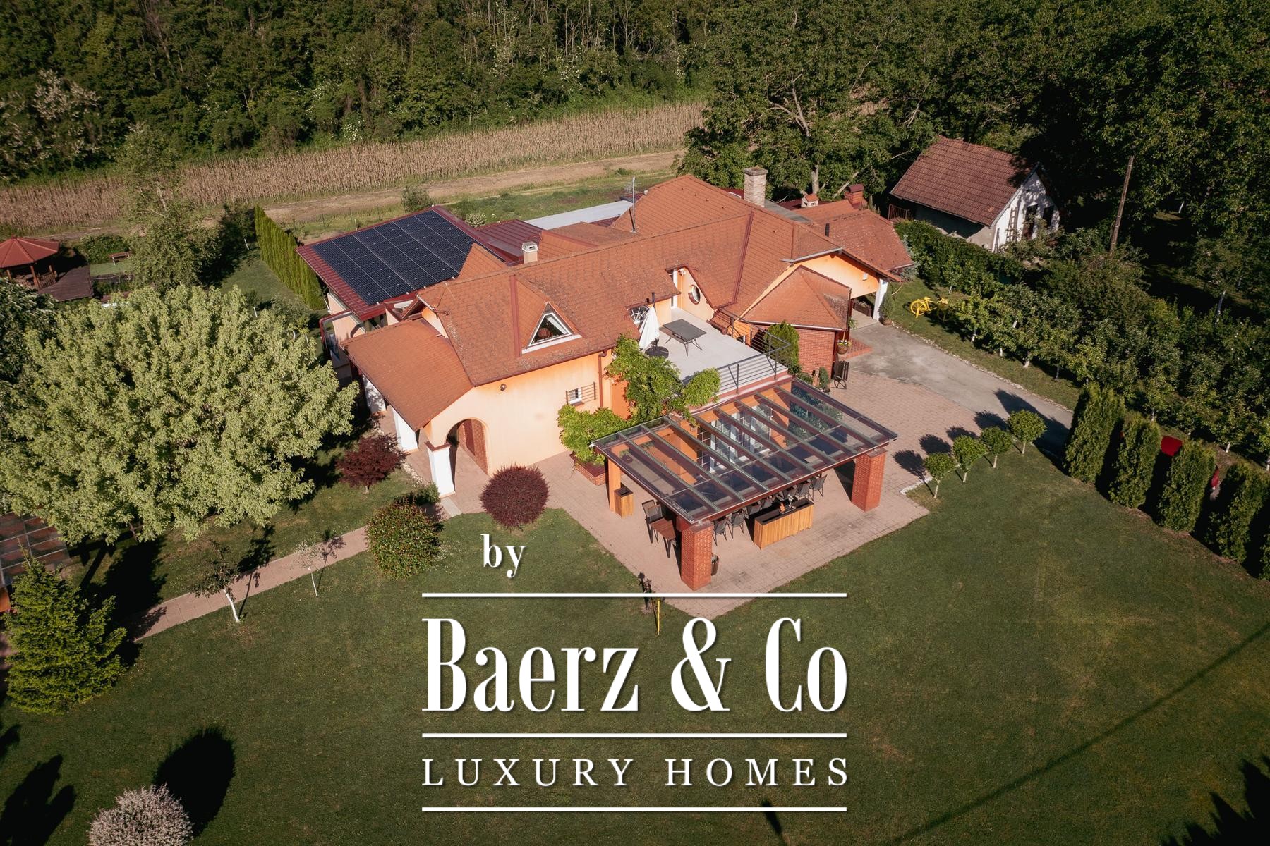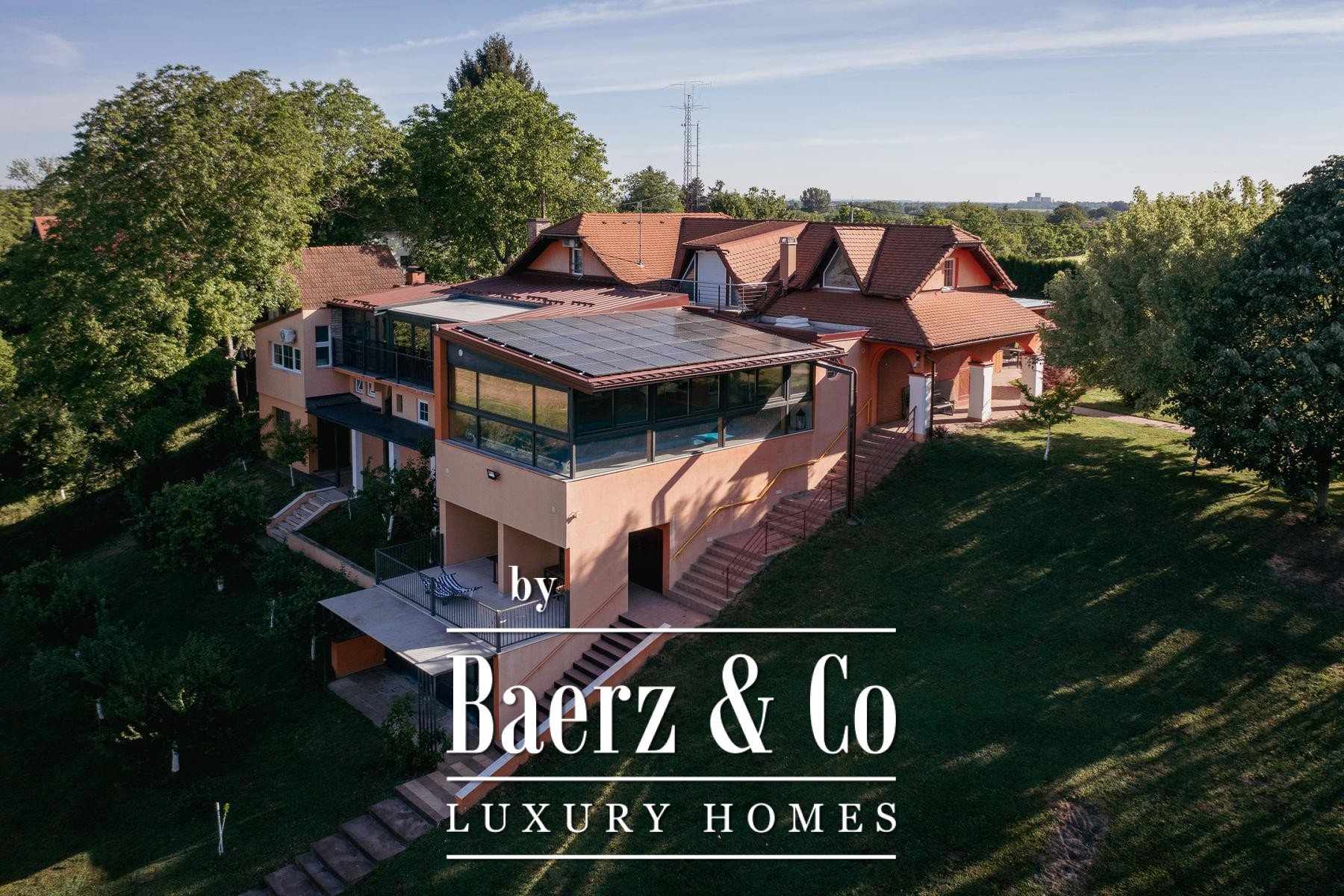 The attic provides a separate living zone with its own lounge, two bedrooms, a bathroom, and a spacious terrace offering a panoramic view across the Slavonian plain. Throughout the villa, robust infrastructure supports comfort and autonomy, including combi gas boiler central heating, electric underfloor zones, multiple air conditioning units, and solar panels fulfilling most electricity needs.