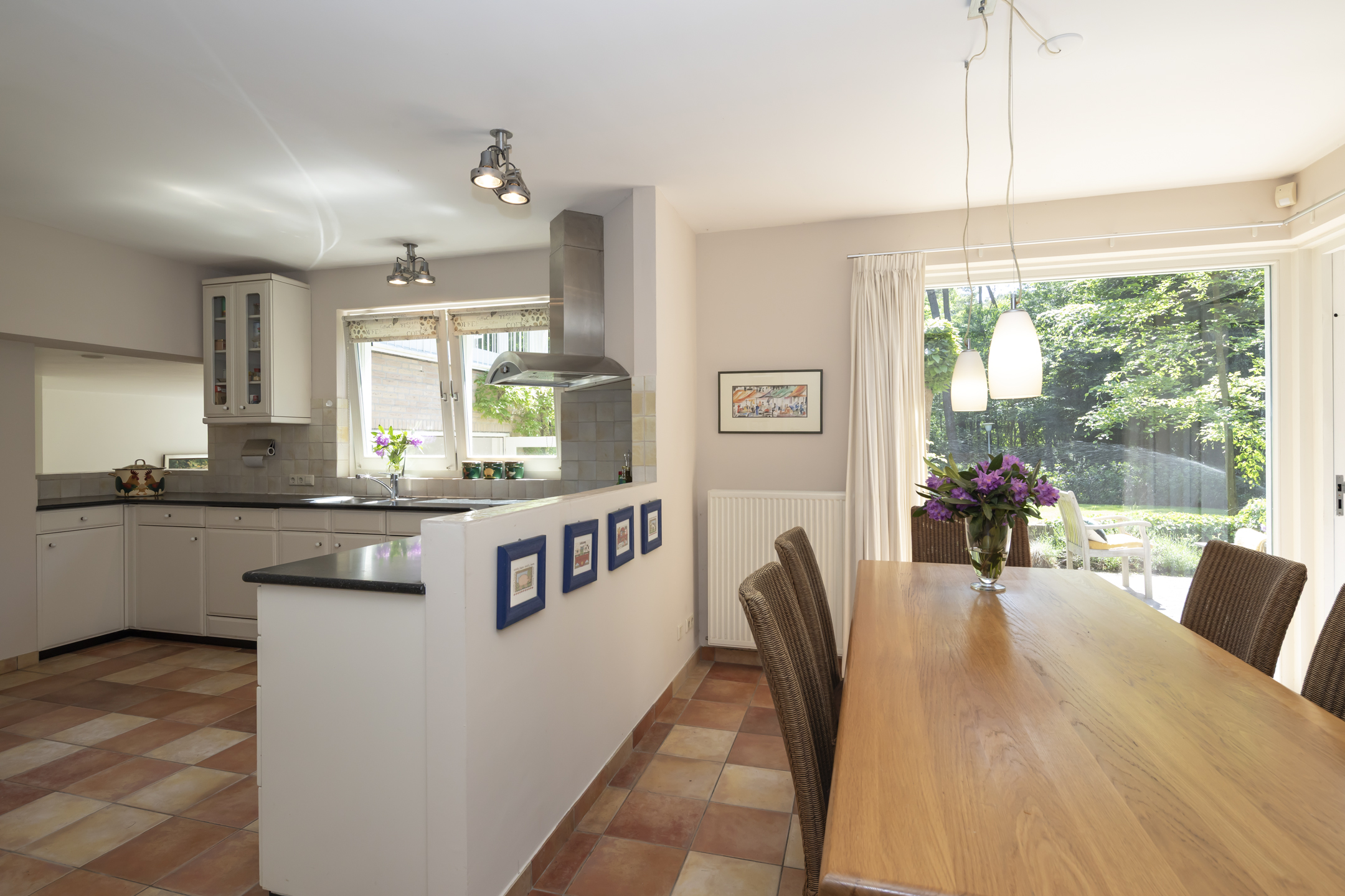 The attractive living room with fireplace is wonderfully light thanks to the large windows and has a view of the fantastic garden. The double large sliding doors provide access to the spacious covered terrace.