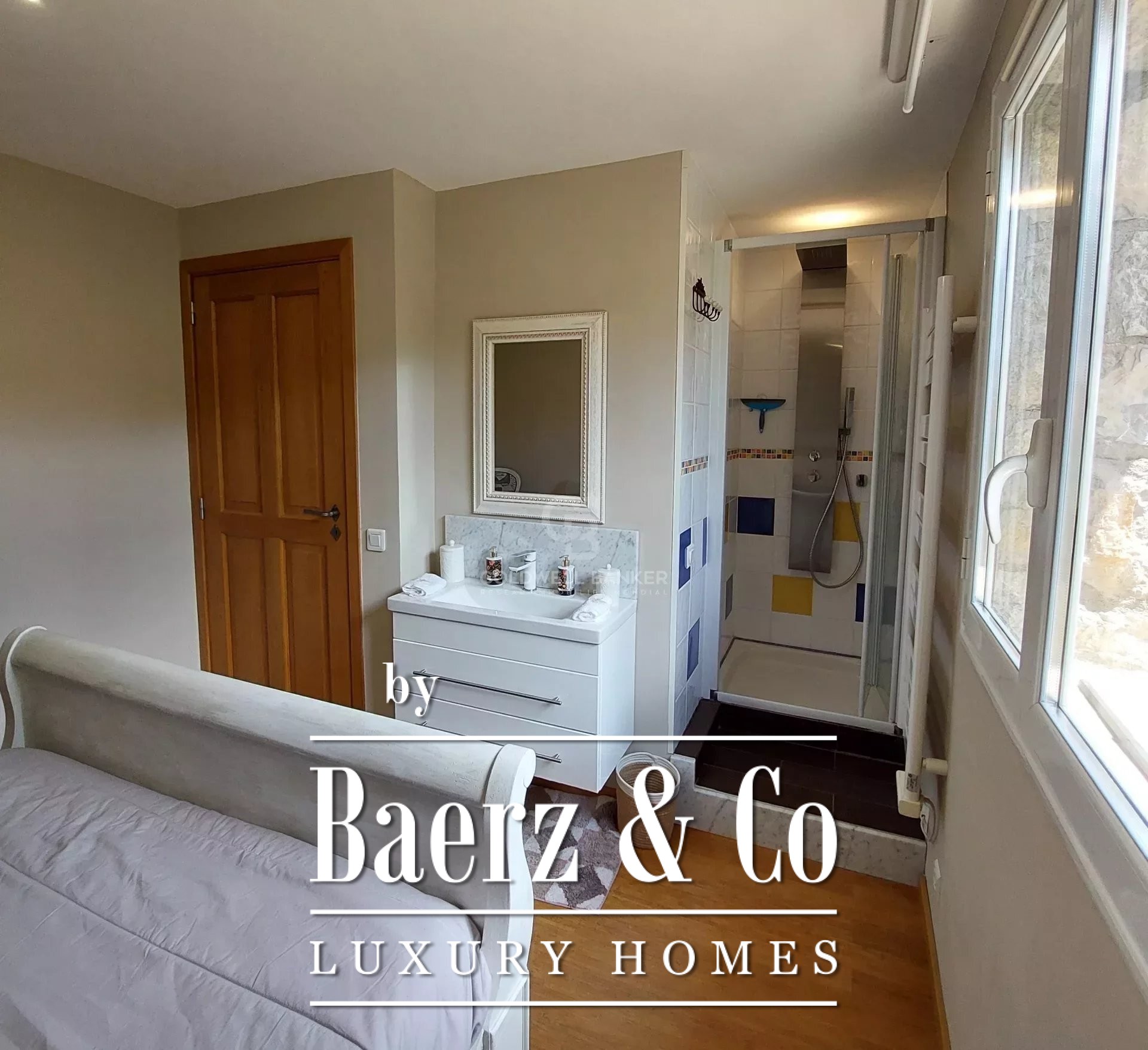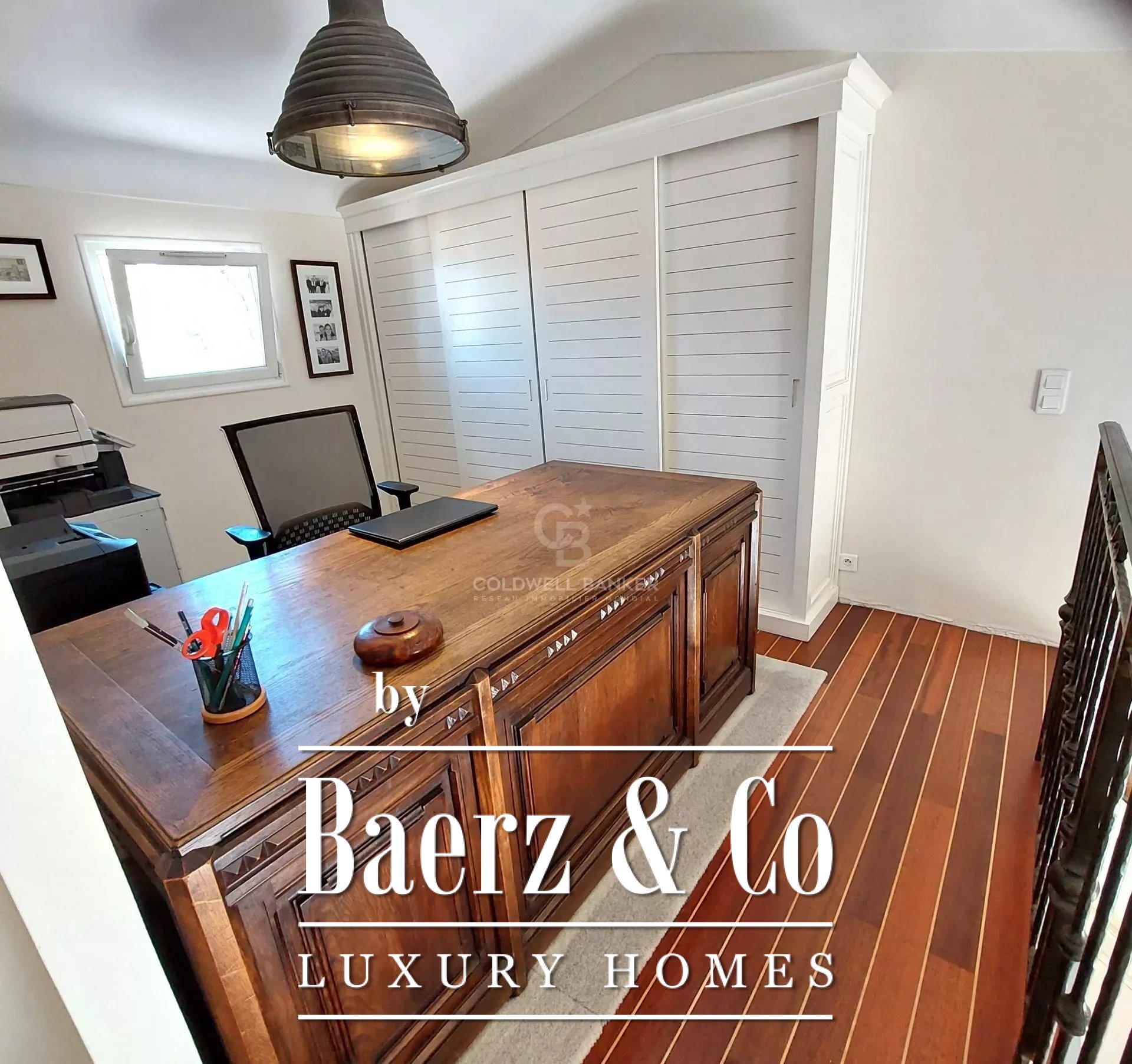 Inside, the ground floor unfolds with a dining room centered by a fireplace with integrated Godin stove, a fully equipped kitchen, and two bedrooms, including one en suite. Solid oak doors, double glazing, and insulated white aluminum sliding windows underpin the quality of finishes. A further bedroom with rooftop terrace is accessed from the first-floor mezzanine study, while a private, air-conditioned 42 m² apartment on the garden level offers distinct independence with living, kitchen, bedroom, cabin space, and terrace, adaptable for rental or guest use.
