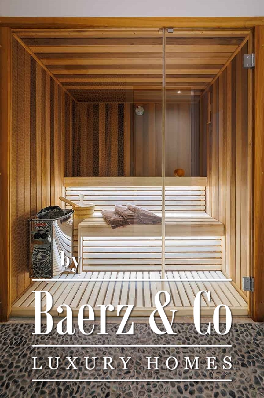 Terraces define the rhythm of daily life, one with a heated swimming pool and hot tub, the other hosting a covered dining table for meals that flow from sunlit breakfast to midnight cocktails, all overlooking the sea. The basement master suite is marked by distinctive natural light filtered through the pool, while amenities such as air conditioning, heat pump, and autonomous heating provide year-round comfort. The property also offers a sauna and double-glazed insulation.