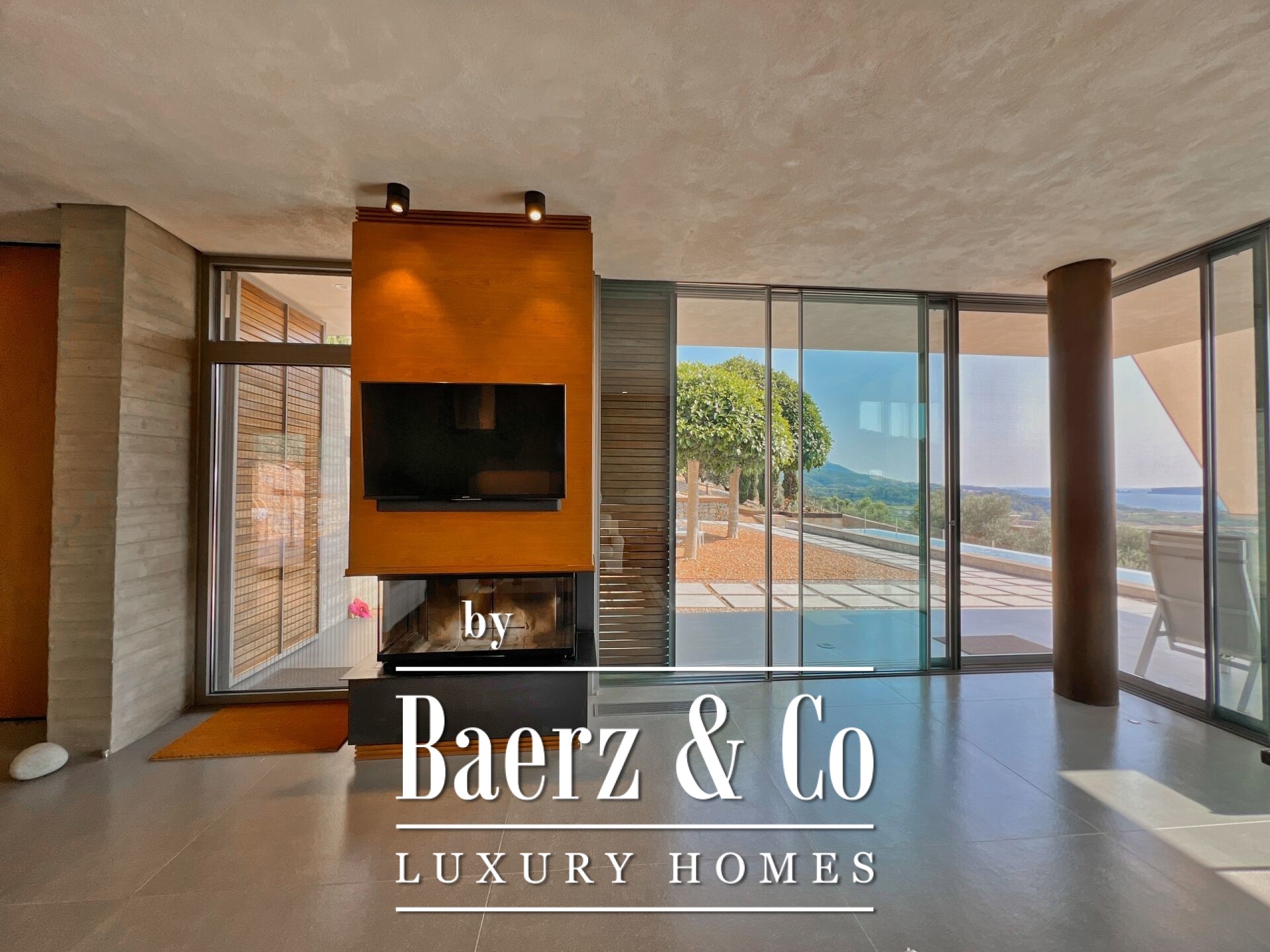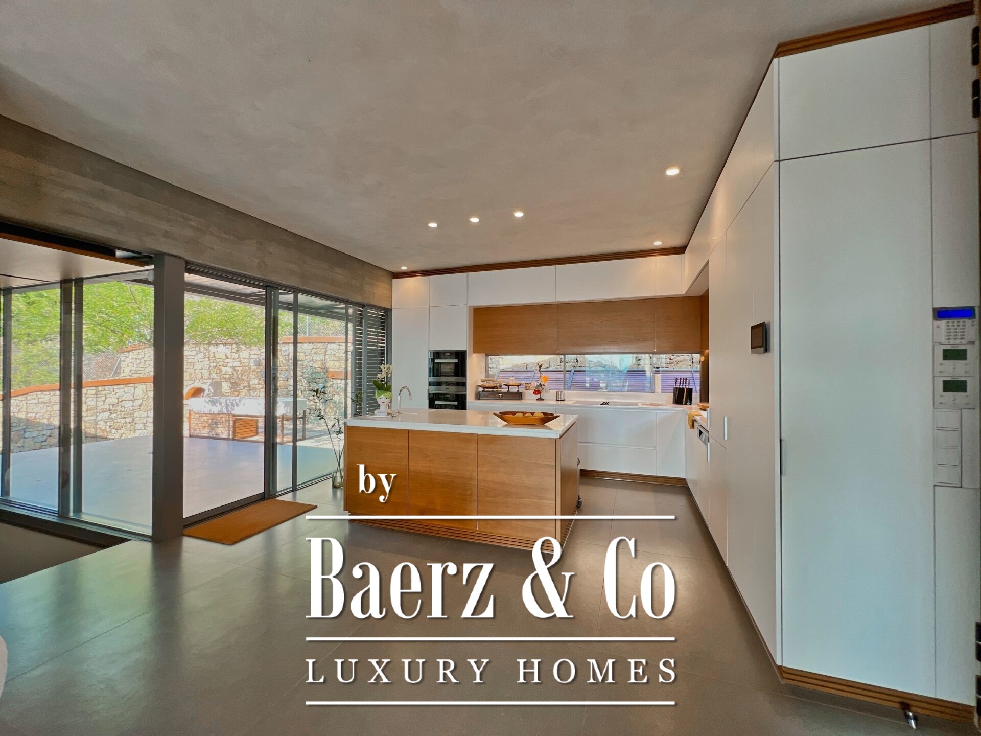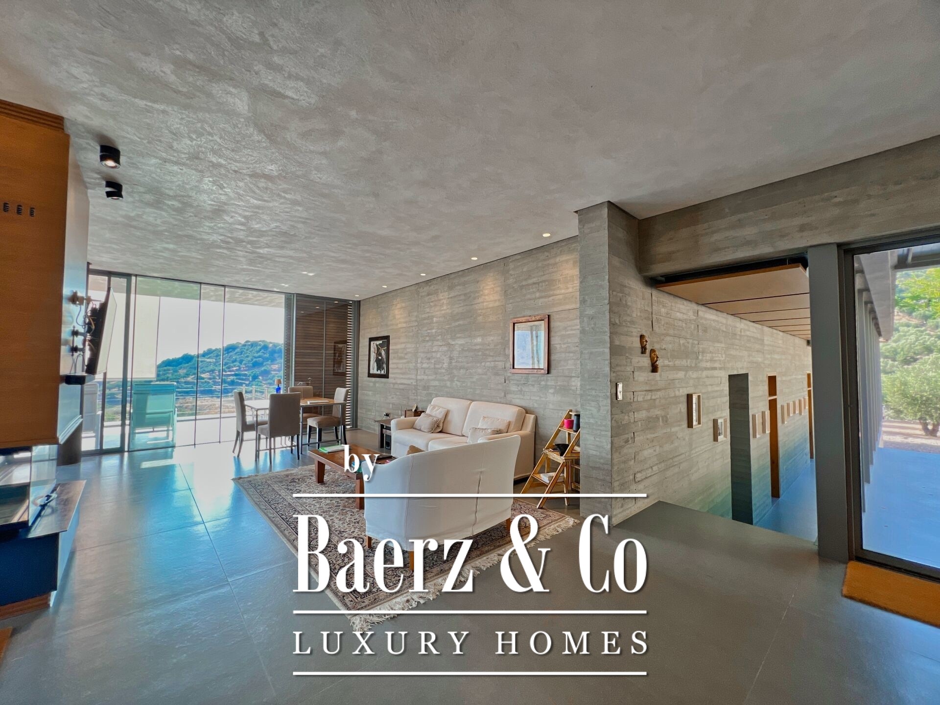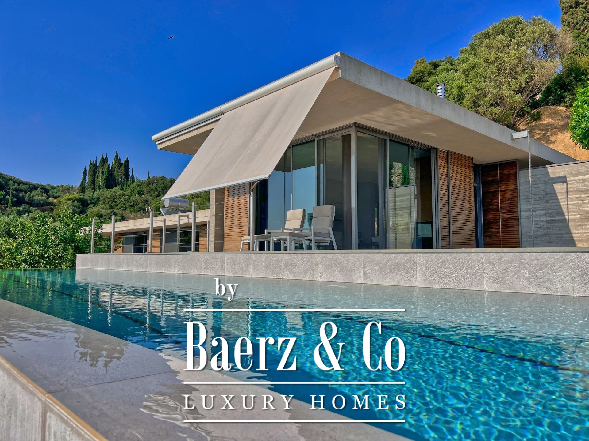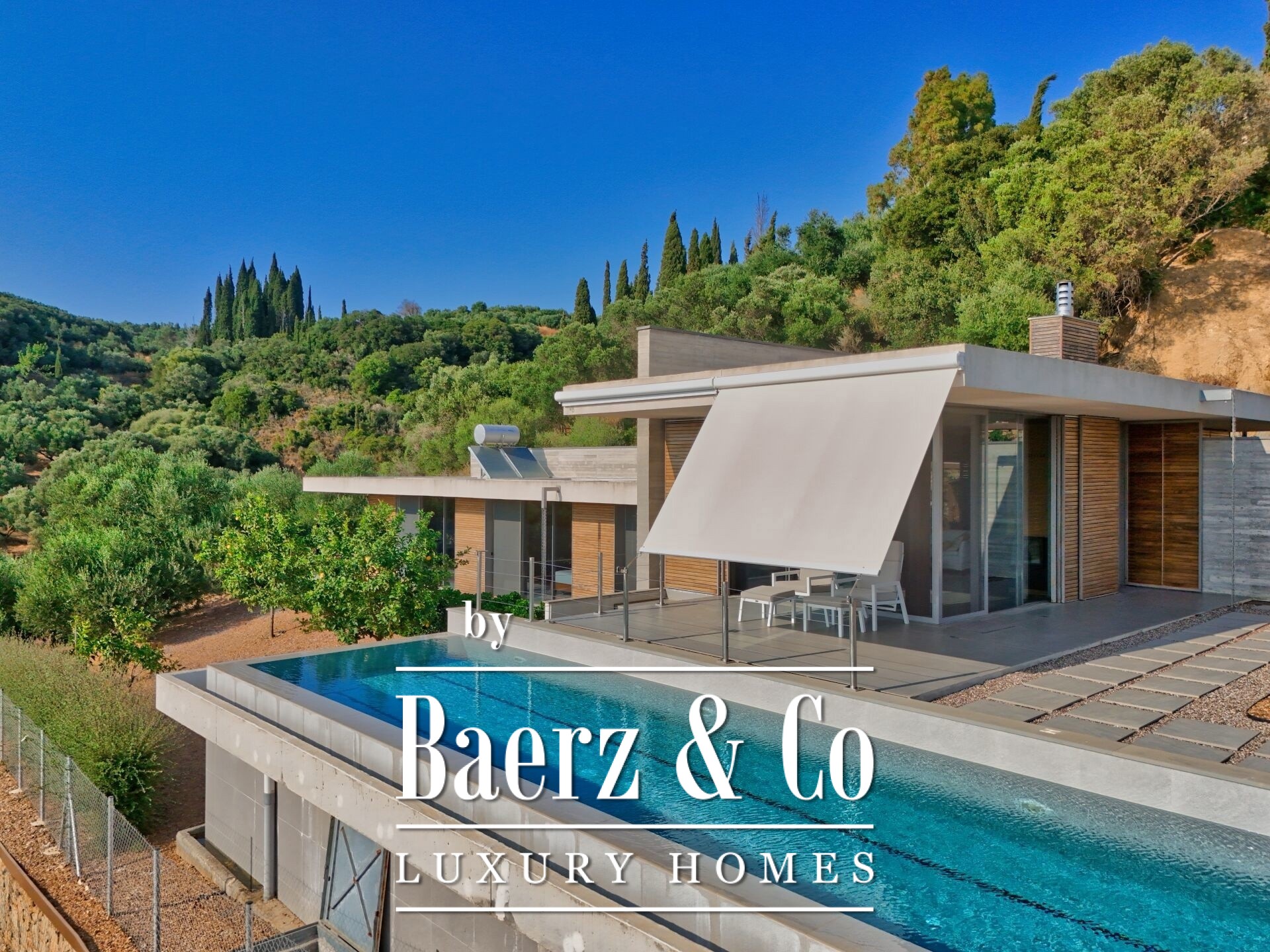 Custom lighting, exposed concrete, and meticulous finishes shape each interior space, fostering an atmosphere of calm sophistication. An outdoor kitchen with BBQ, crafted in weathered steel, borders the main kitchen, offering an inviting venue for alfresco dining with Ionian sunsets as the backdrop. Security features include a security door, CCTV surveillance, and integrated alarms, while energy-efficient structural elements and systems—such as underfloor heating, heat pump, and full insulation—underscore enduring comfort and sustainability.