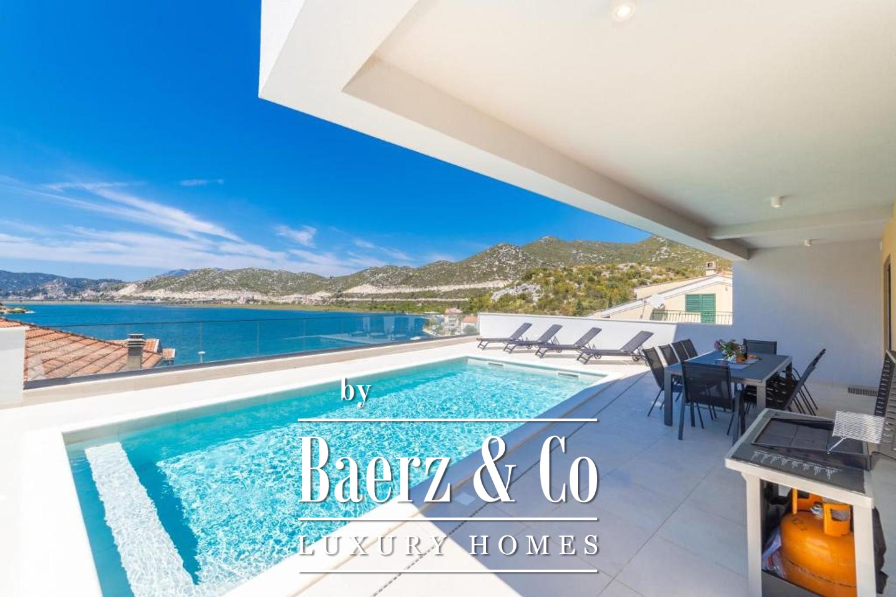 Villa Ploče stands in the serene enclave of Rogotin, blending modern architecture and restrained luxury across 311 m² on a generous 1,200 m² plot. This villa in Ploče presents an elevated standard of living, offering panoramic sea and bay views that anchor the experience of the place. The property unfolds over three floors. The basement, with 60 m², features an entrance, machine room and access via internal staircase. The ground floor, at 156 m², comprises a kitchen, dining area, and spacious living room, complemented by a bedroom, bathroom, discrete guest toilet, corridor and both covered and uncovered terraces. This level provides direct access to a secluded swimming pool, designed for quiet relaxation and privacy.